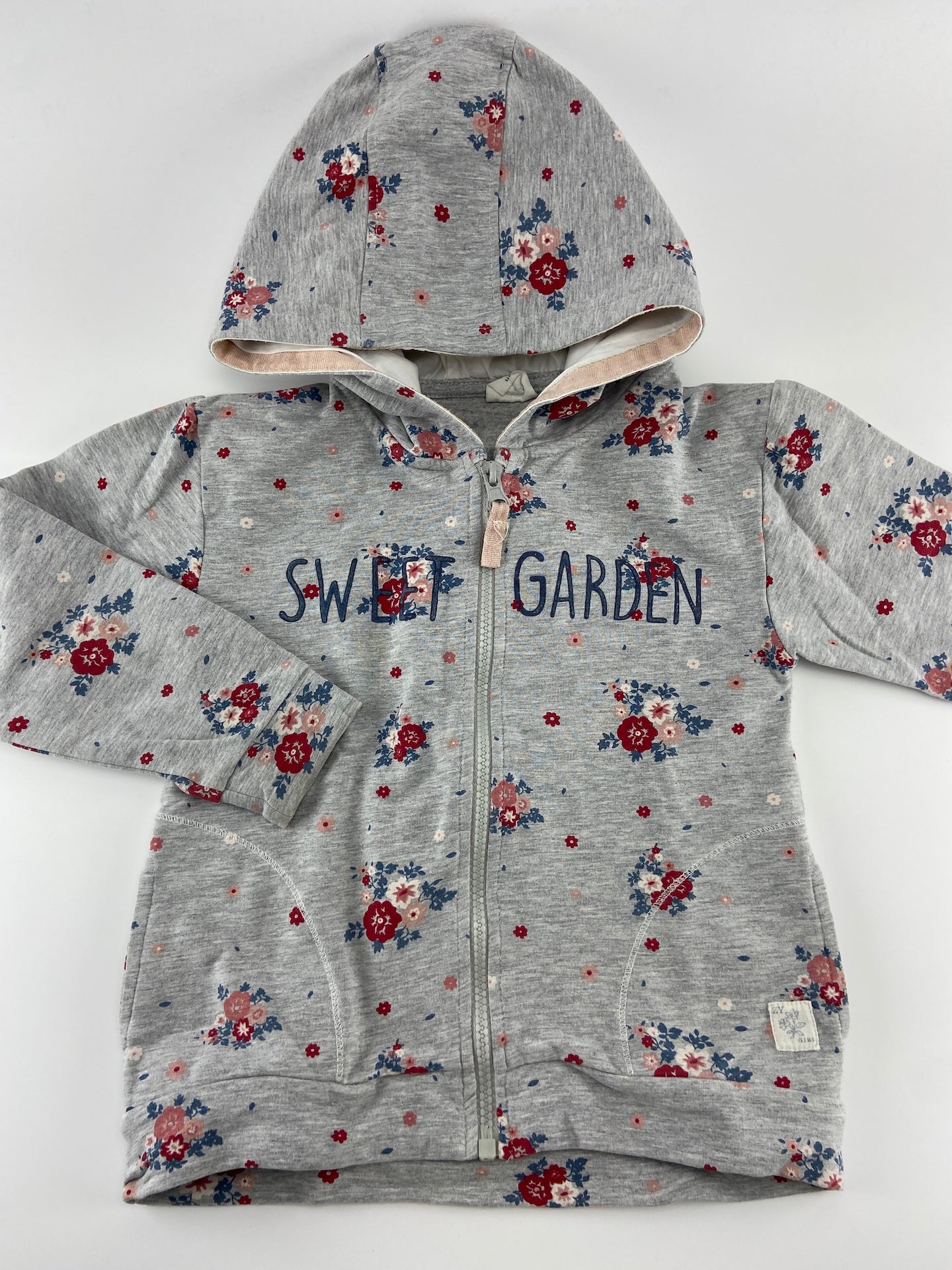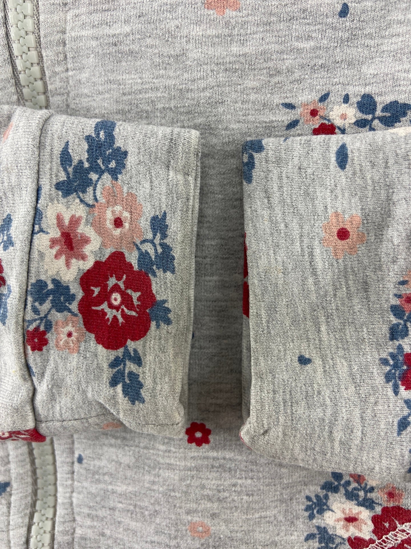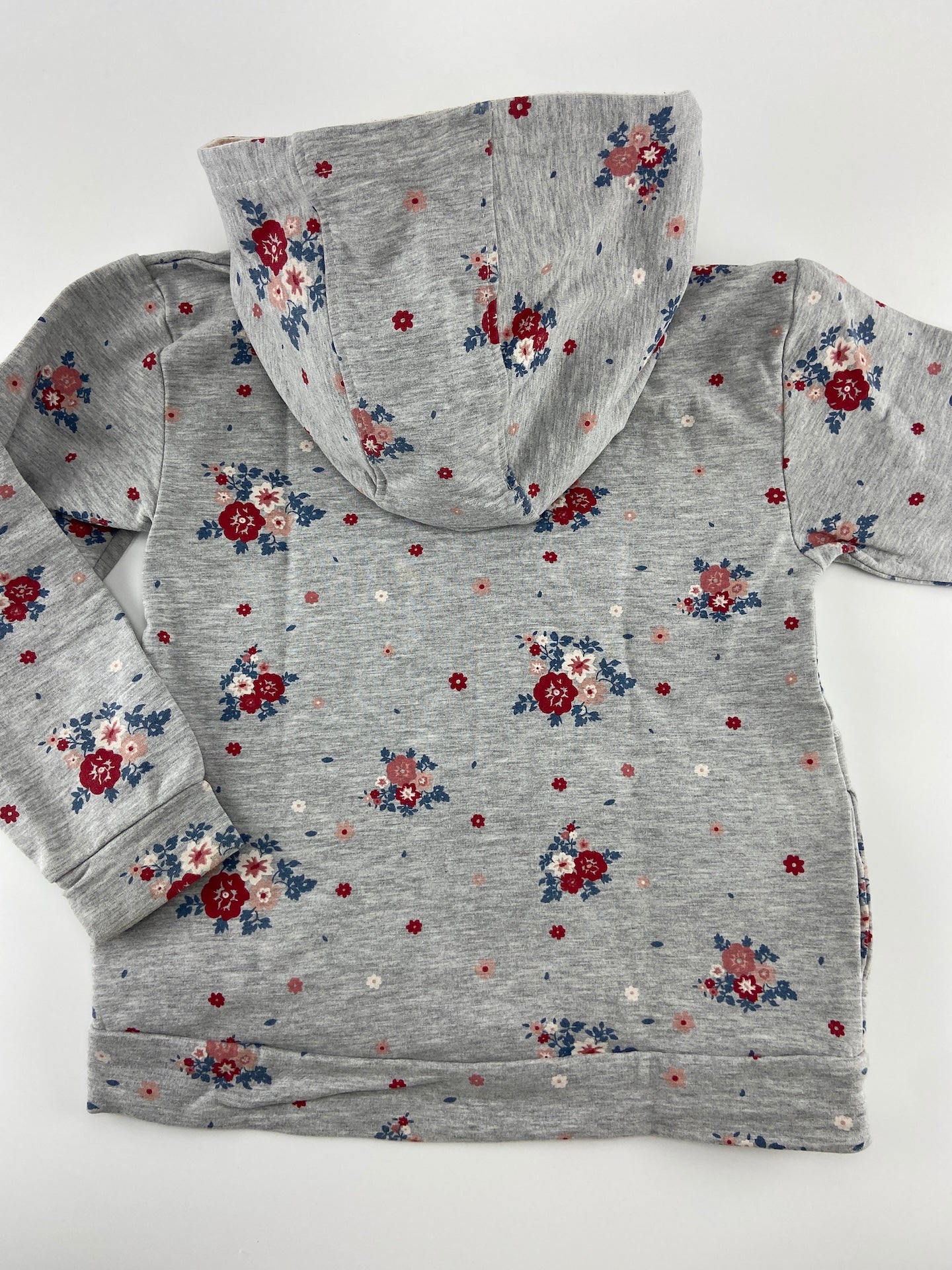 Casaco de capuz e fecho. Com estampado de flores e capuz forrado.