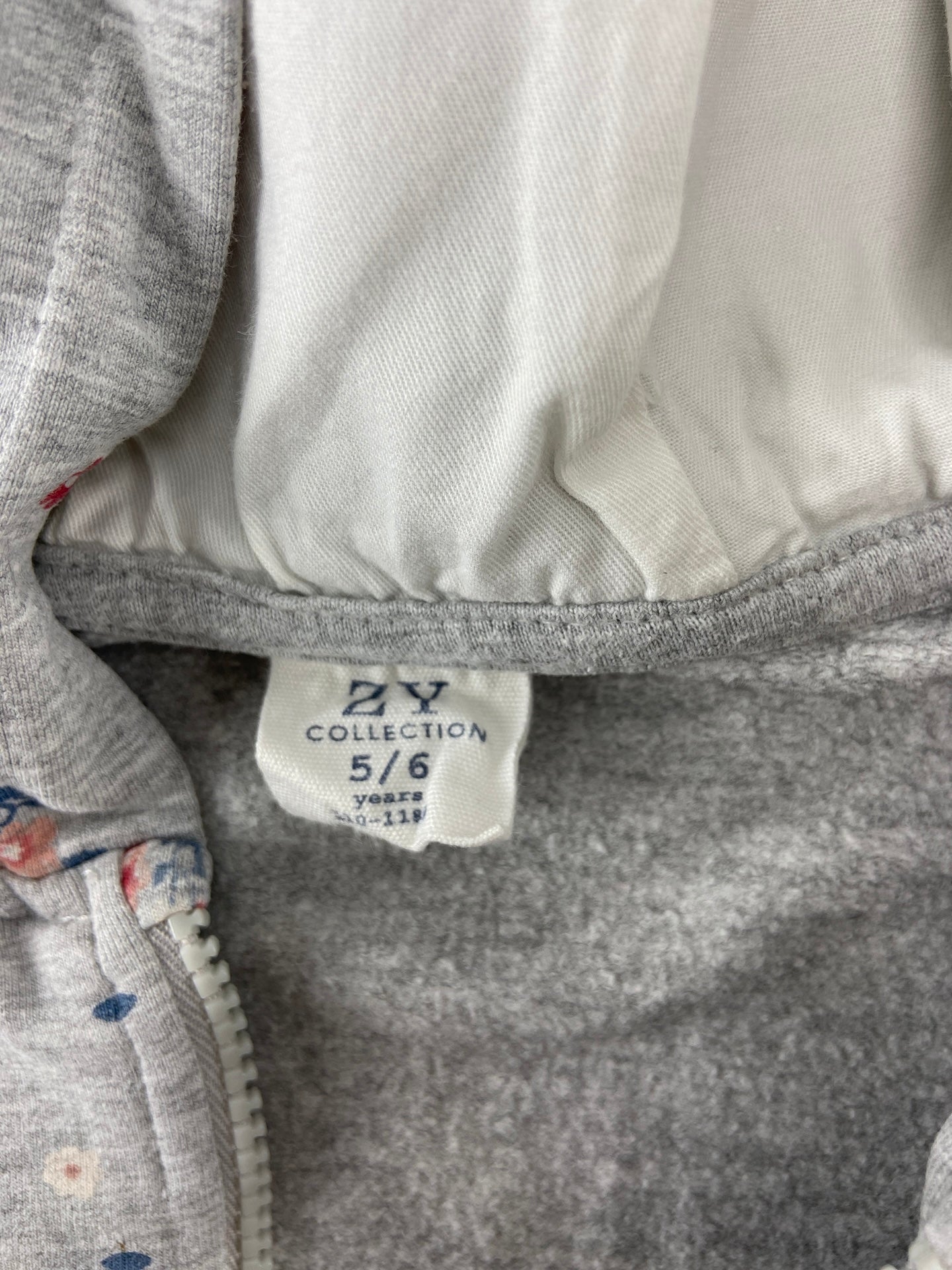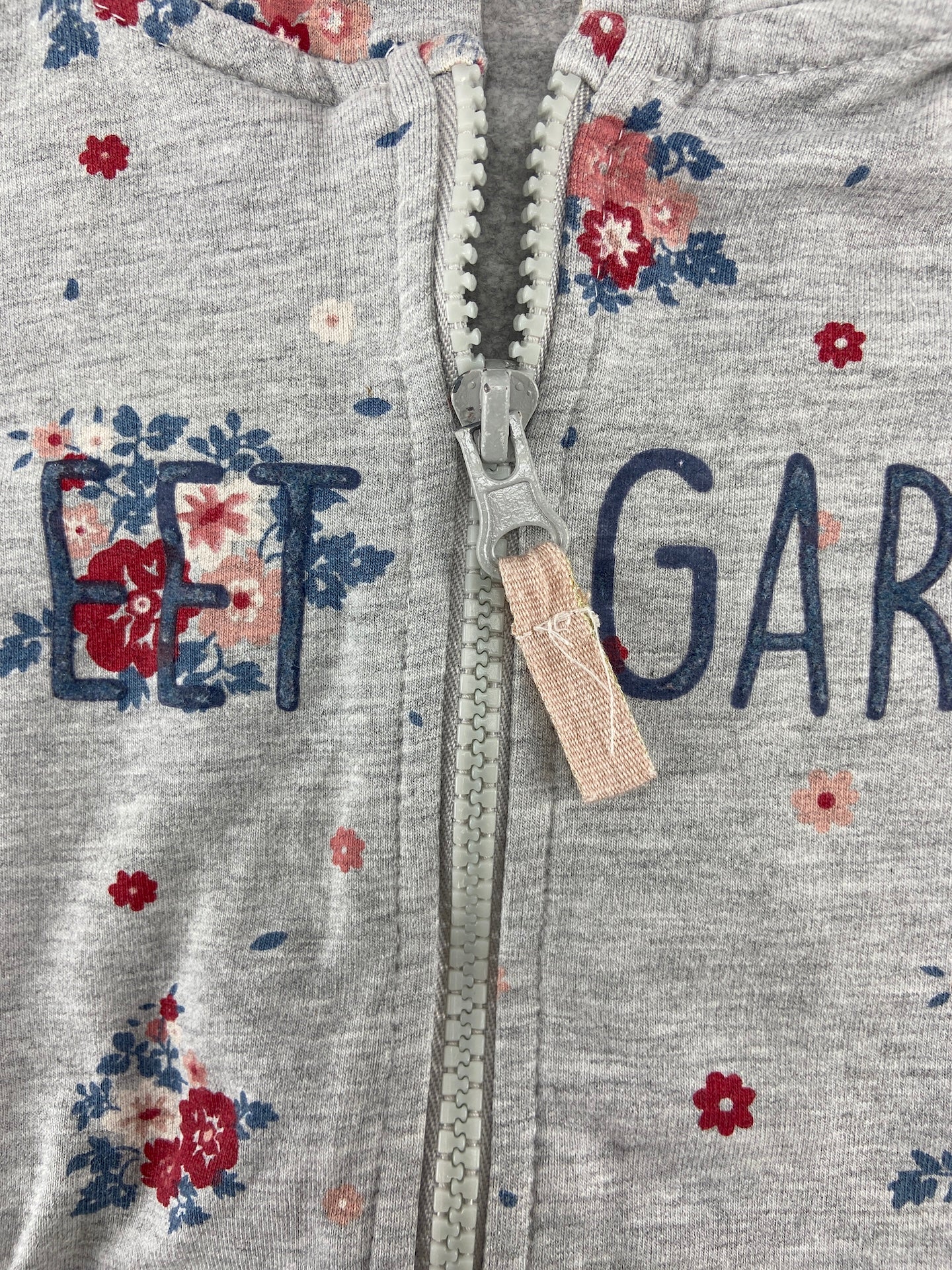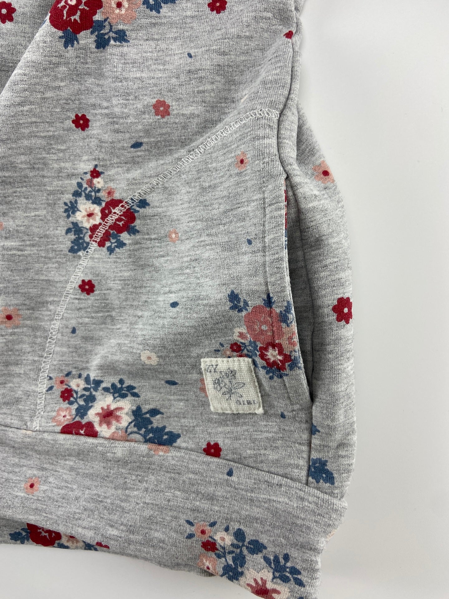 Casaco de capuz e fecho. Com estampado de flores e capuz forrado.