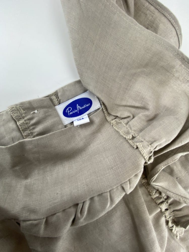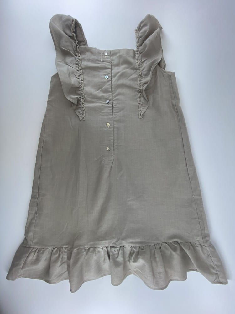 Vestido de linho com forro. Com folha nas mangas e na bainha. De abotoar atrás.