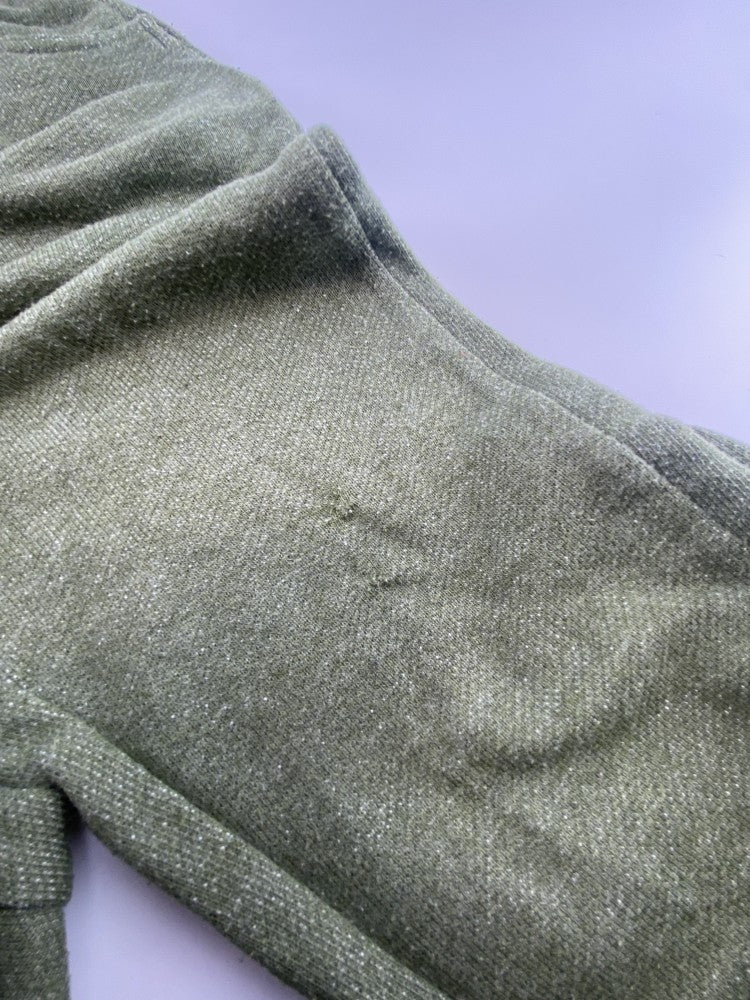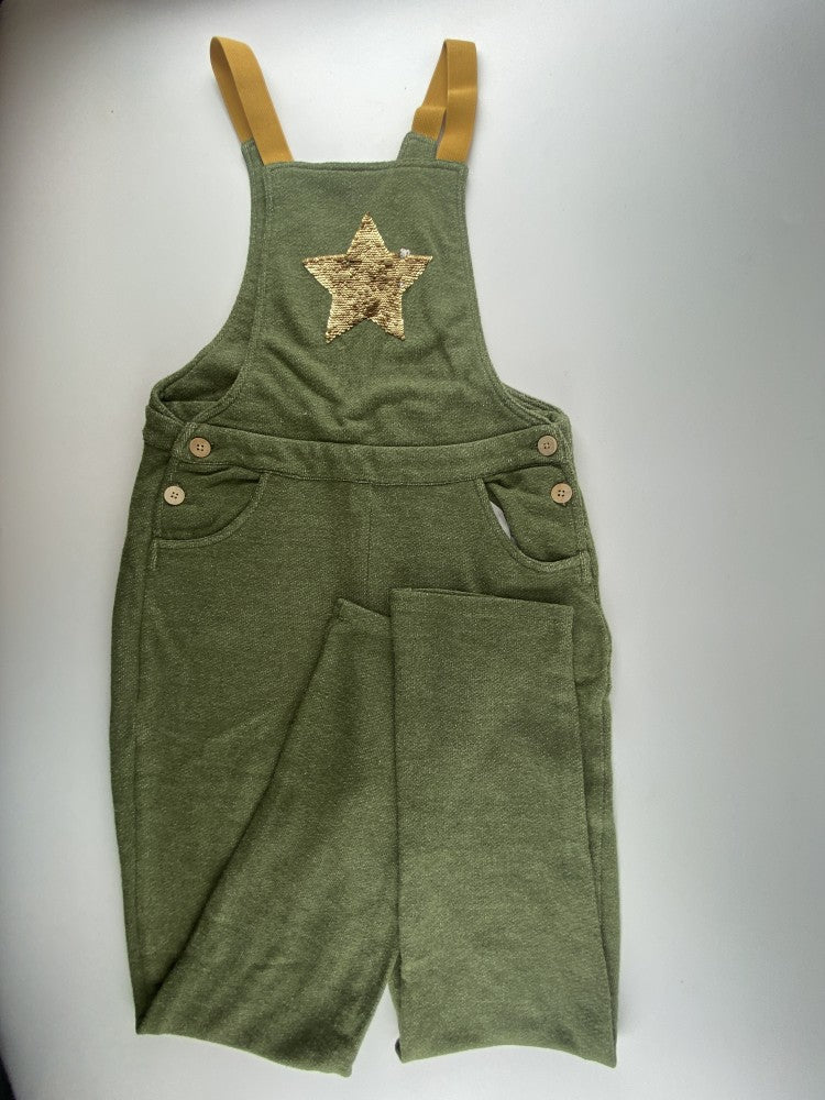 Calças jardineiras em moletão com aplicação de lantejoulas reversíveis no peito.