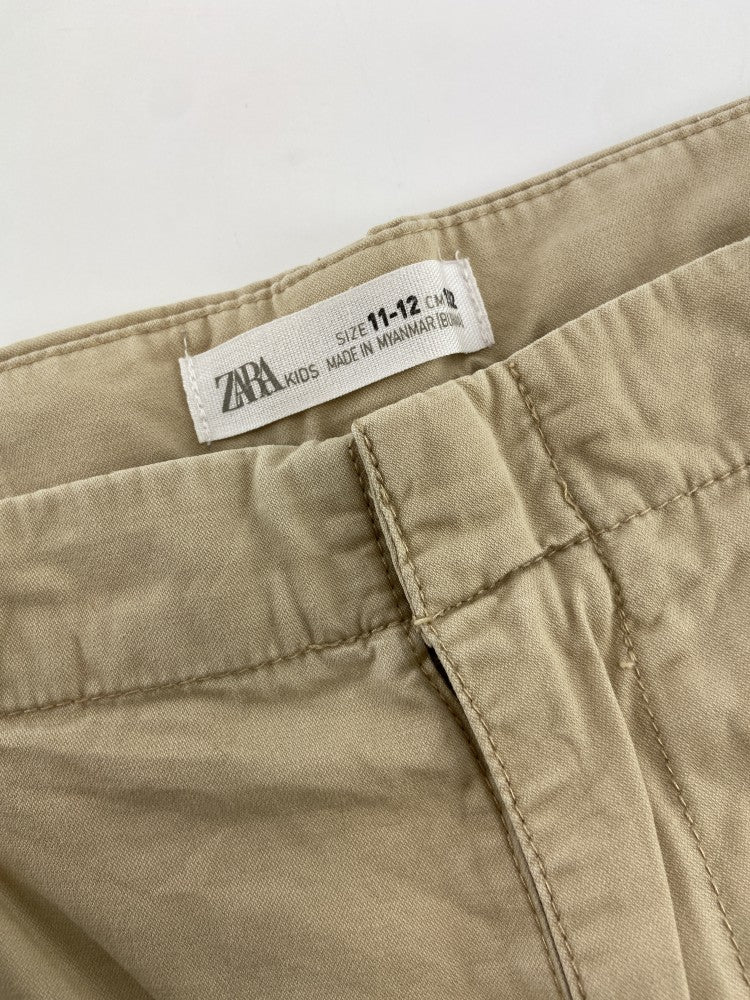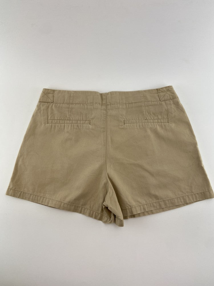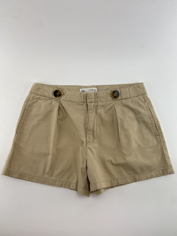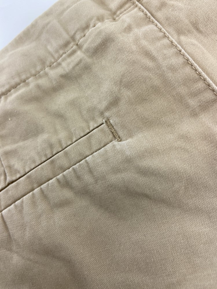 Calções me sarja com duas pregas na frente e dois botões grande no cós.