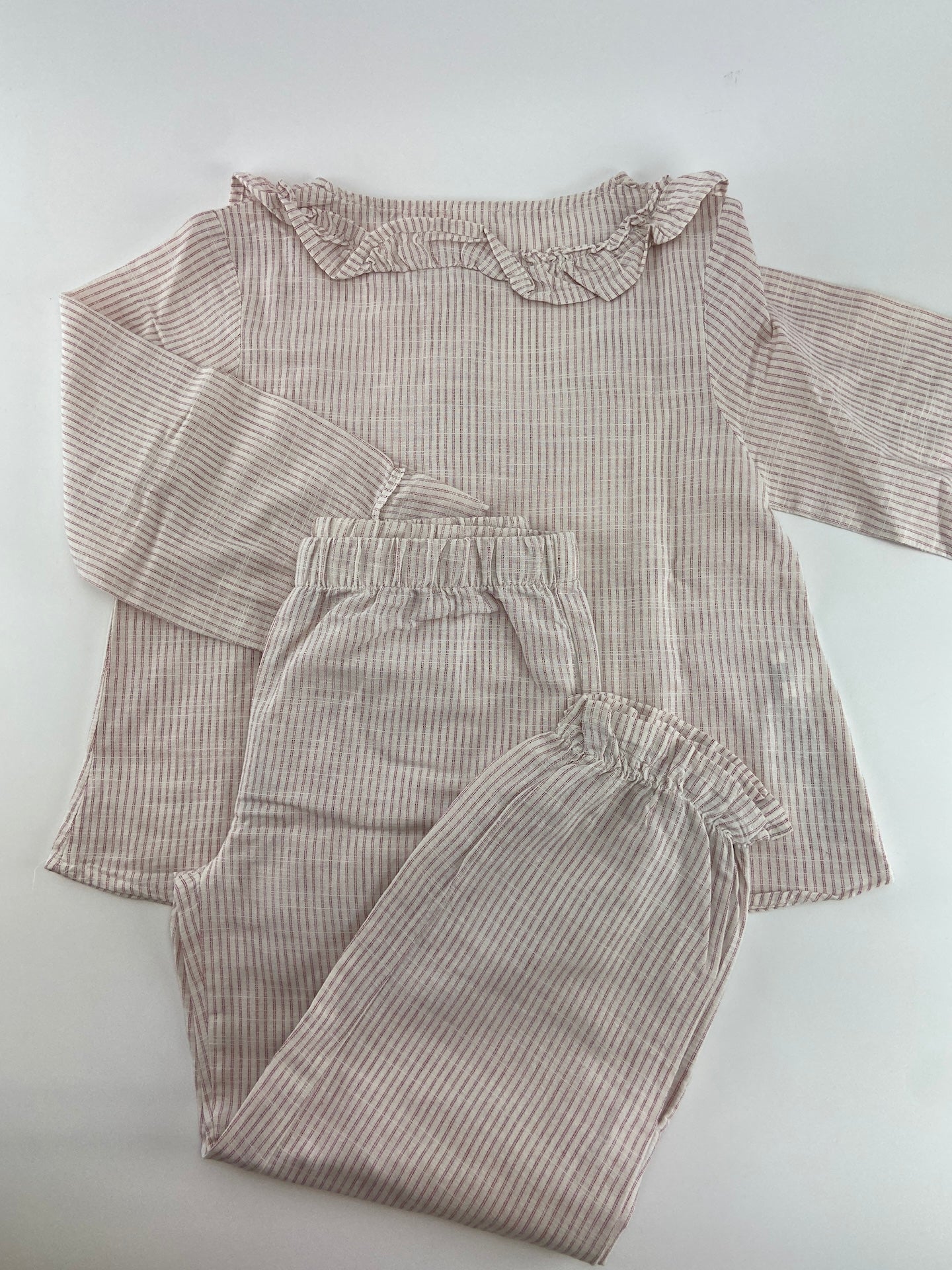 Pijama em linho com padrão de riscas com folho no peito.