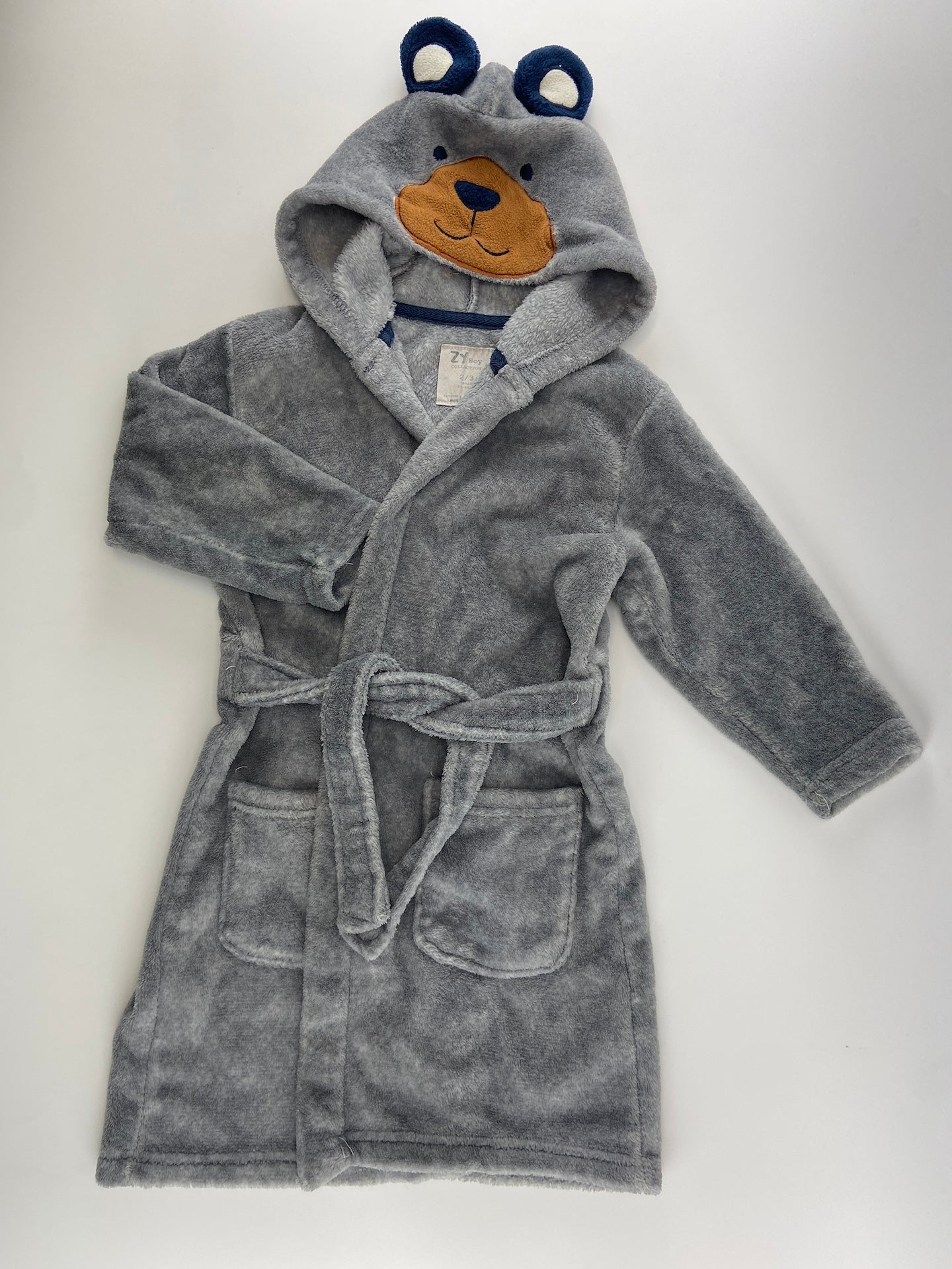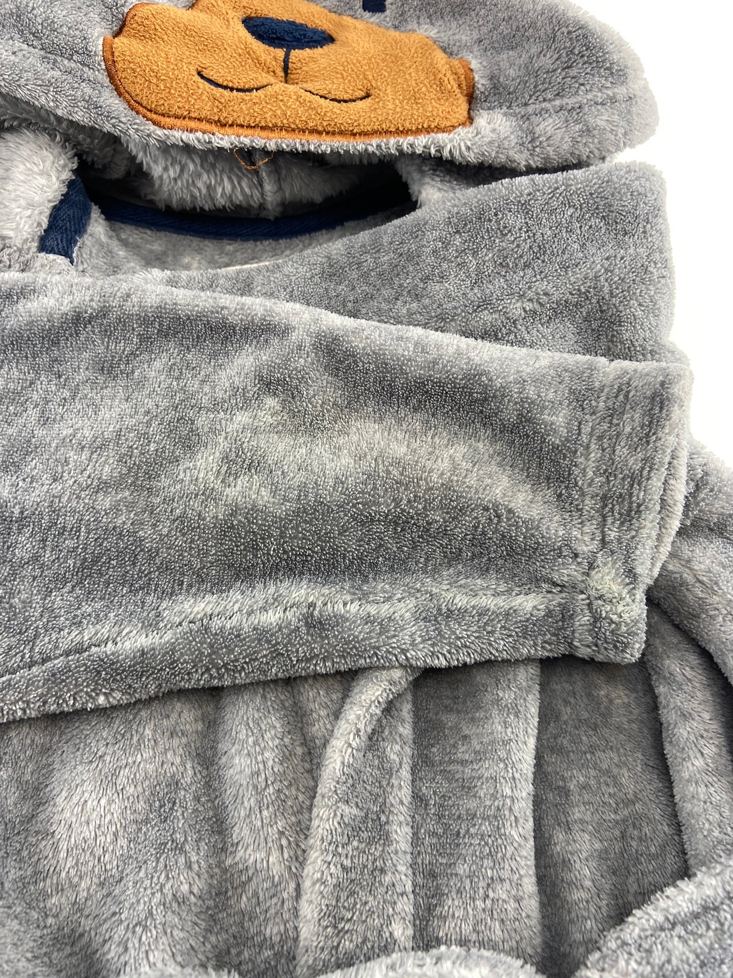 Roupão polar com bolsos e cinto. Capuz com orelhas e focinho de urso.