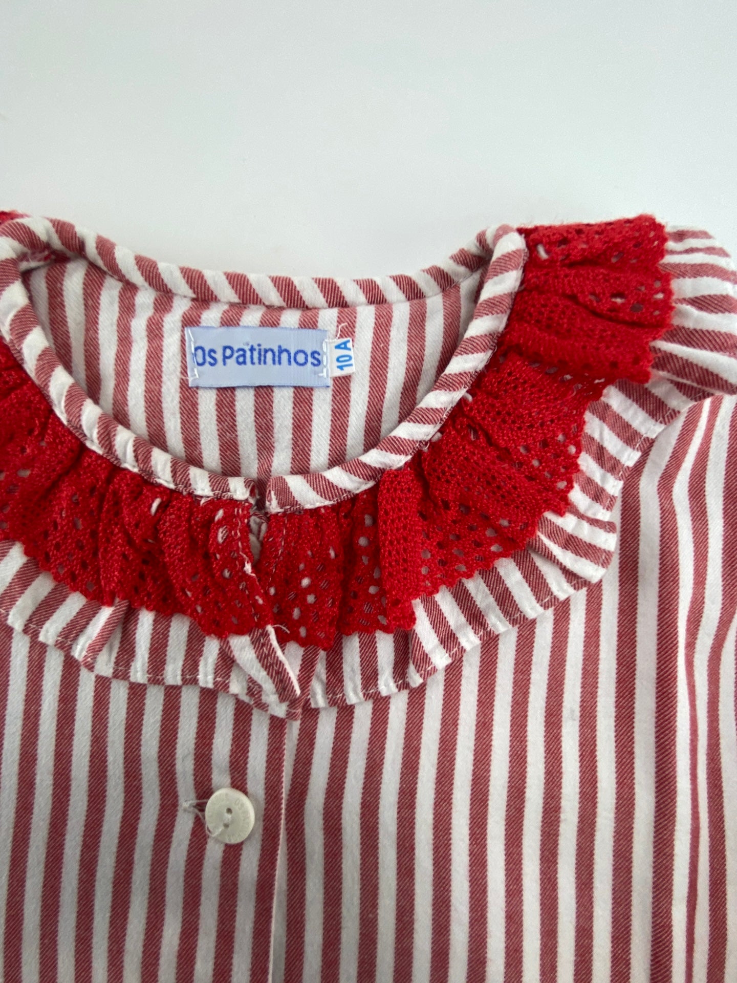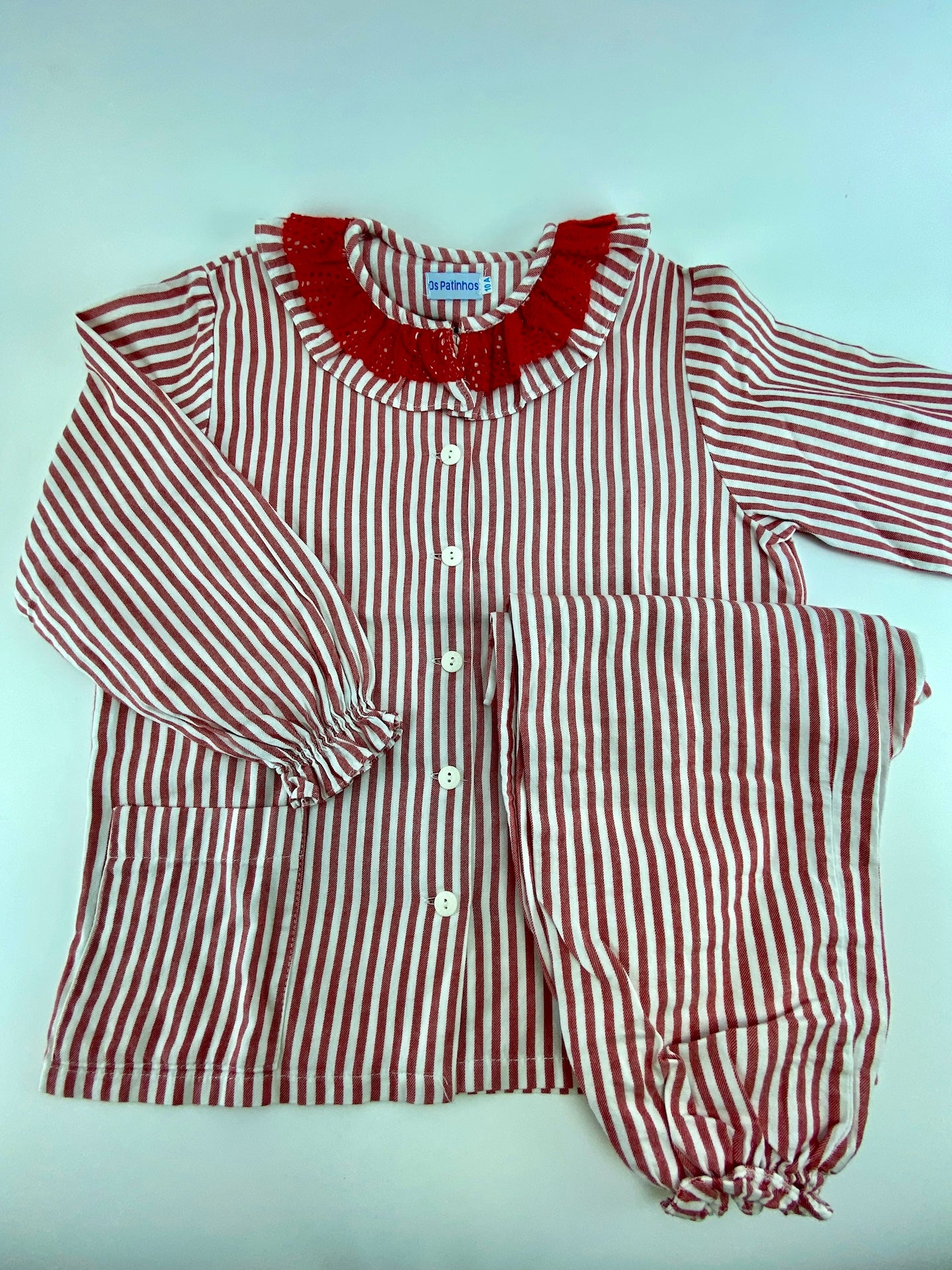 Pijama com padrão de riscas. Com gola de folho dupla com aplicação de crochet.