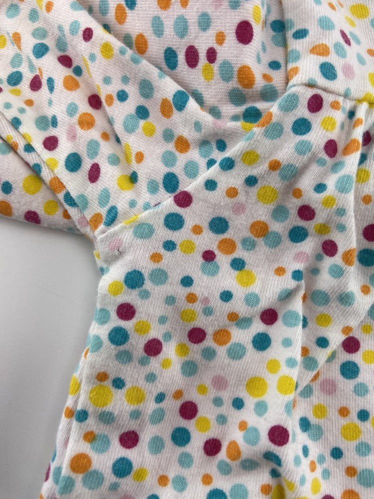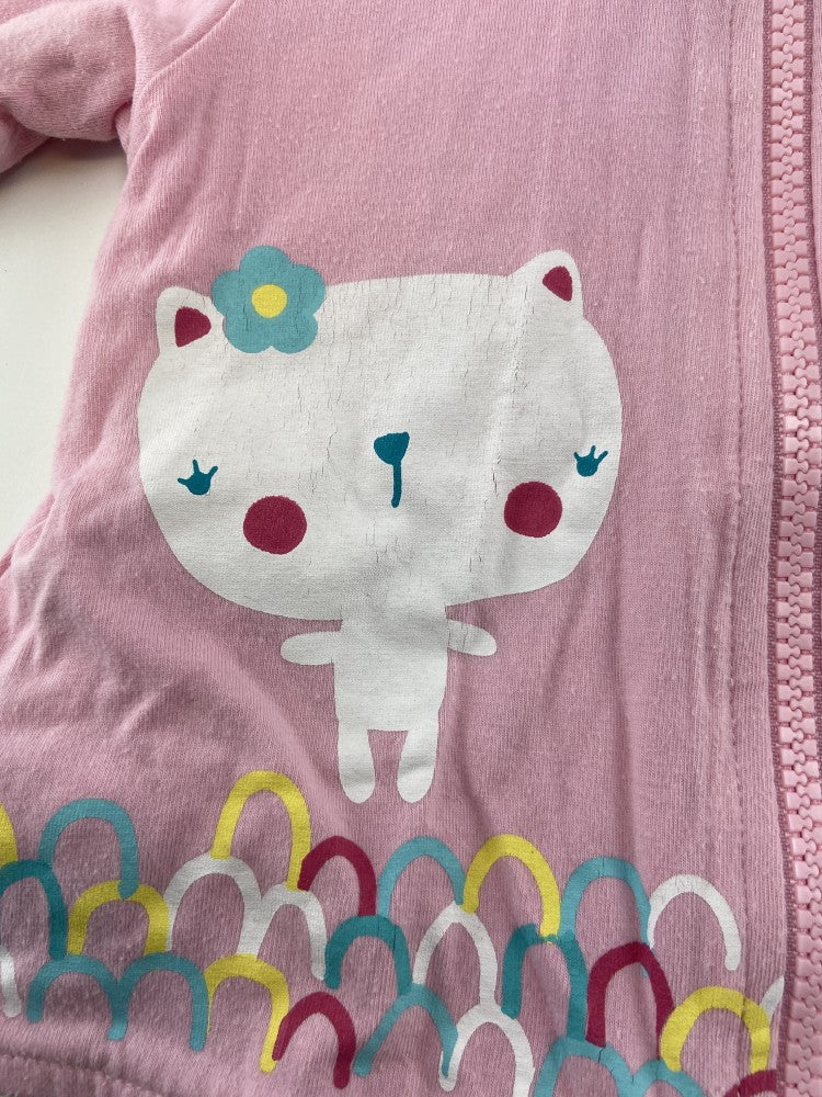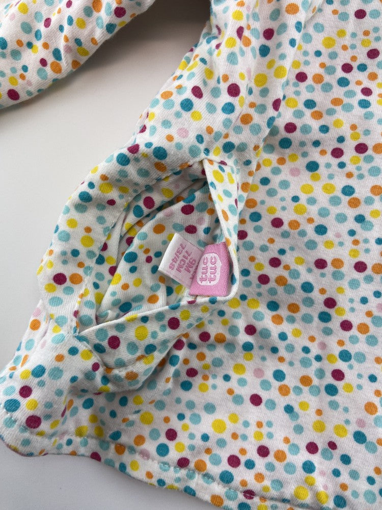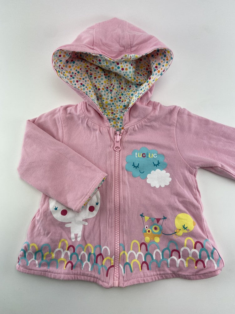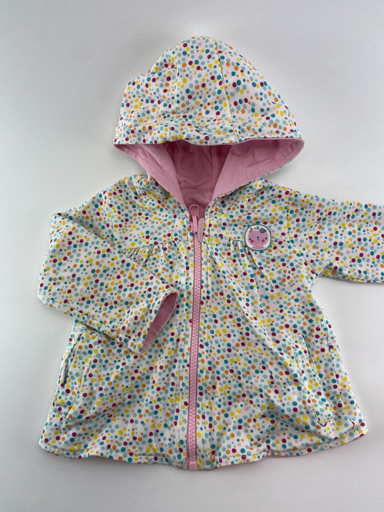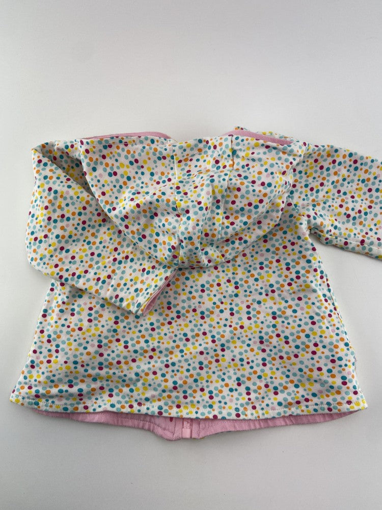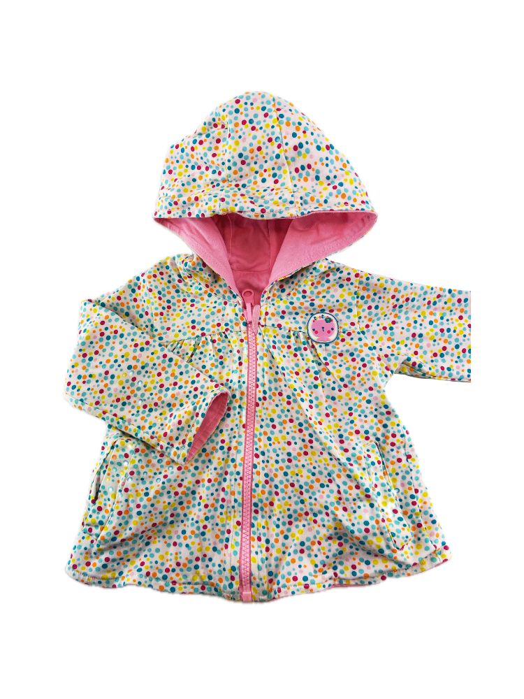 Casaco reversível de capuz com fecho. De um lado com padrão de bolinhas, do outro com ilustração estampada.