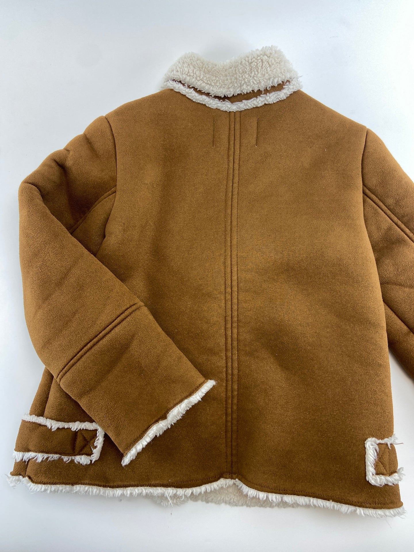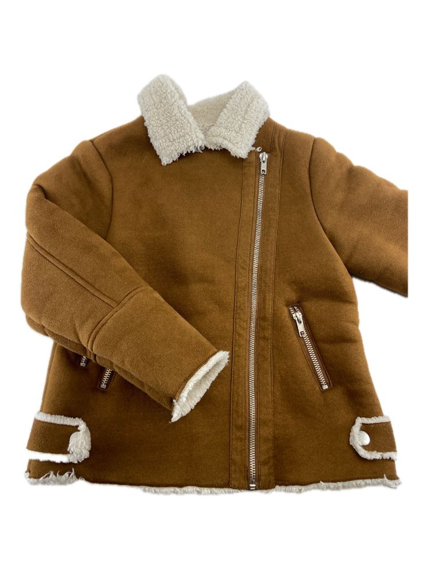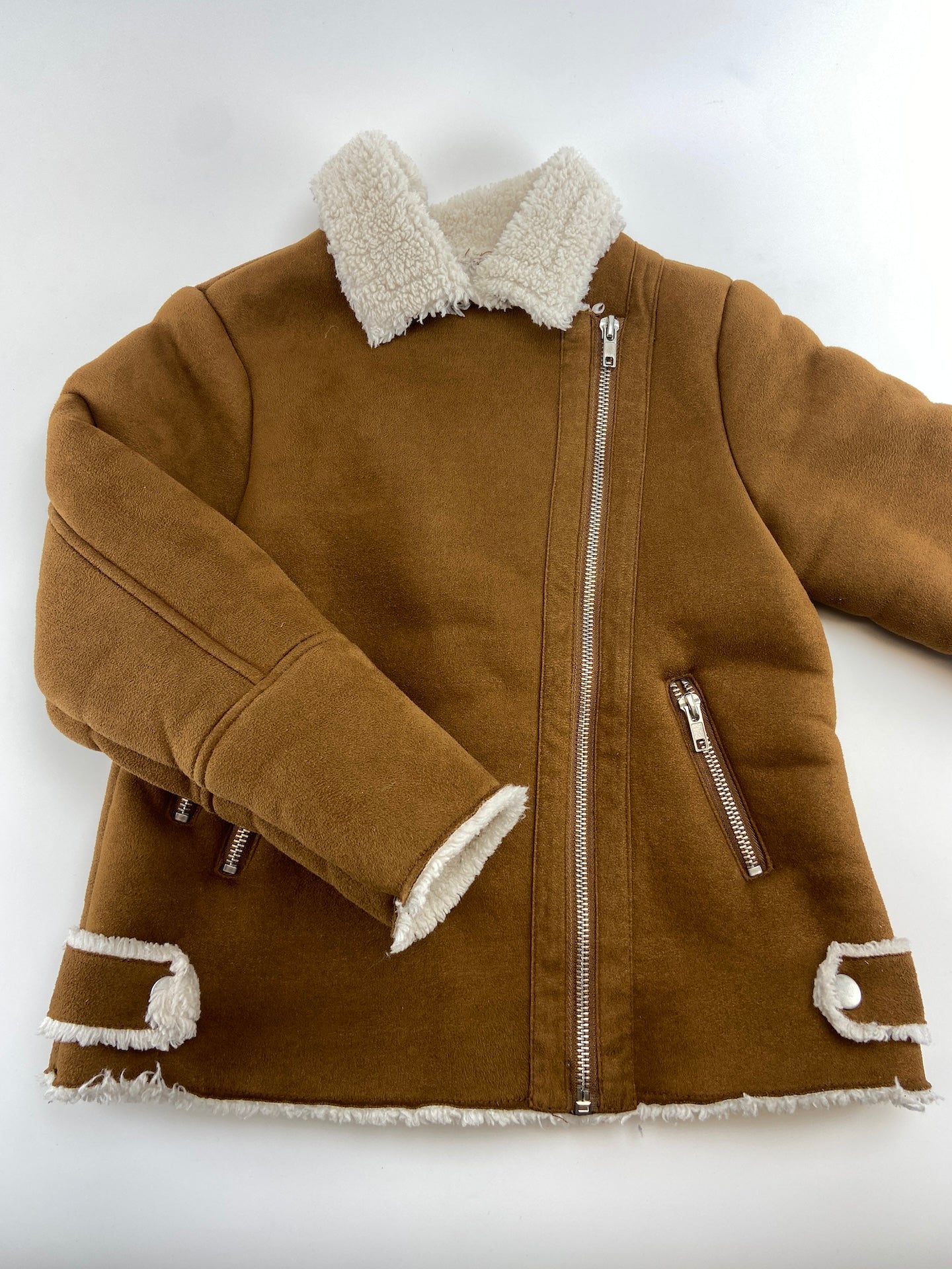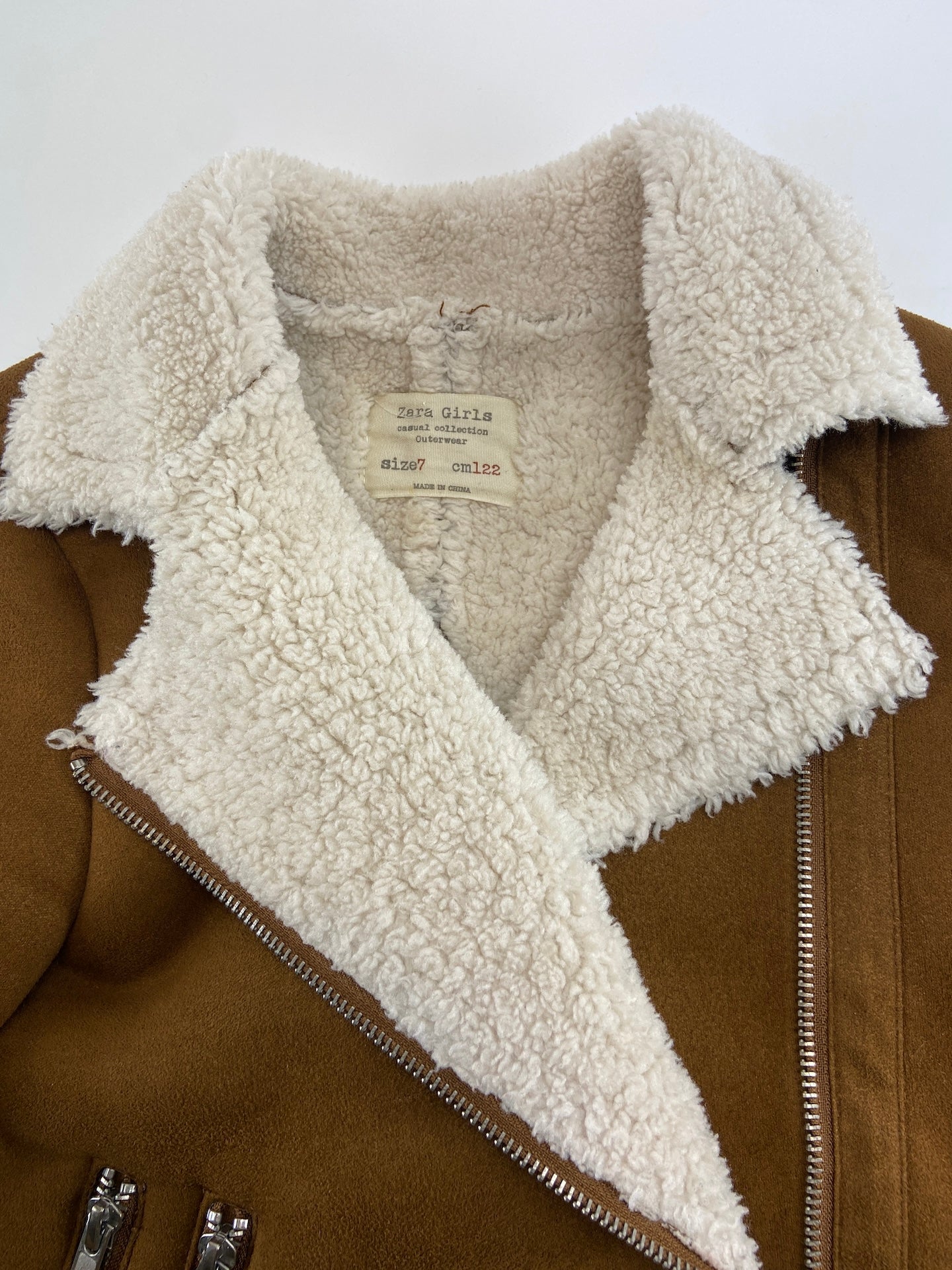 Blusão tipo camursa forrado a sherpa. Com fecho e bolsos na frente.
