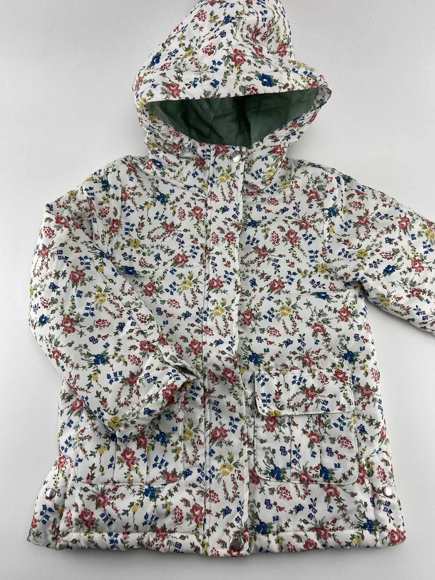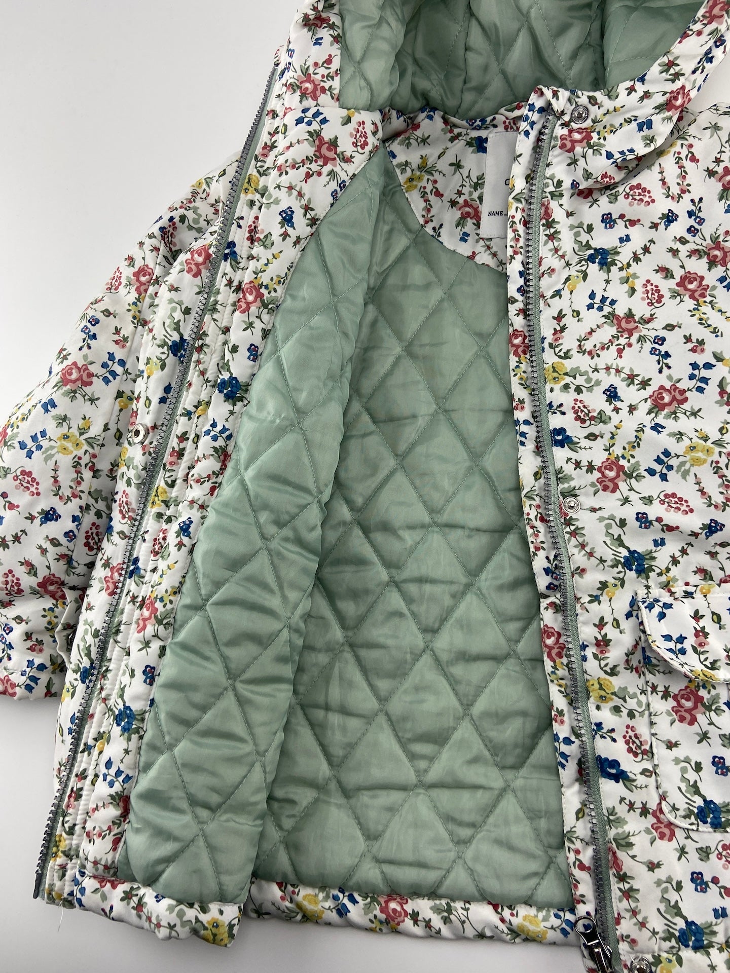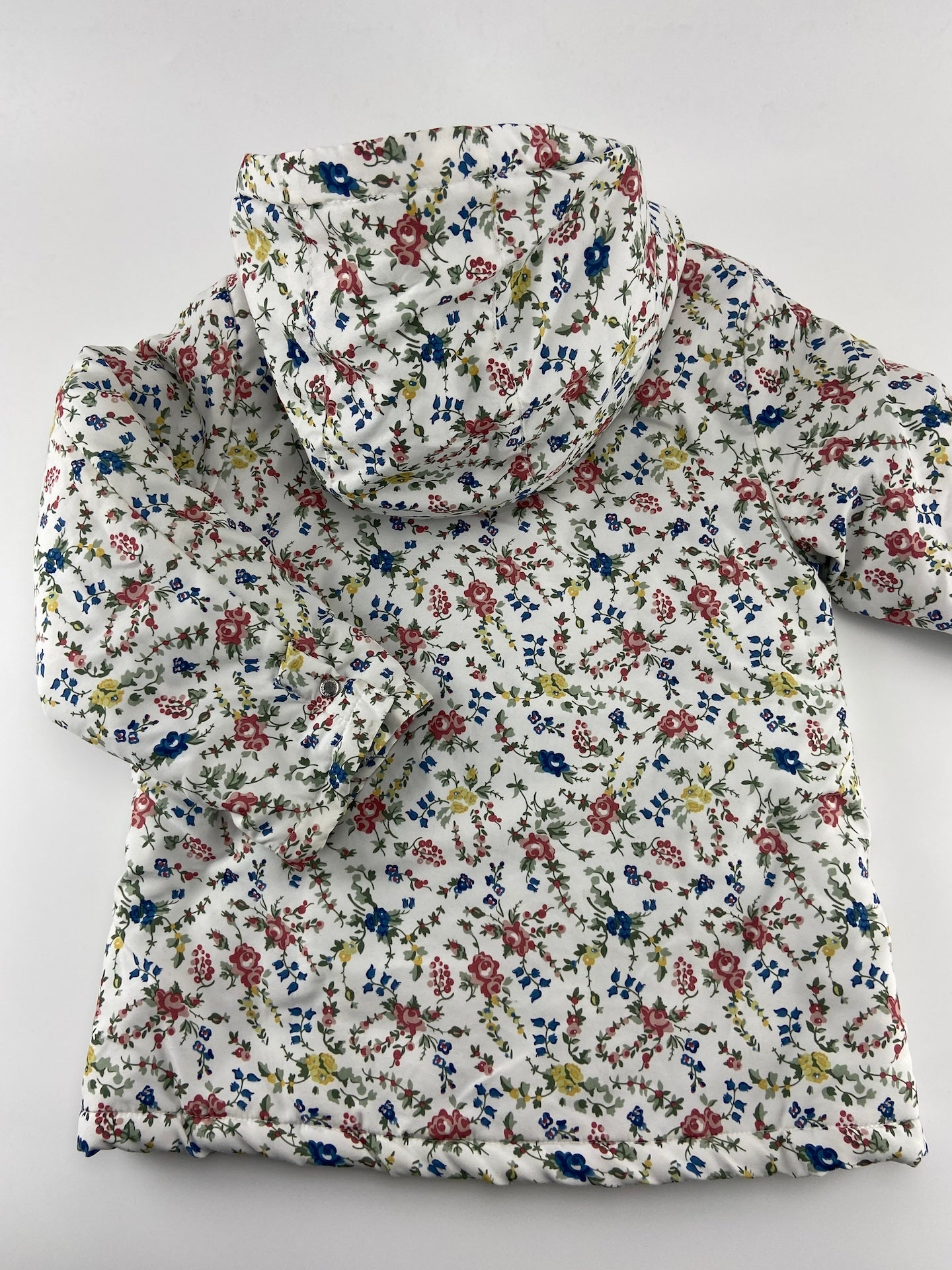 Blusão com capuz, com fecho eclair e botões de mola. Padrão florido.