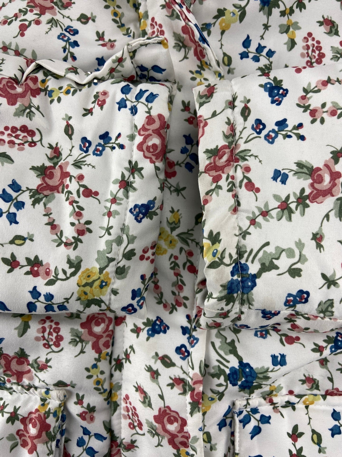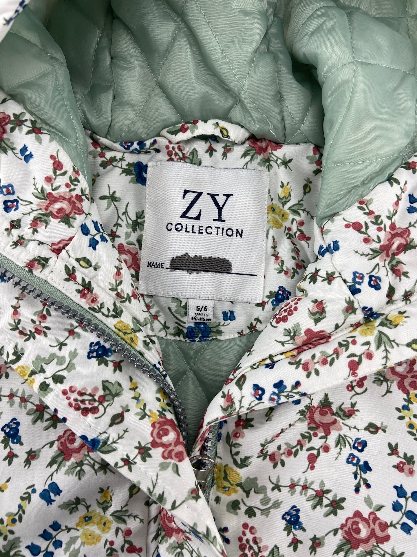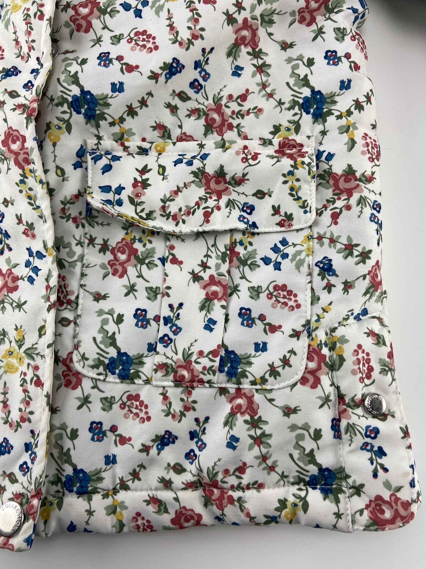 Blusão com capuz, com fecho eclair e botões de mola. Padrão florido.