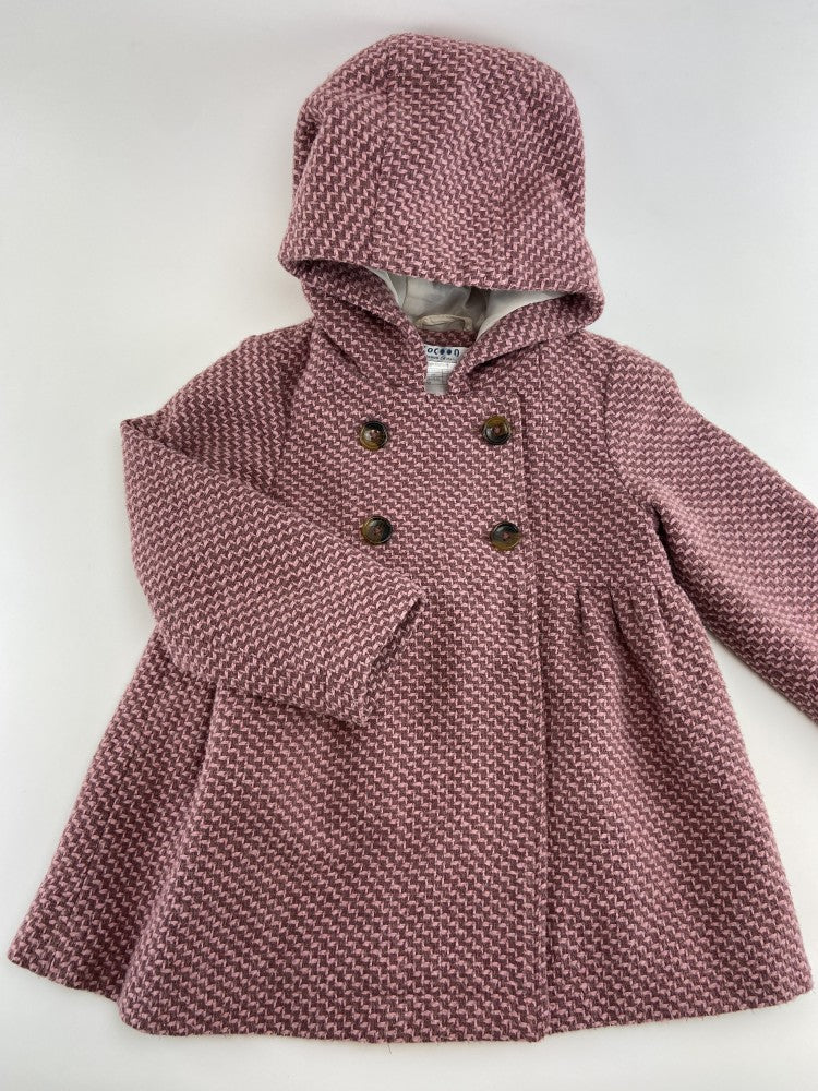 Casaco de abafo em fazenda forrado com capuz. Com padrão geométrico texturado e laço nas costas.