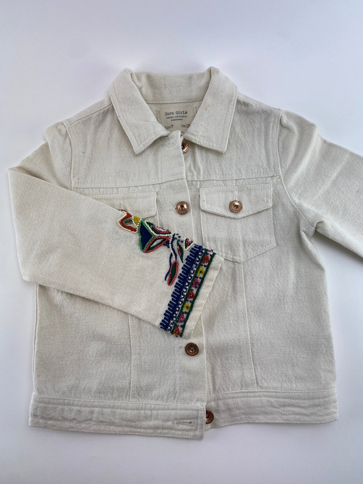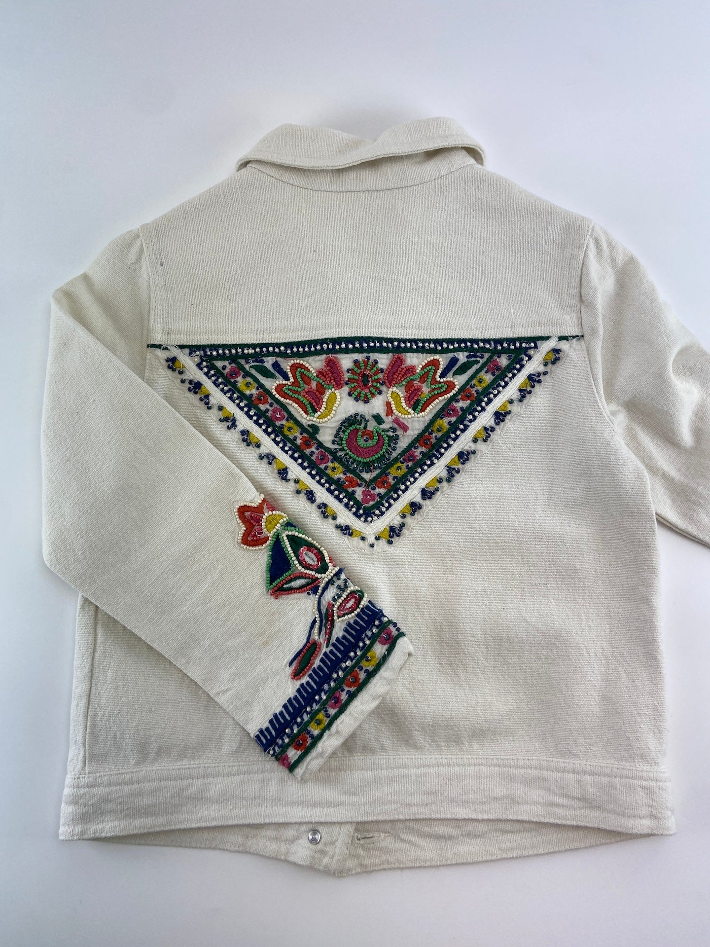 Blusão em sarja com bordados e aplicação de missangas.