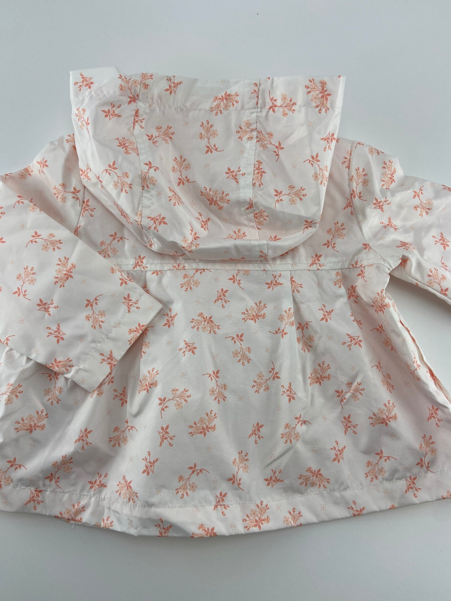 Gabardina/parka impermeável com capuz e flores estamapadas.