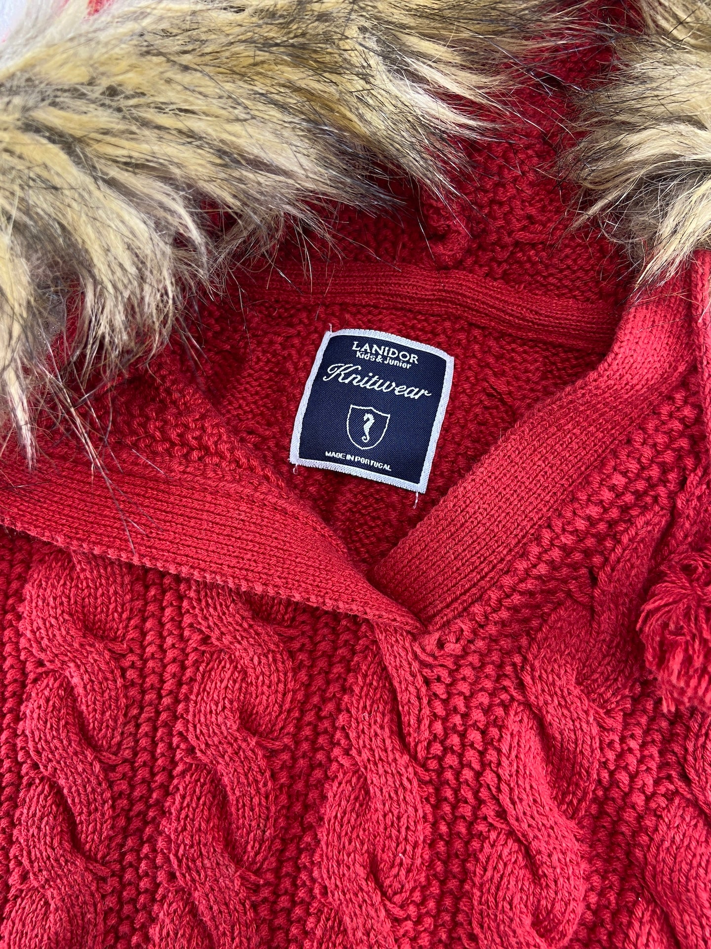 Poncho entrançado. Com capuz adornado com pelo.Tamanho aproximado.
