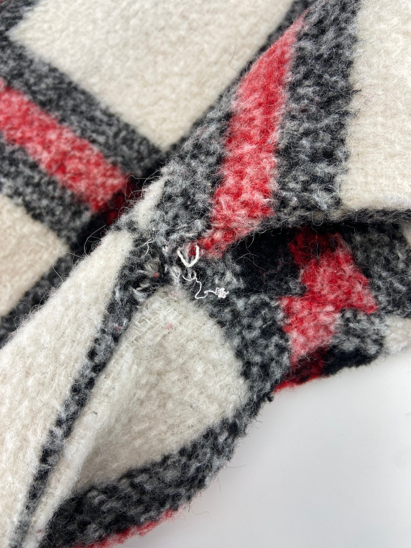 Muitos borbotos e está descosido por baixo de uma das mangas.