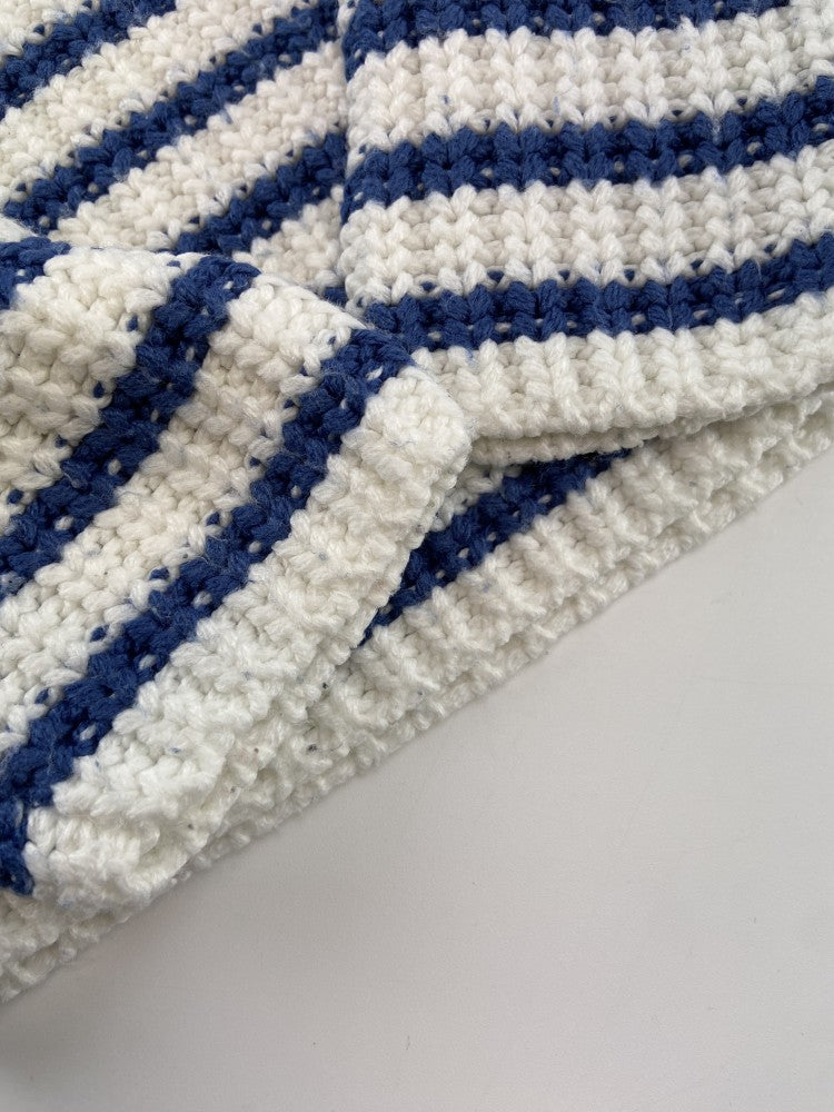 Camisola em malha sintética grossa, com botões no ombro e padrão de riscas.