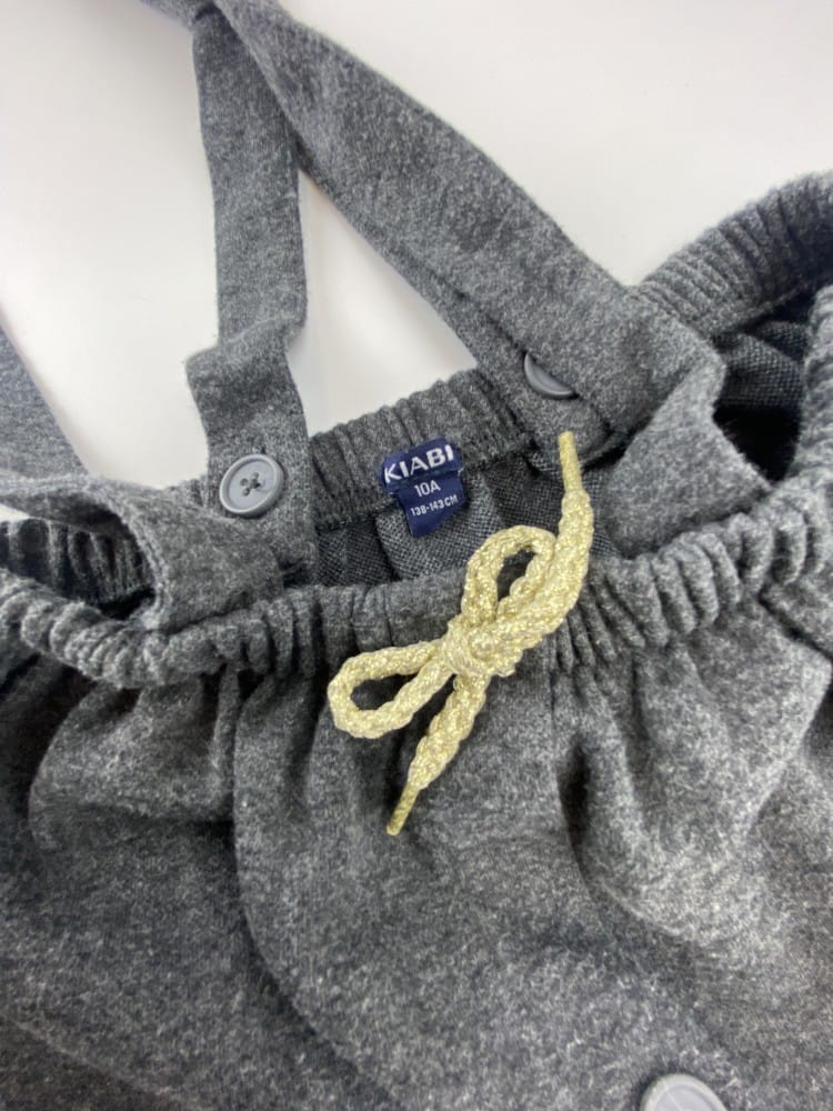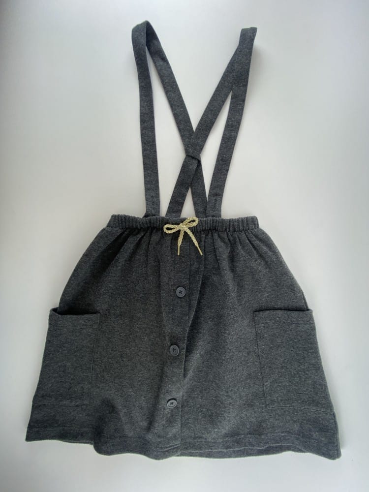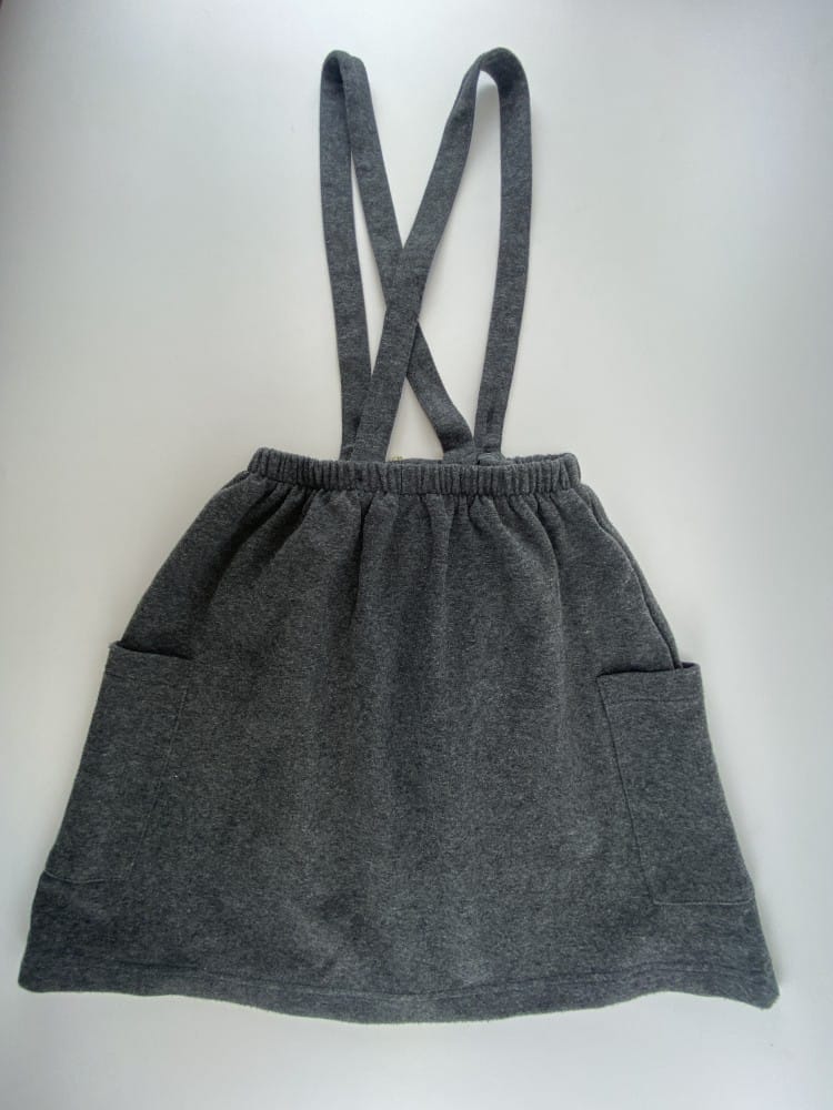 Saia em moletão com alças e elástico na cintura. Bolsos exteriores e botões fingidos na frente.