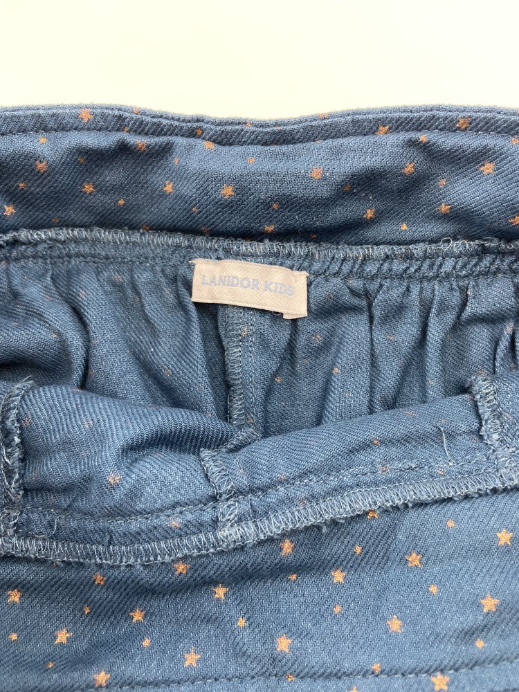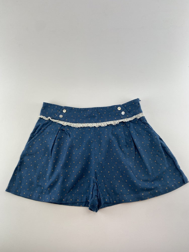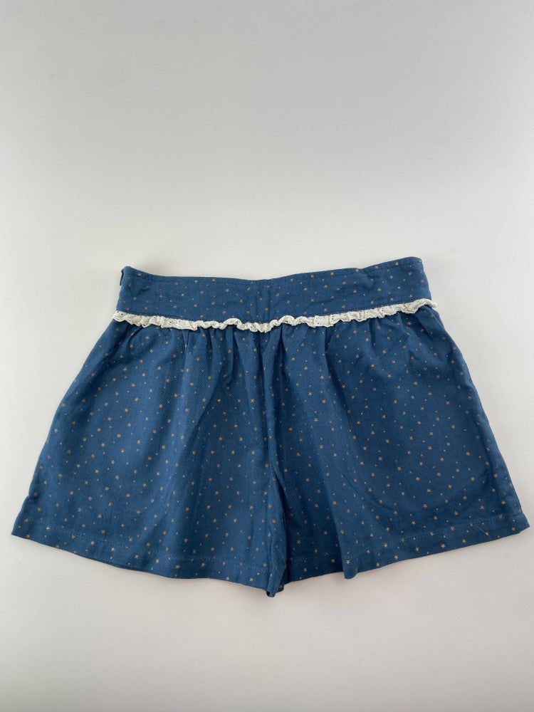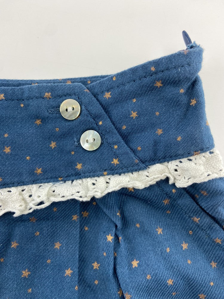 Calções em vaiela com duas pregas na frente e folho na cintura. Padrão de estrelas douradas. Com elástico de ajuste na cintura.
