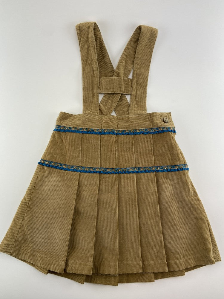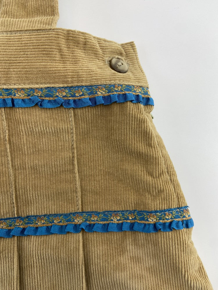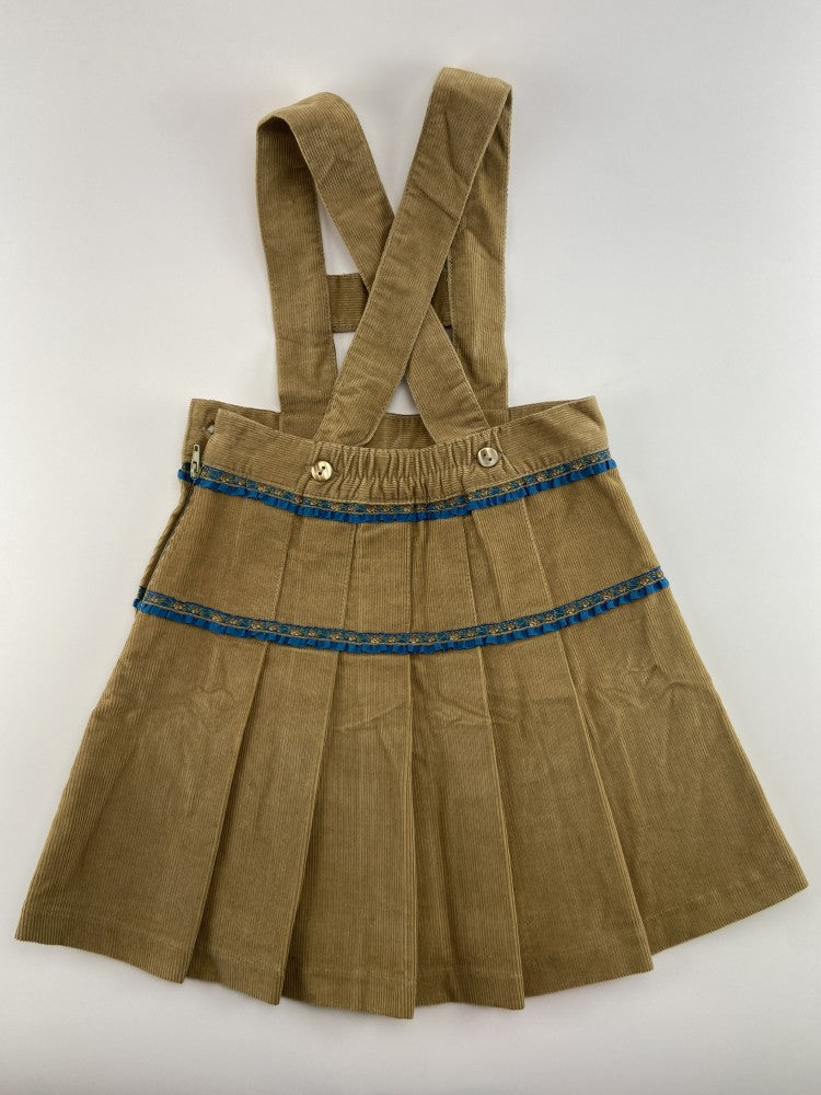 Saia de pregas em bombazine com aplicação de fita bordada com folhinho.