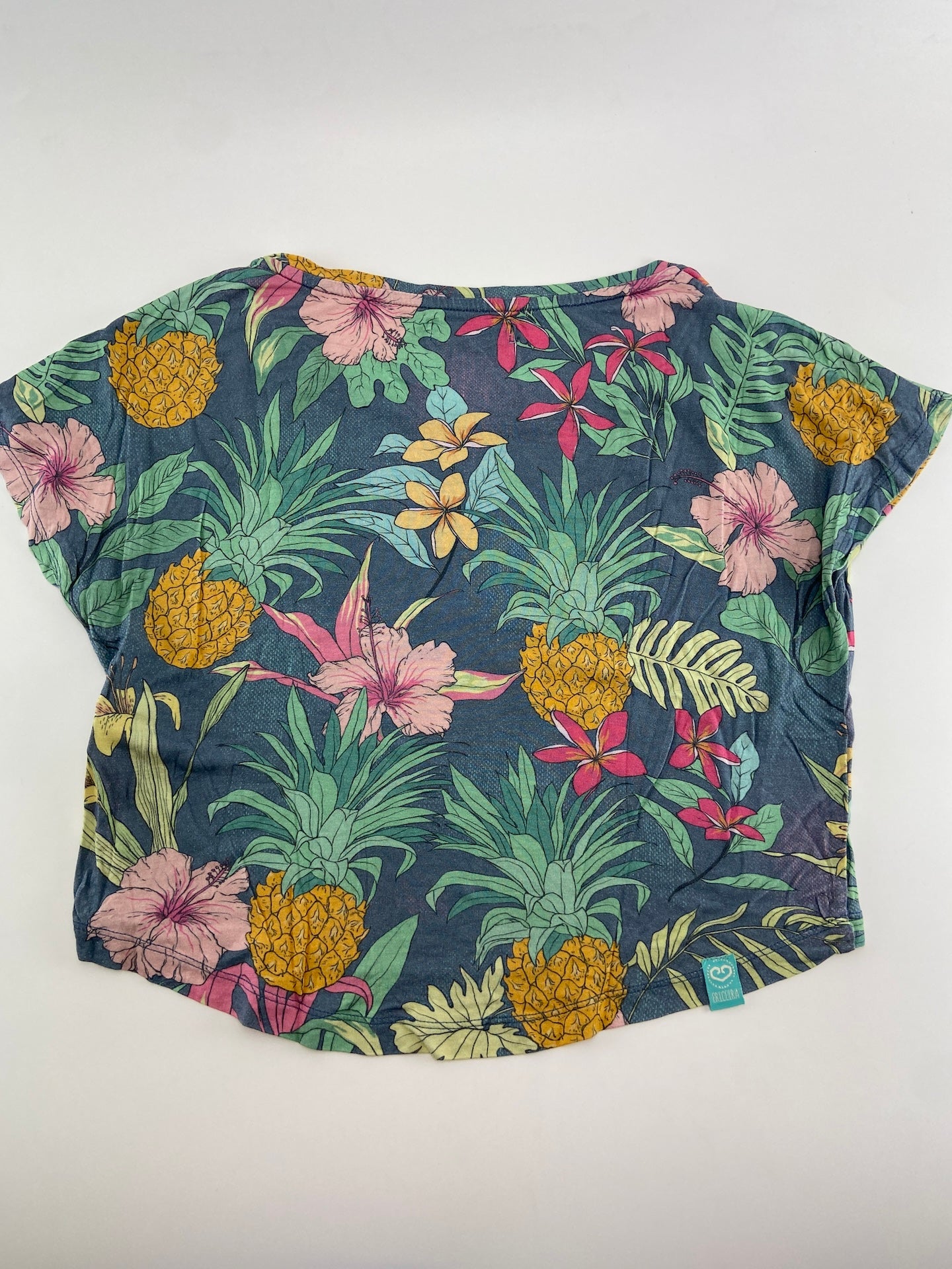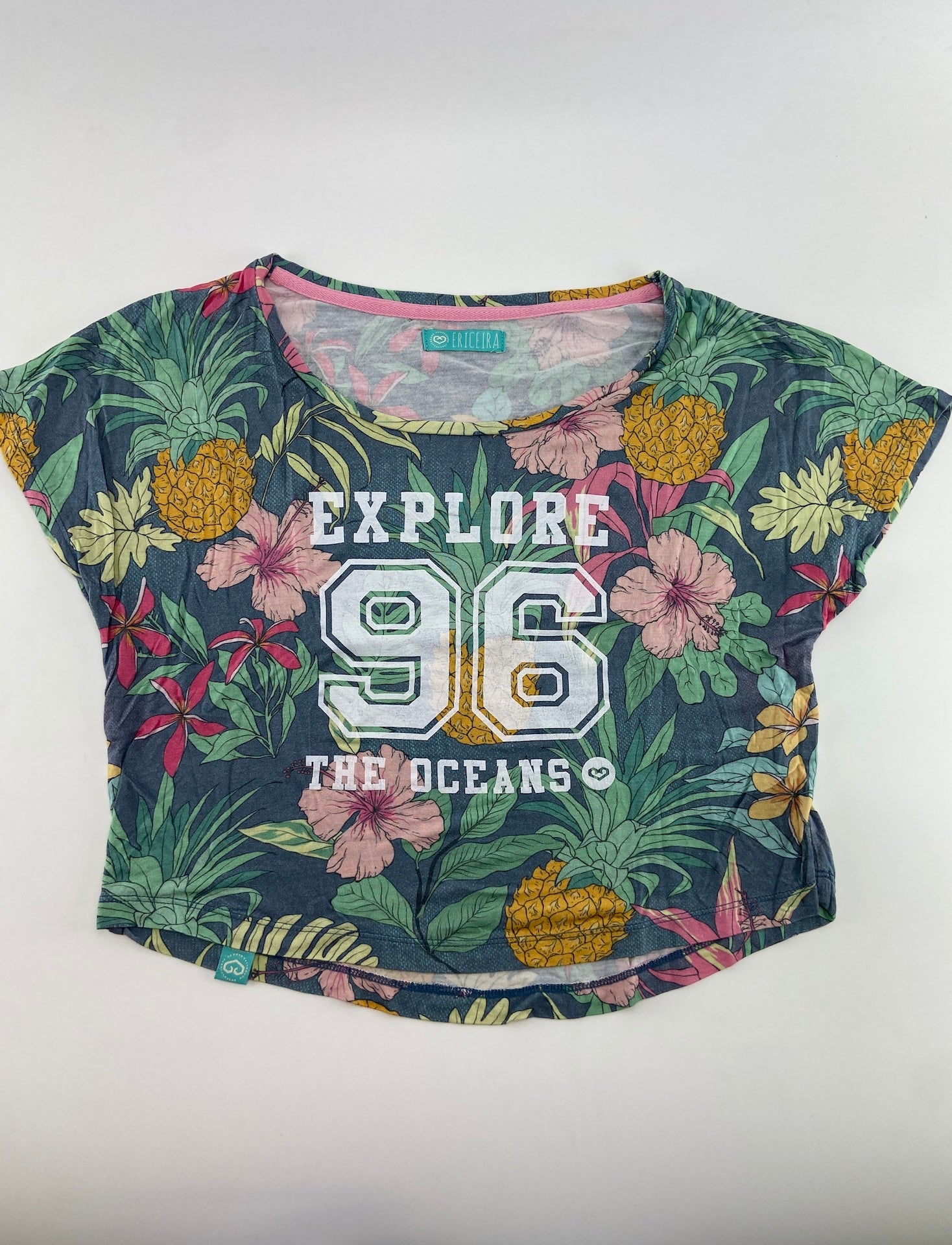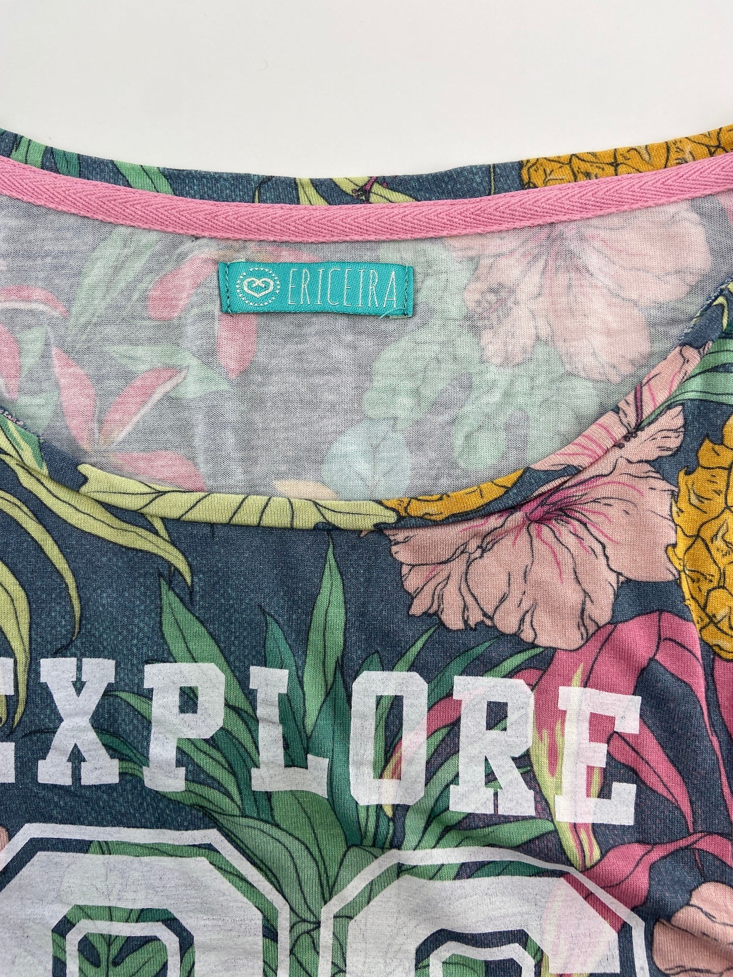 Top curto em malha elástica. Com padrão tropical e letras estampadas.