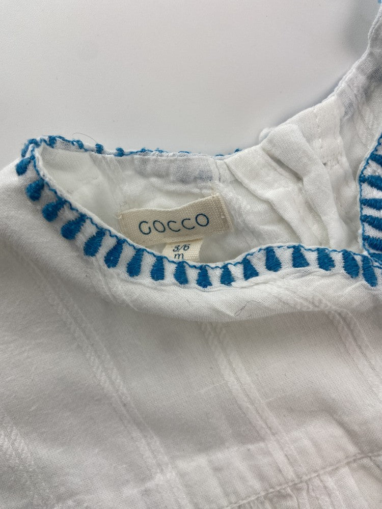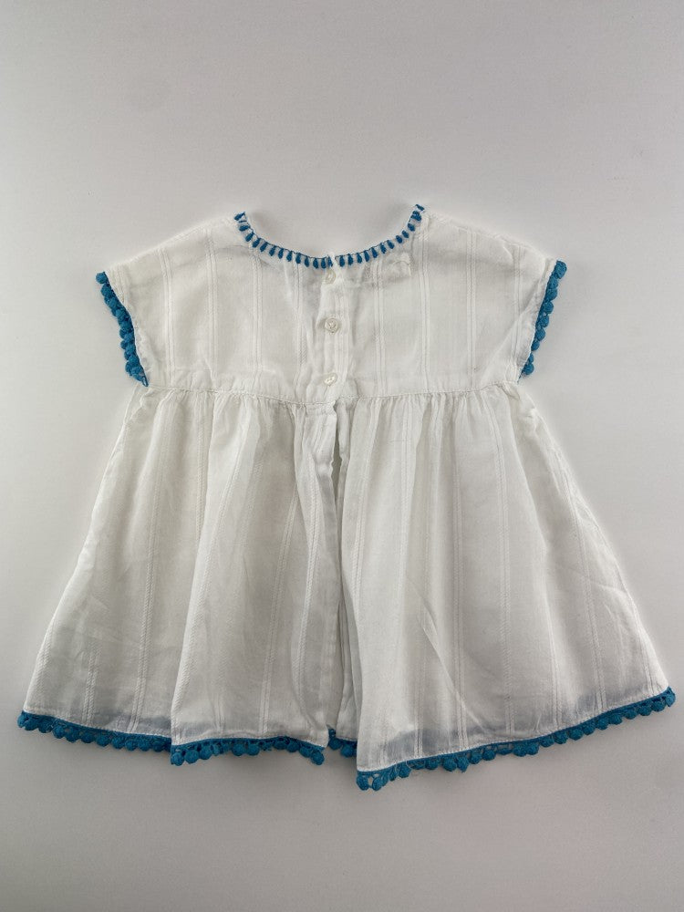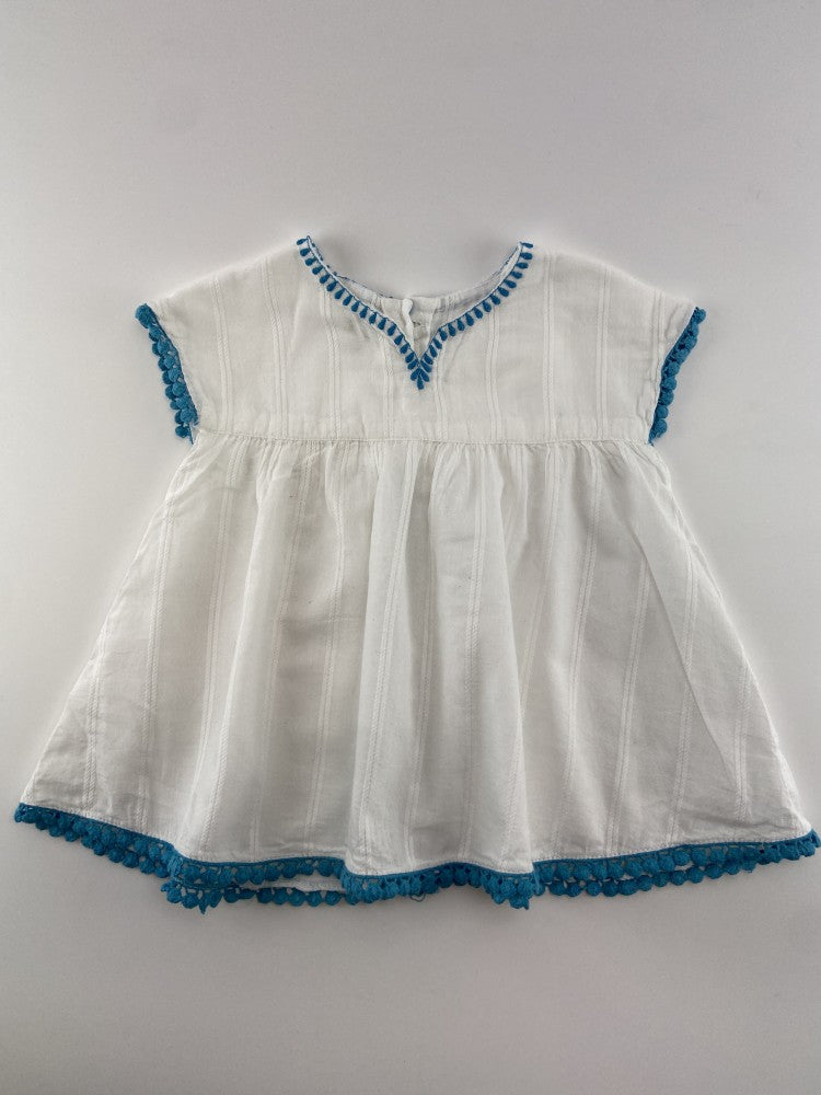 Túnica com aplicação nas mangas e na bainha. Com bordado no colarinho. Com botões para apertar atrás.