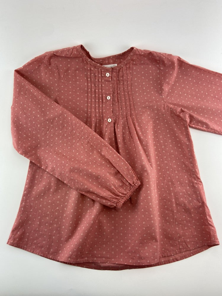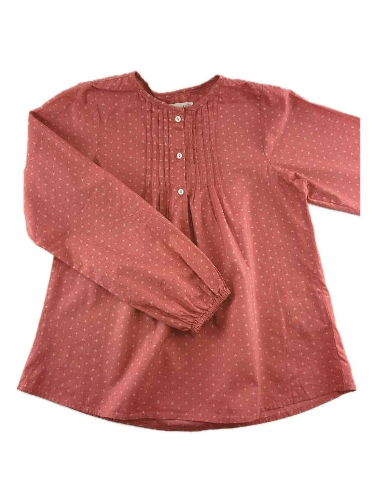 Túnica com pregas e botões na frente. Com padrão geométrico.
