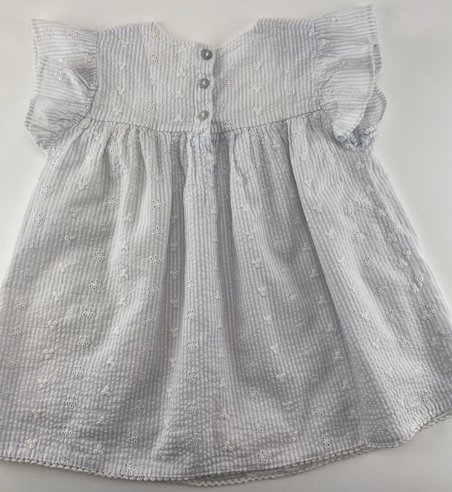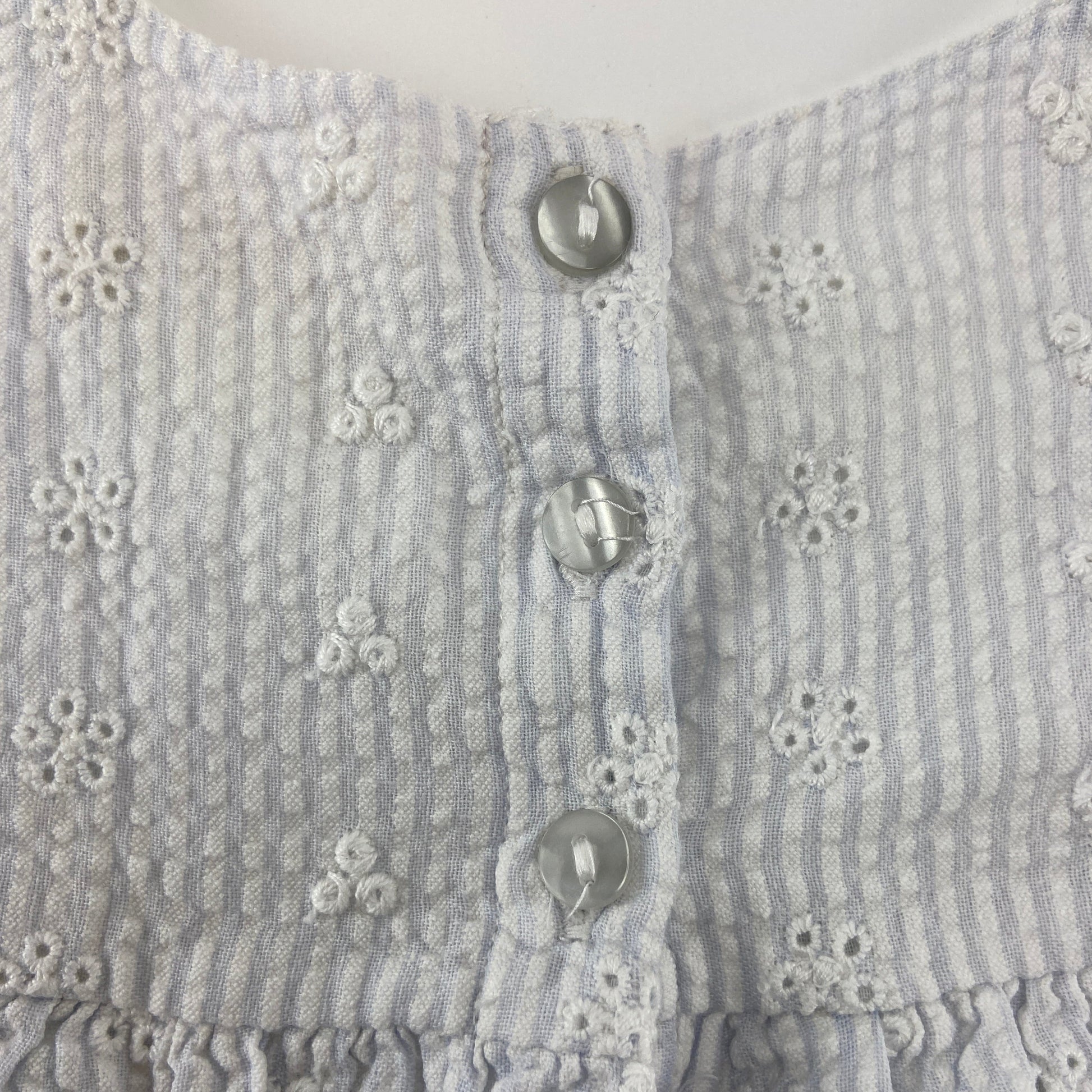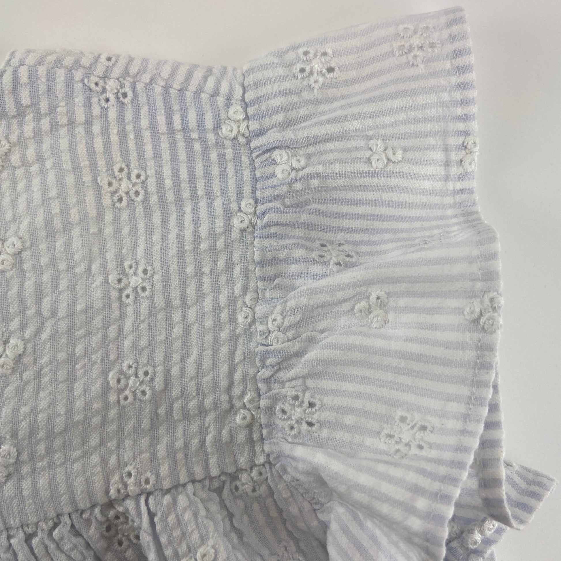 Túnica com folho nas mangas. Tecido com padrão de riscas e flores bordadas.
