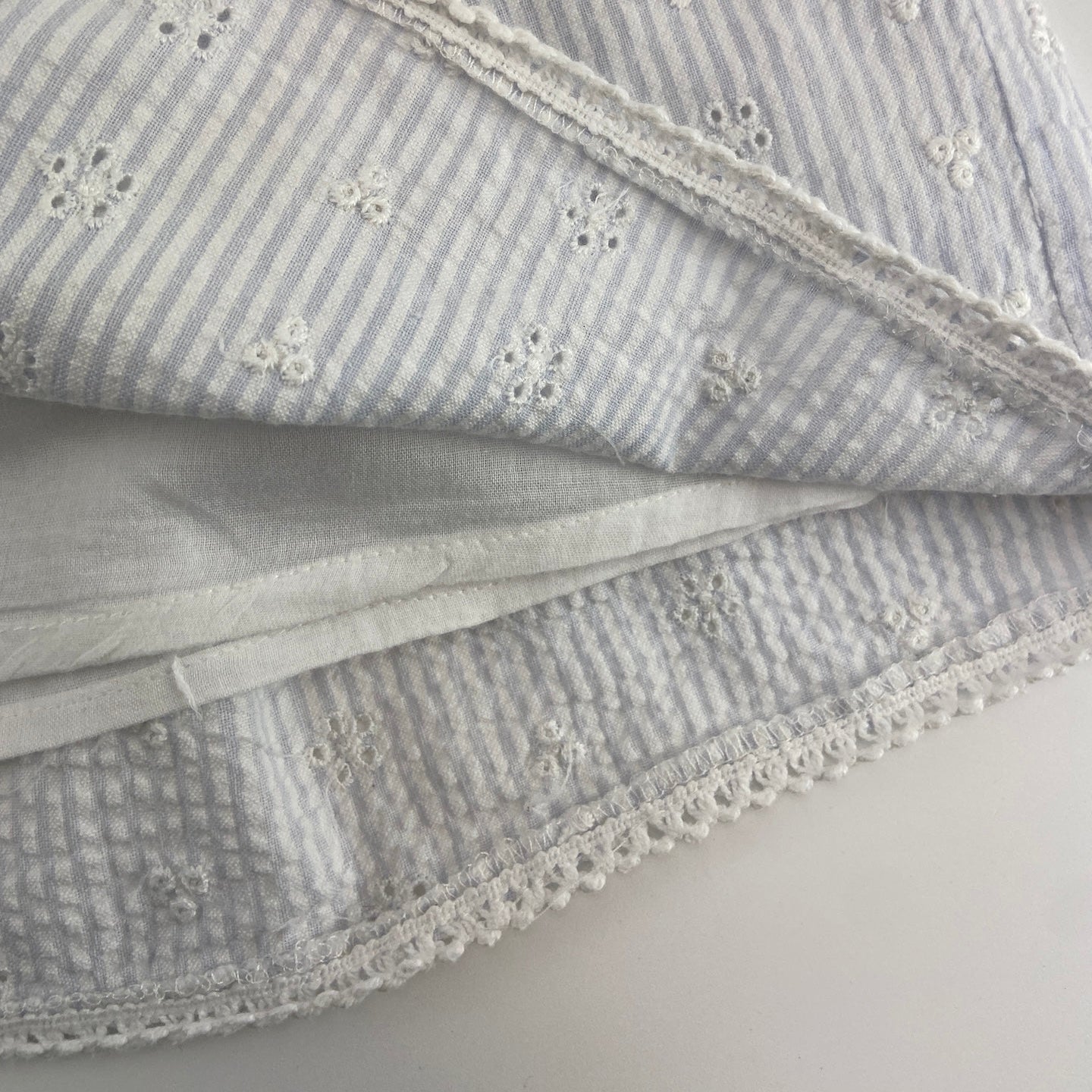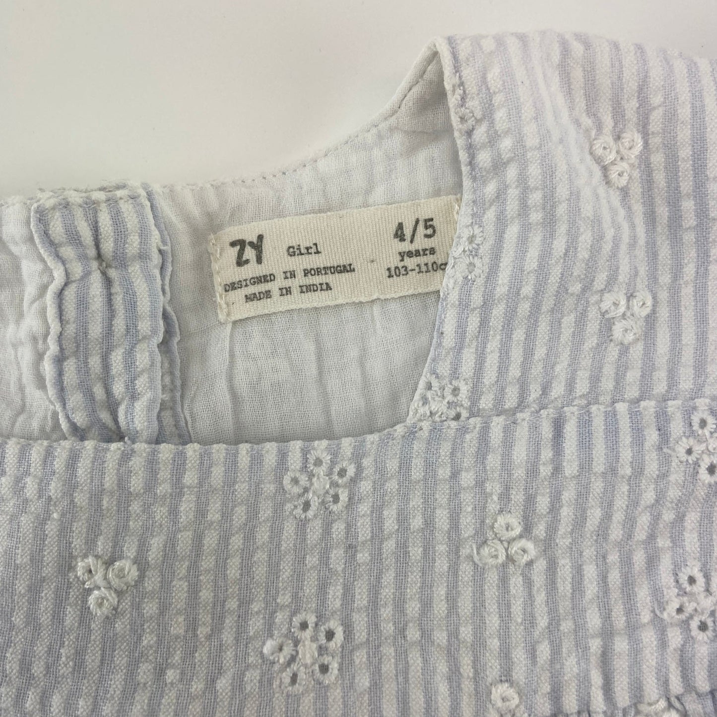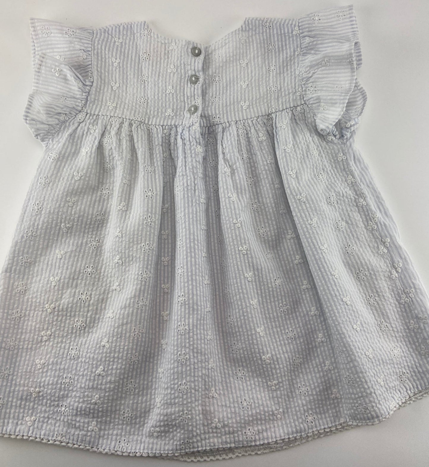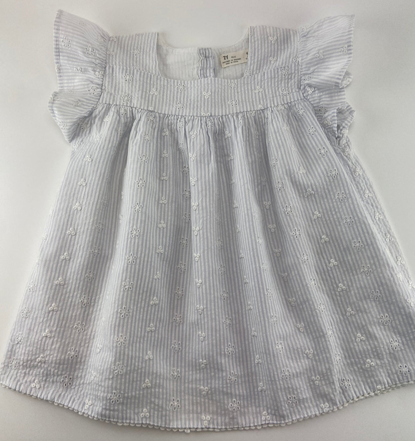 Túnica com folho nas mangas. Tecido com padrão de riscas e flores bordadas.