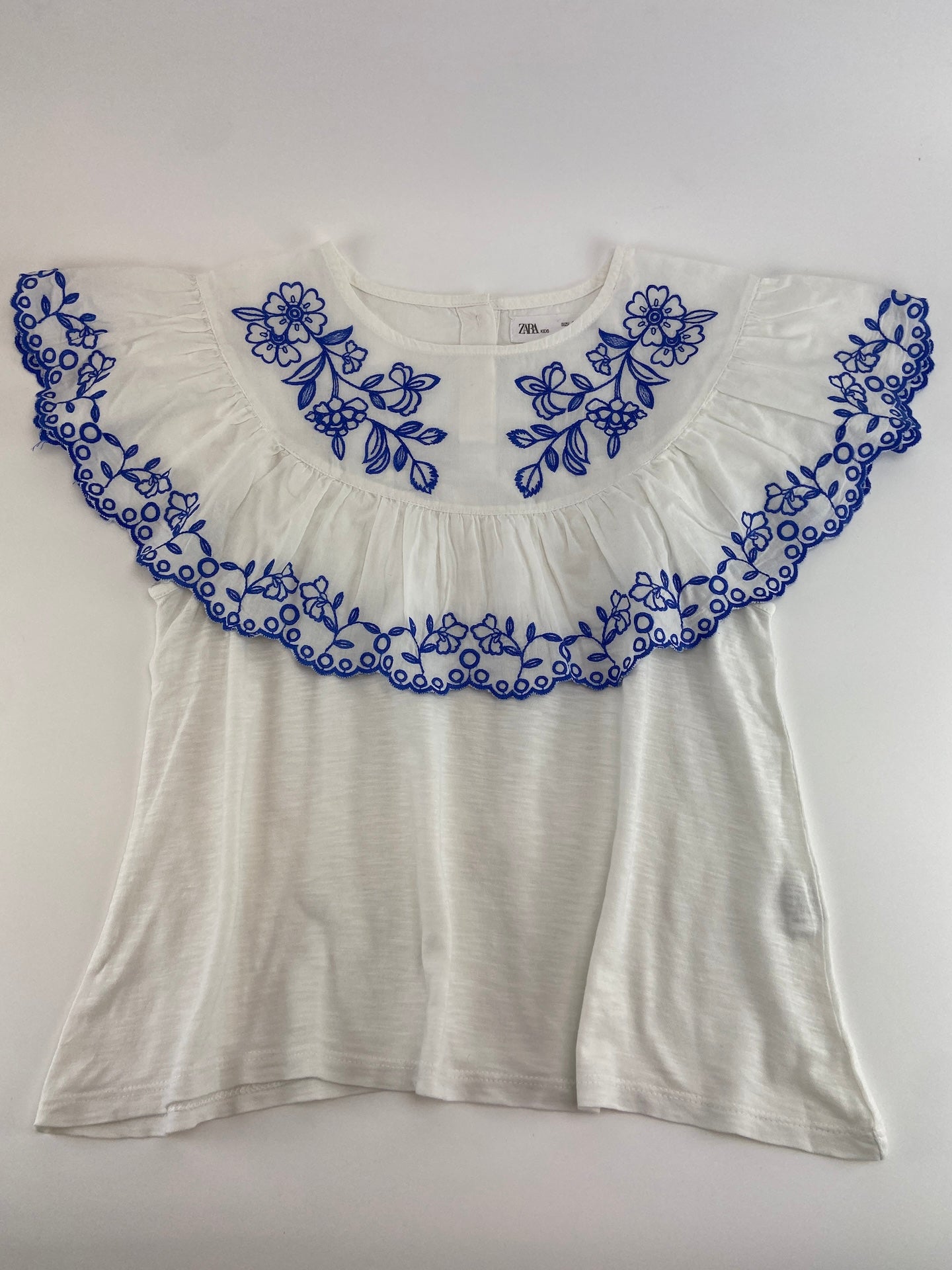 Túnica de gola grande com folho e bordado de abotoar atrás.