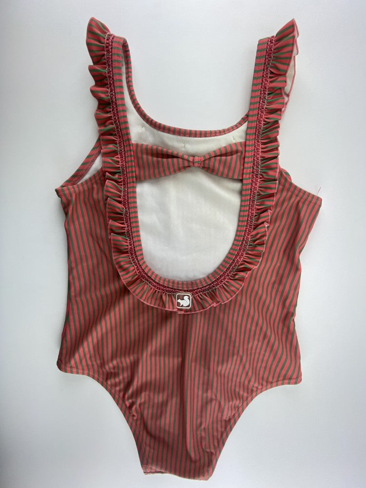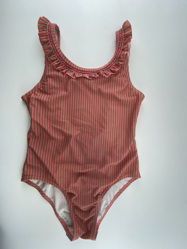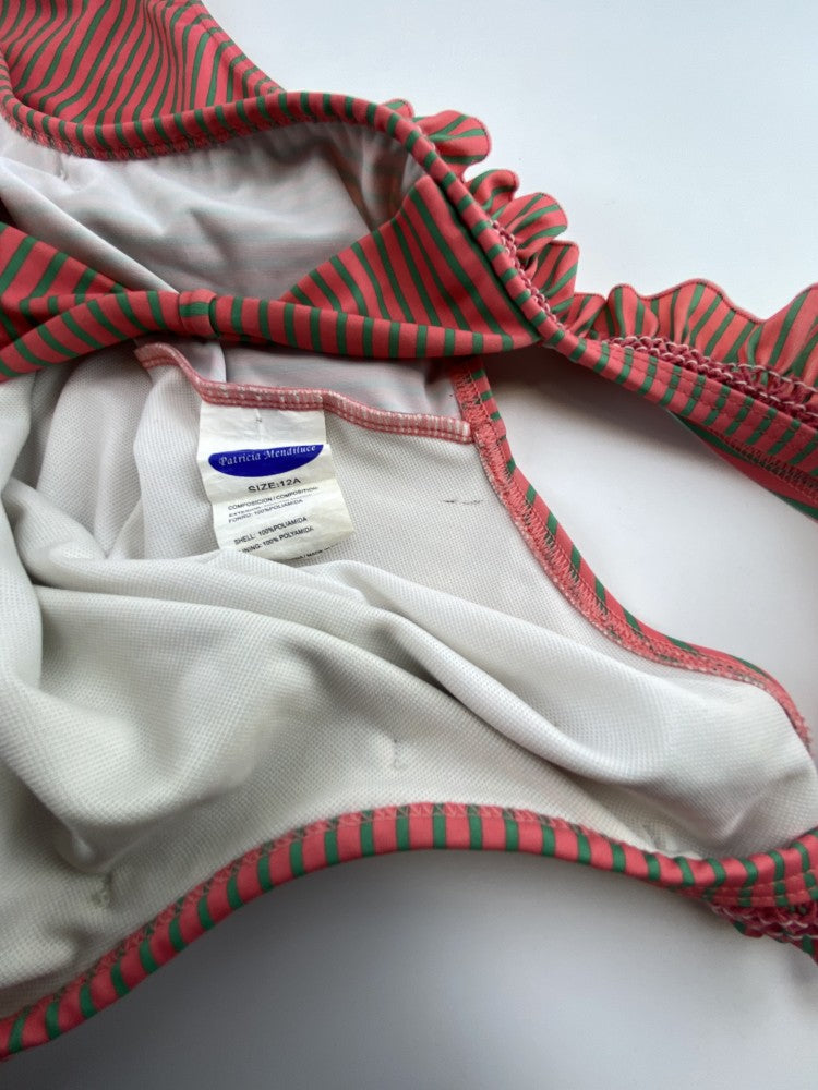 Fato de banho com padrão de riscas. Com folho e ponto de elástico na gola.