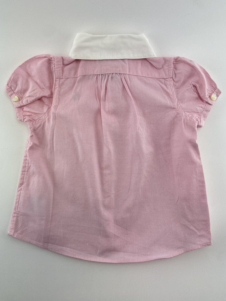 Camisa em tecido oxford com mangas de balão, golinha, e bordado no peito.