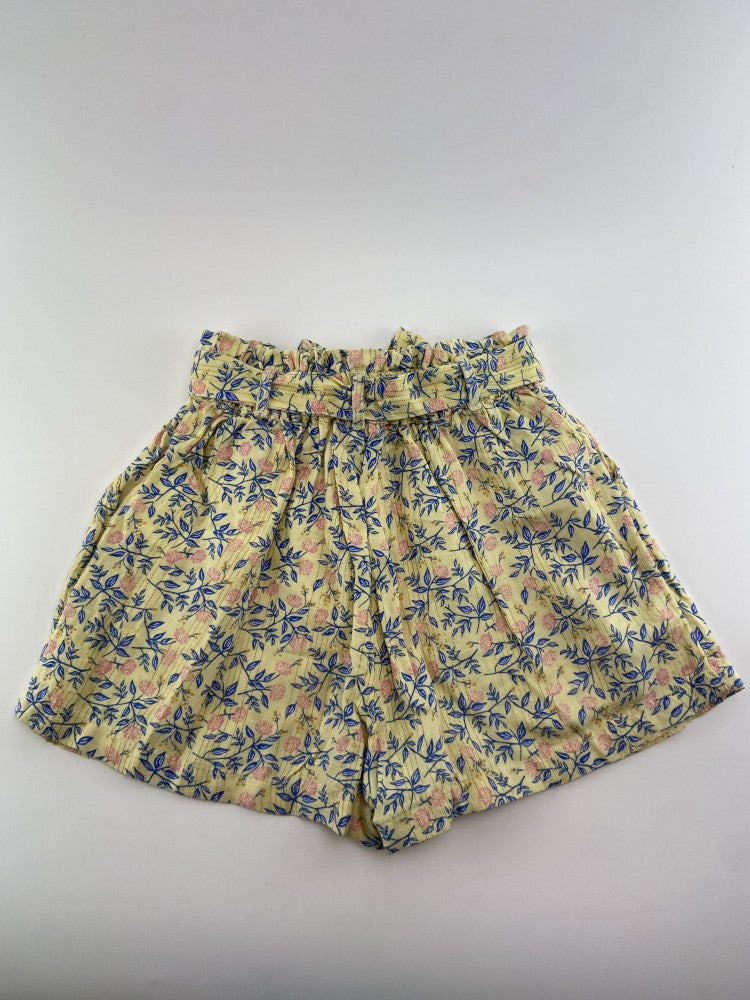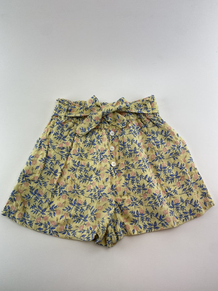 Calções com apdrão de flores e riscas douradas. Cintura com elástico e faixa.
