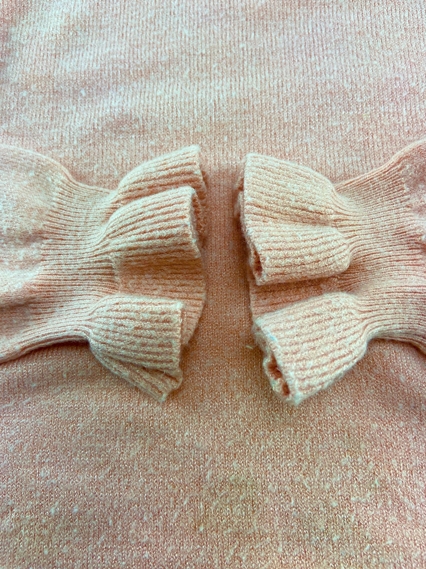 Camisola com gola de folho em malha. Com folho nos punhos. De abotoar atrás.