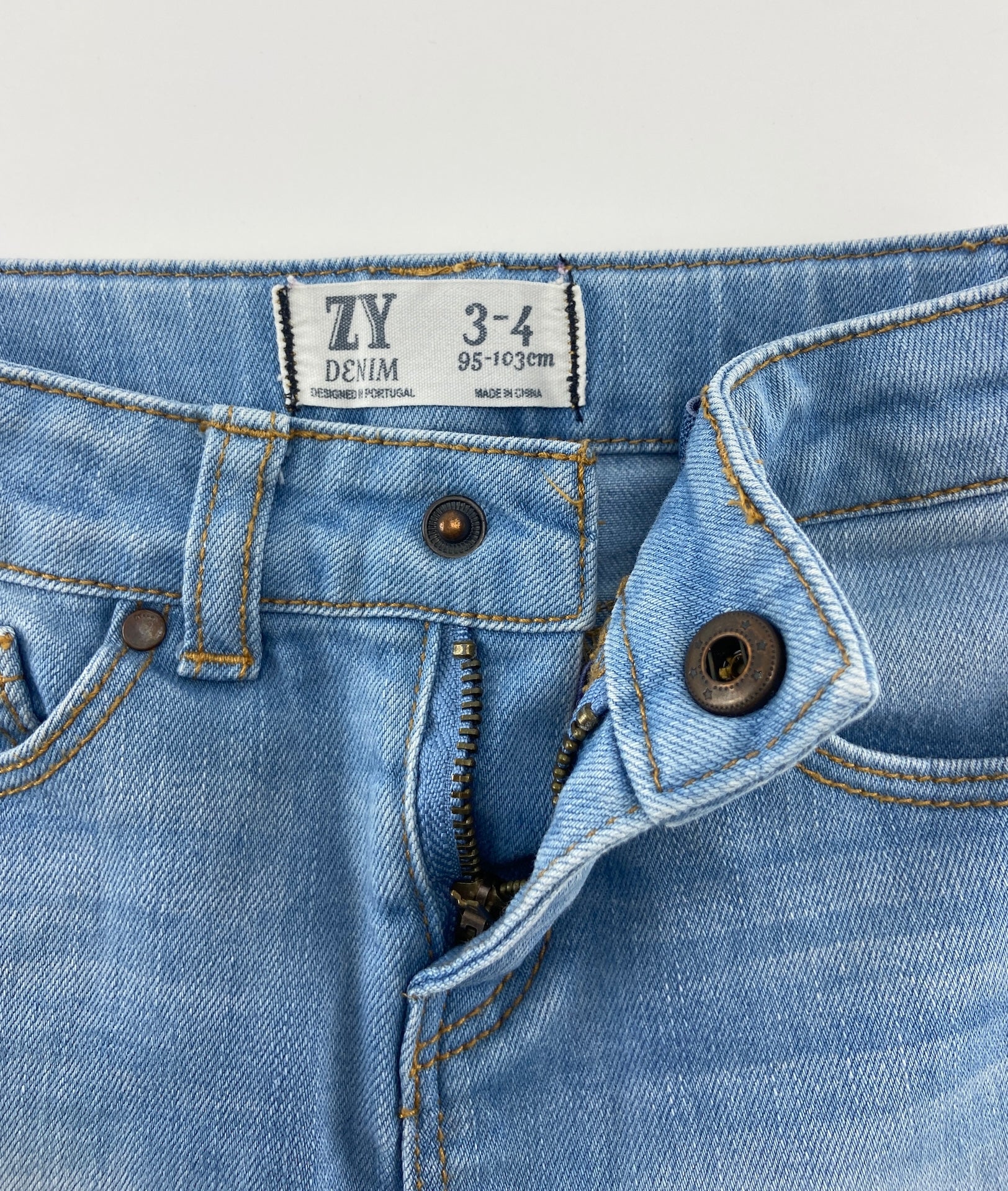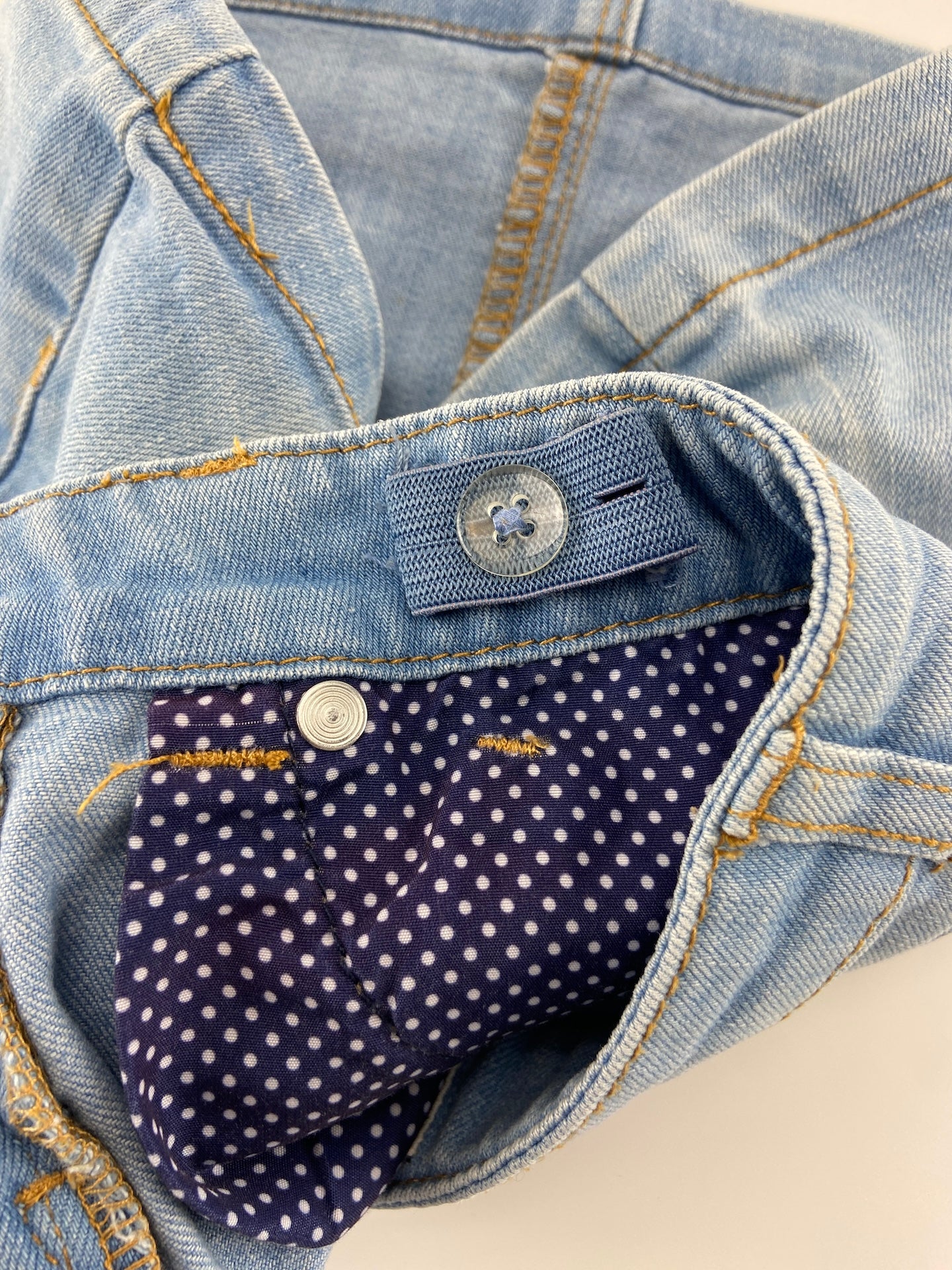 Saia de ganga com botão de mola e elástico ajustável na cintura.