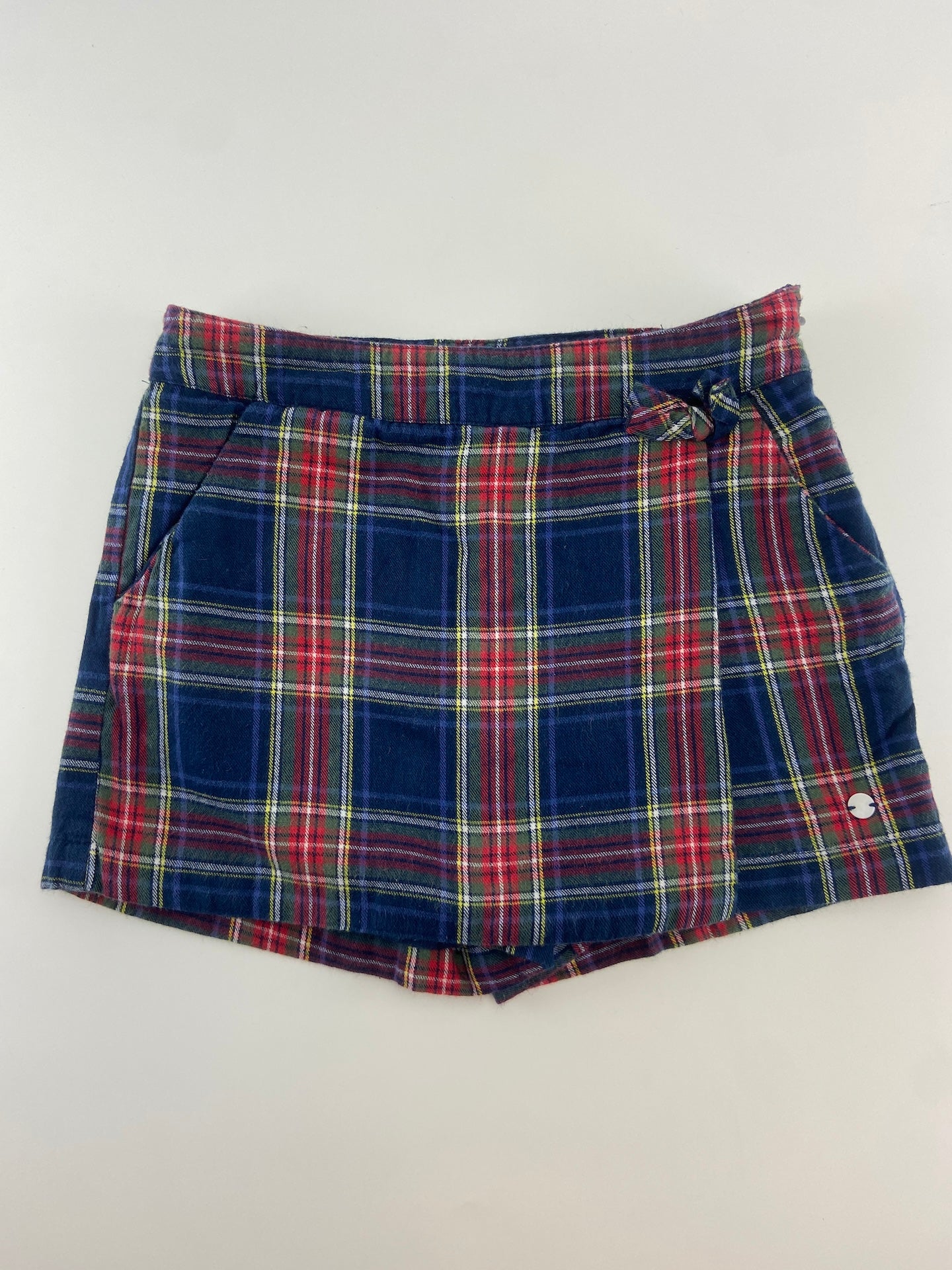 Saia-calções com padrão escocês. Com bolsos e laço na frente.