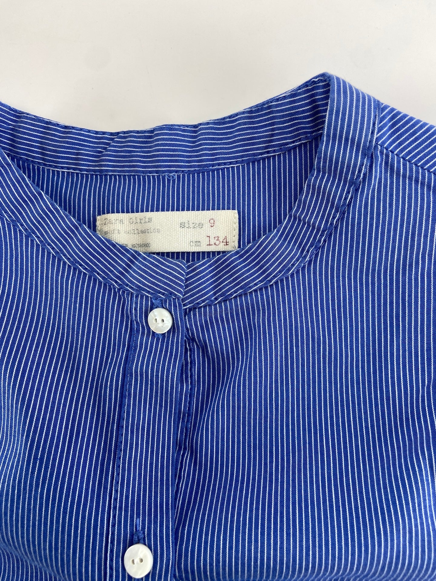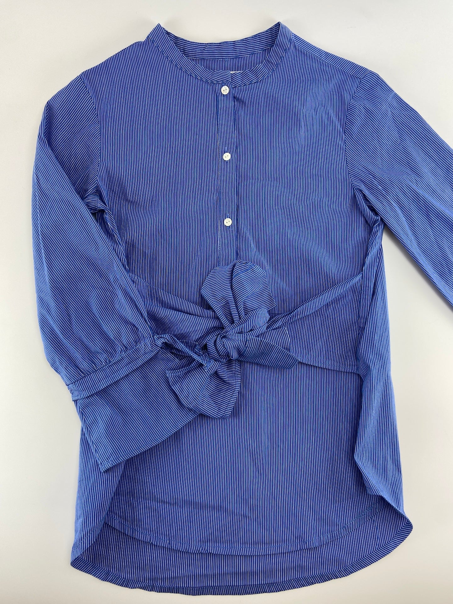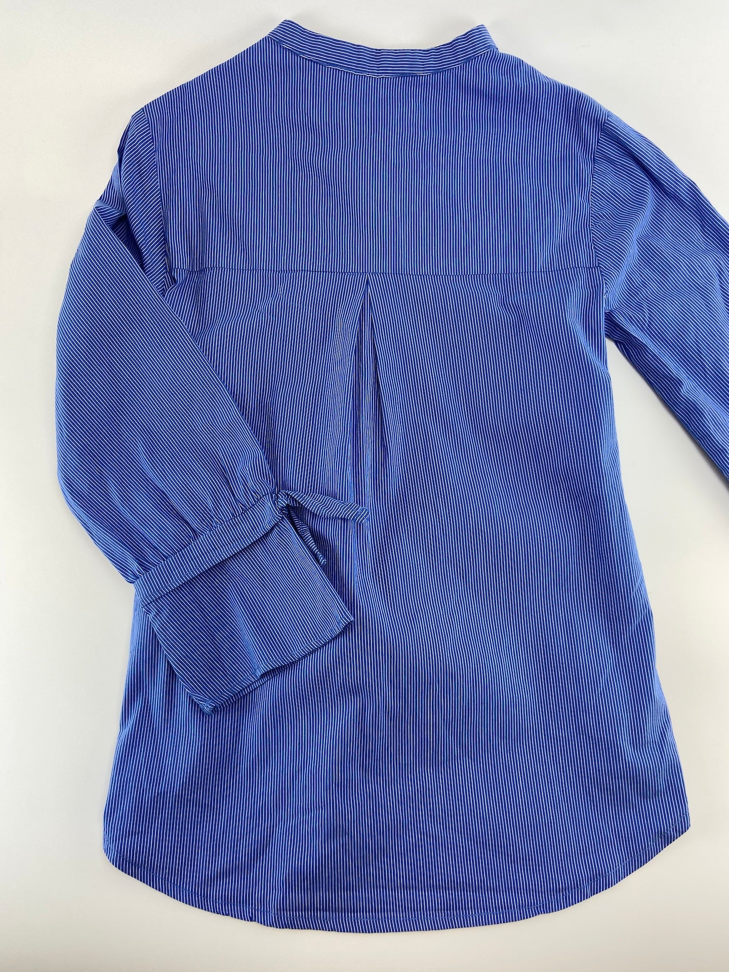 Camisa com padrão de riscas. Sem gola, em malha elástica e faixa de apertar na cintura.