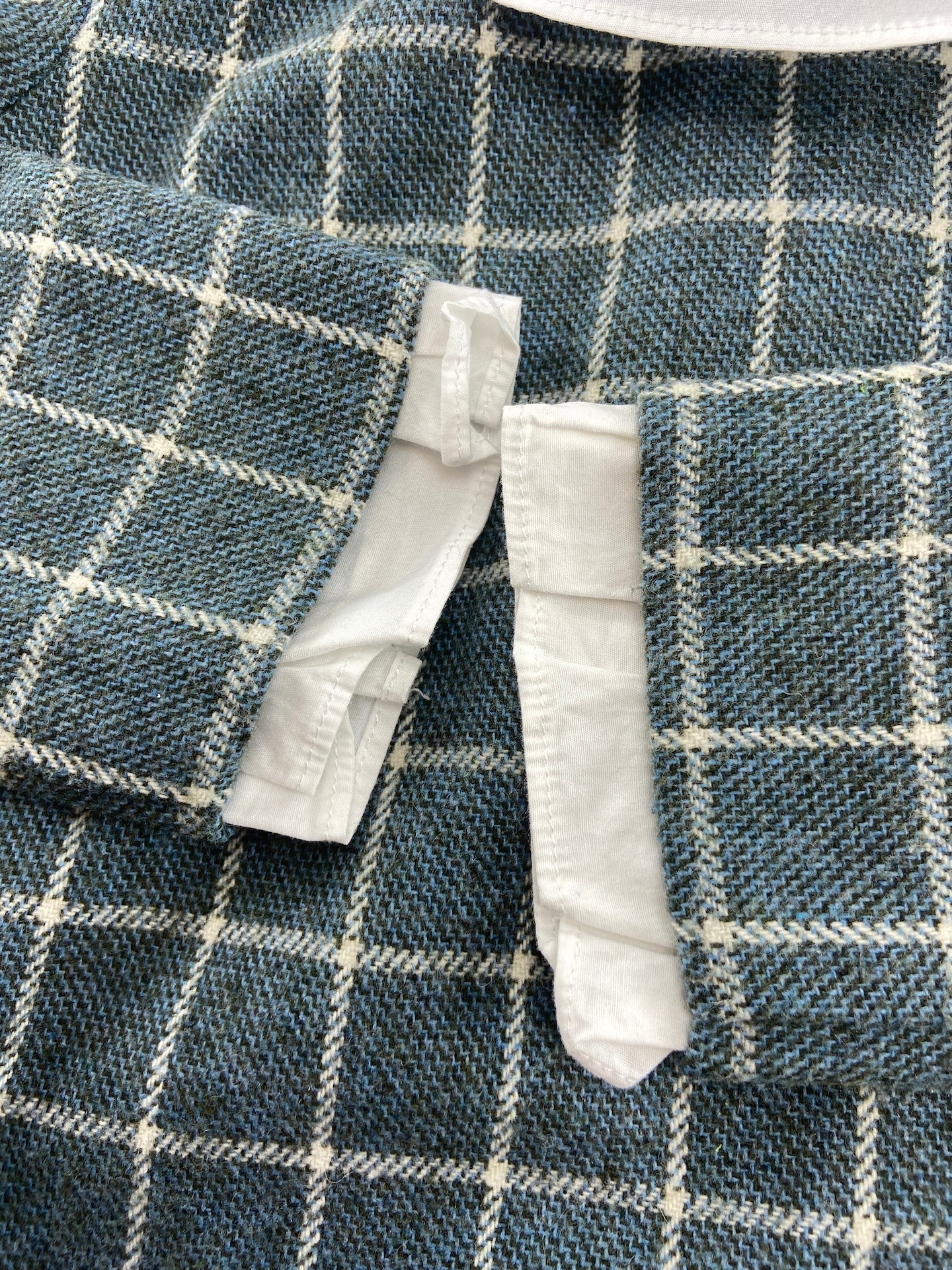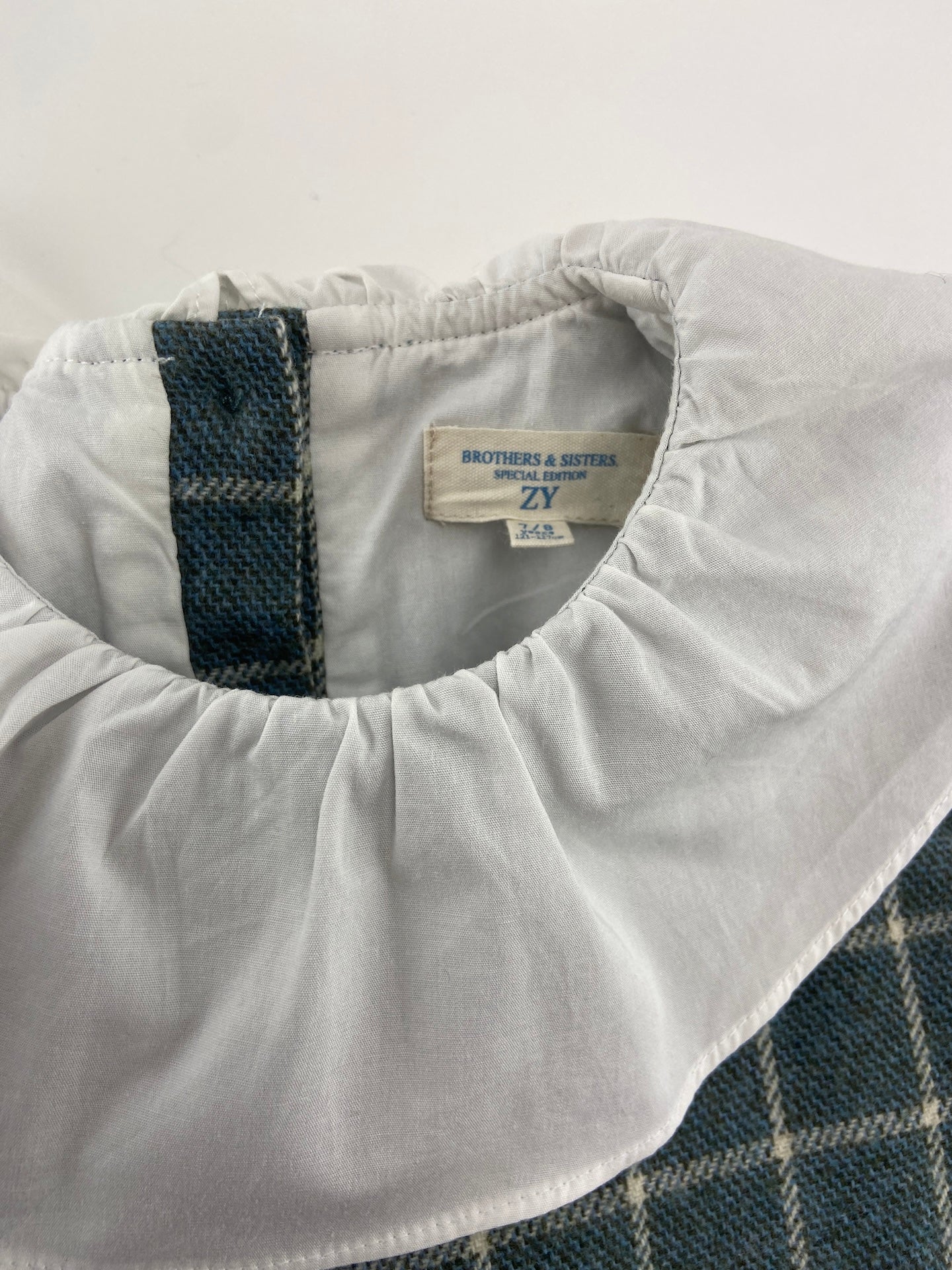 Vestido em tecido de fazenda com padrão de quadrados. Com saiote, punhos e gola de folho.