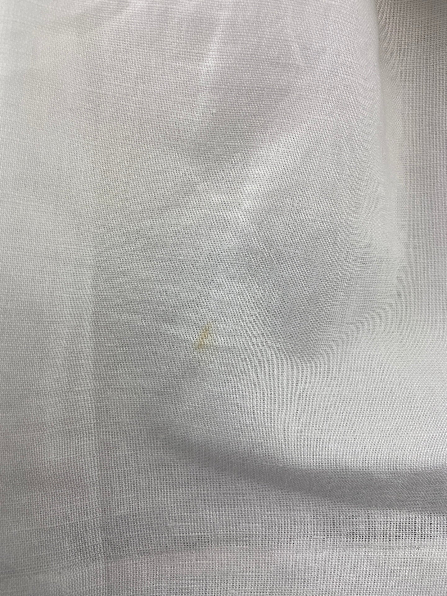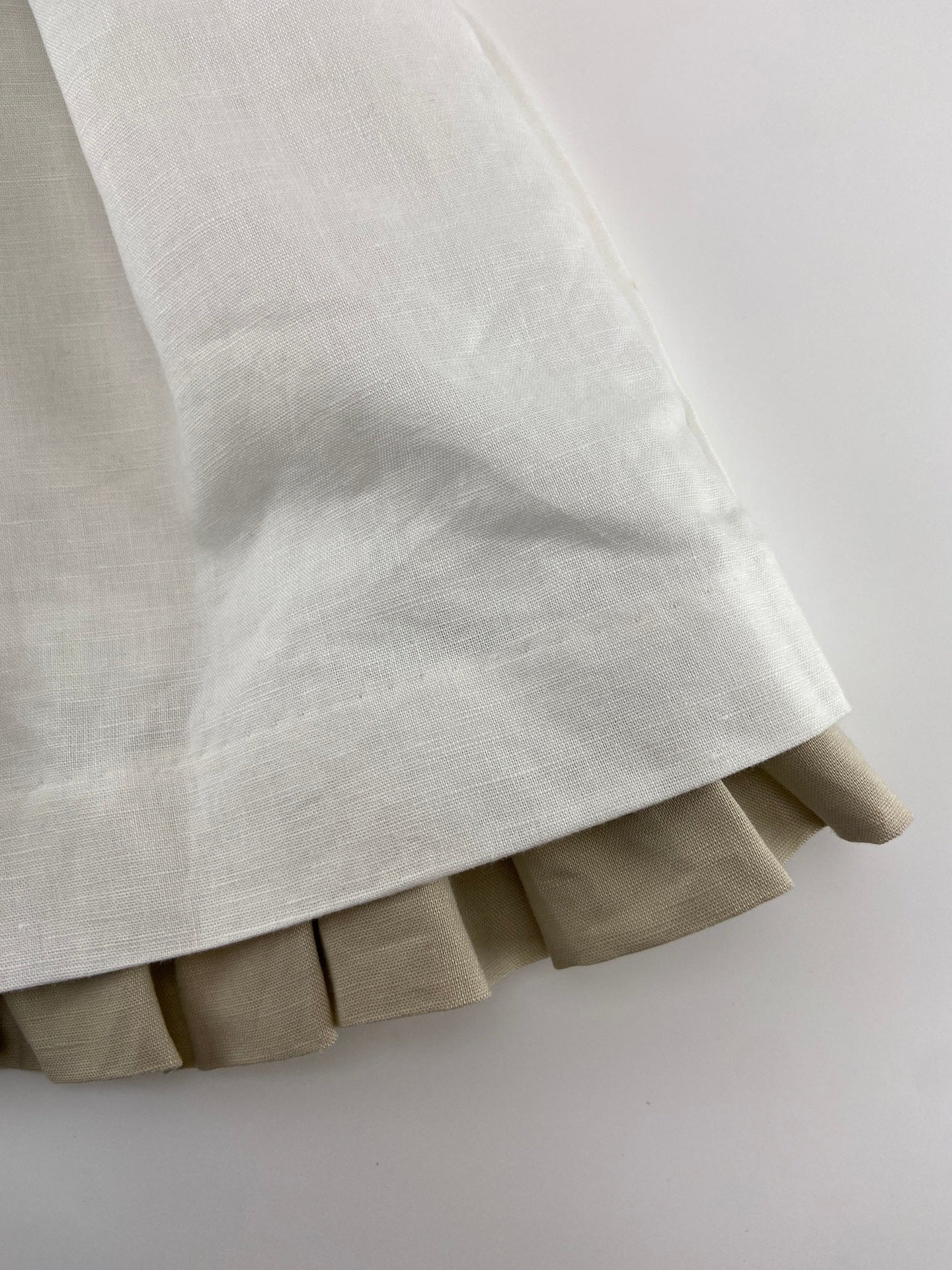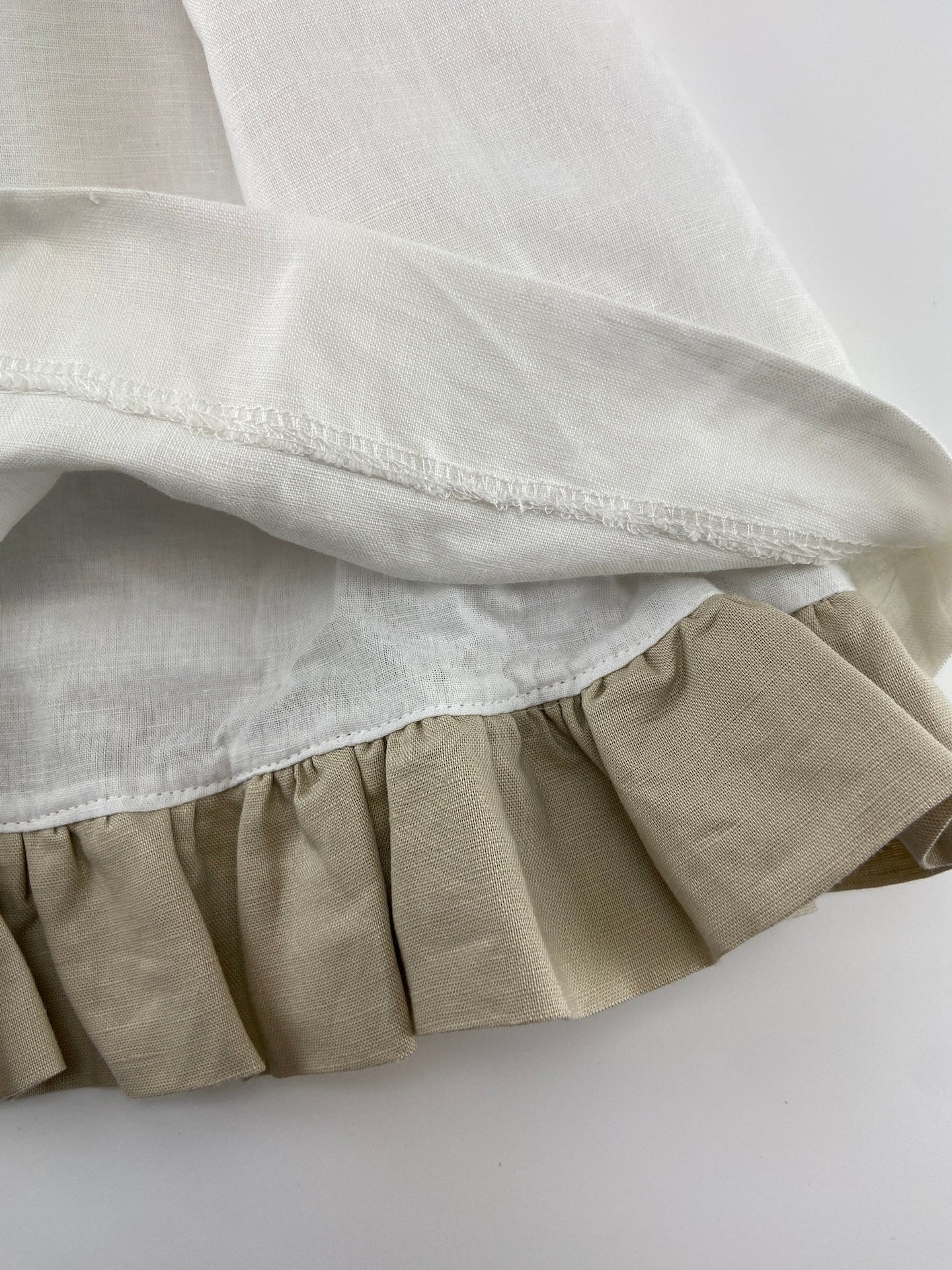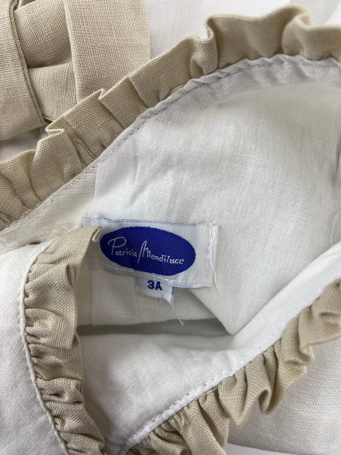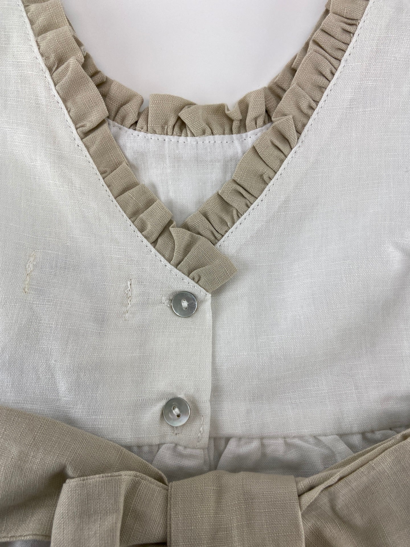 Vestido em linho com folho nas mangas, gola e bainha. Com faixa na cintura e laço nas costas.