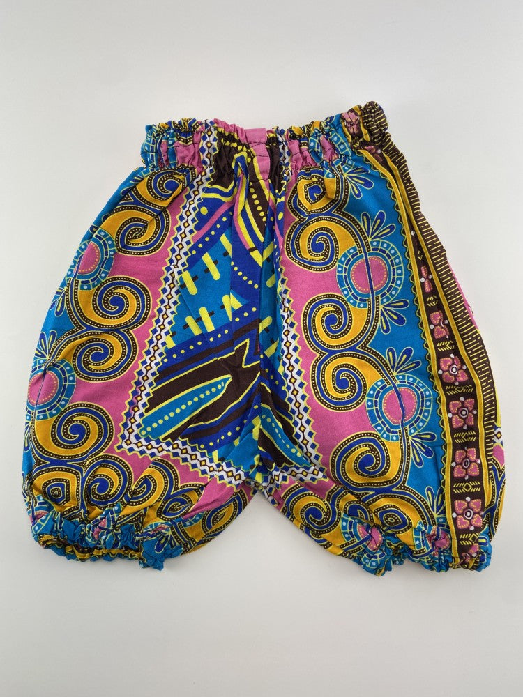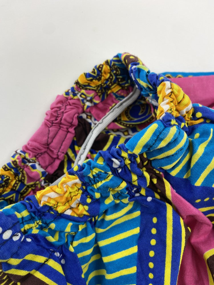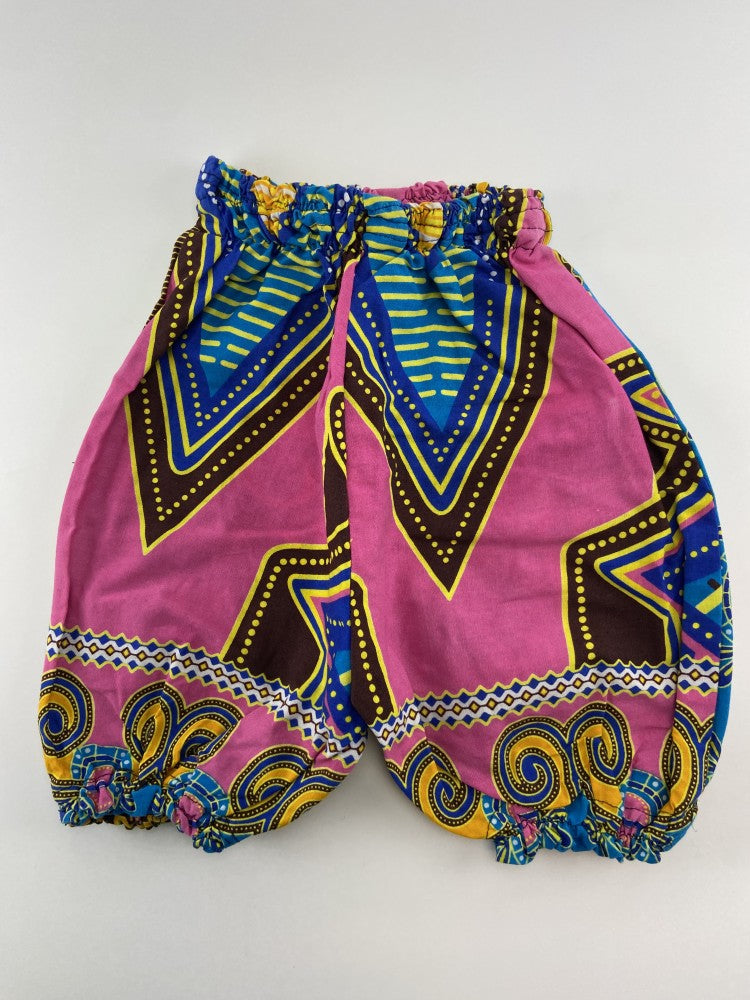 Calças em tecido tipo capulana com elástico na cintura. Tamanho aproximado.
