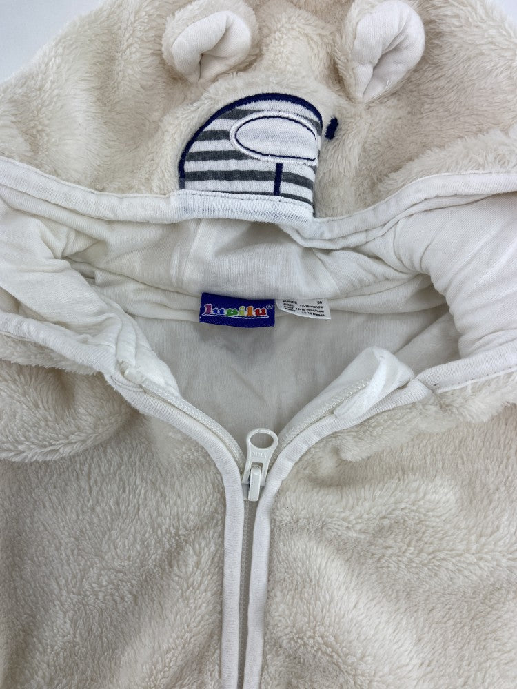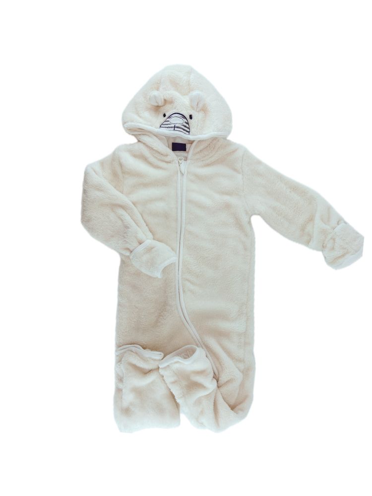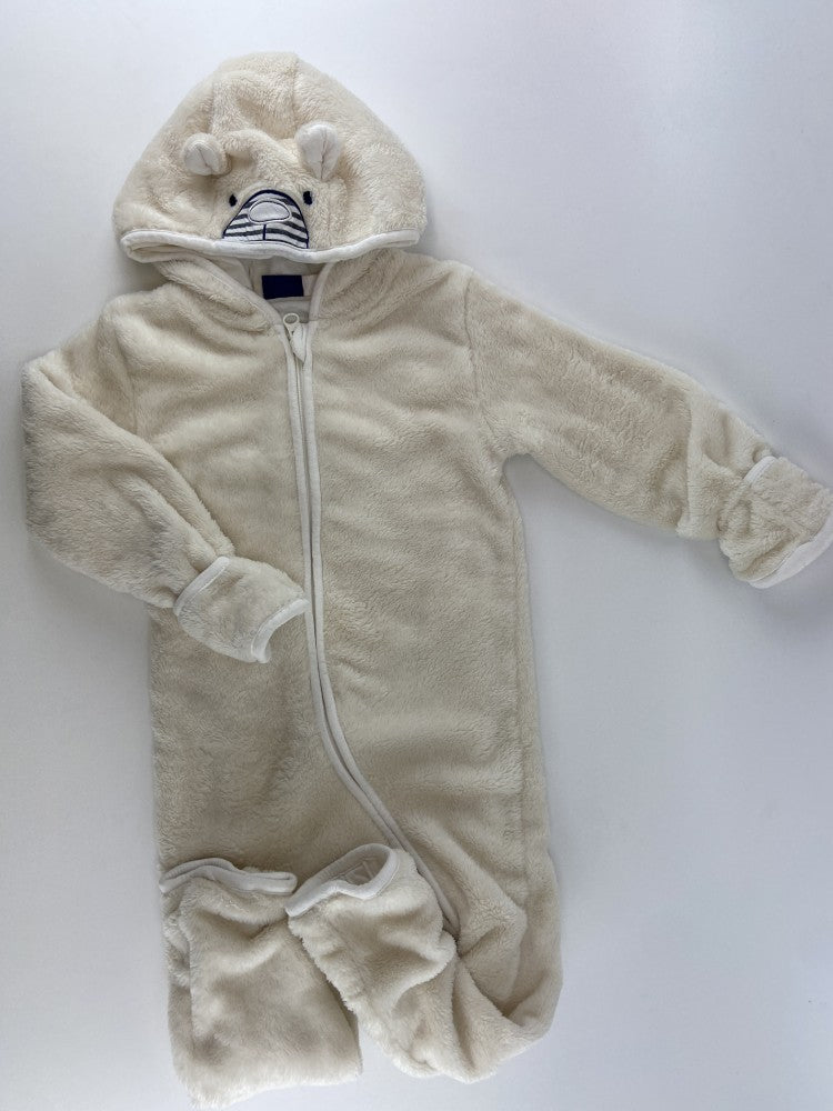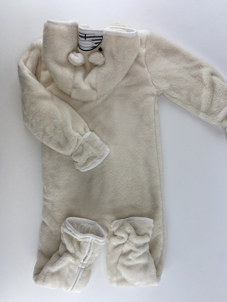 Macacão com capuz em pelúcia forrado com fecho à frente.