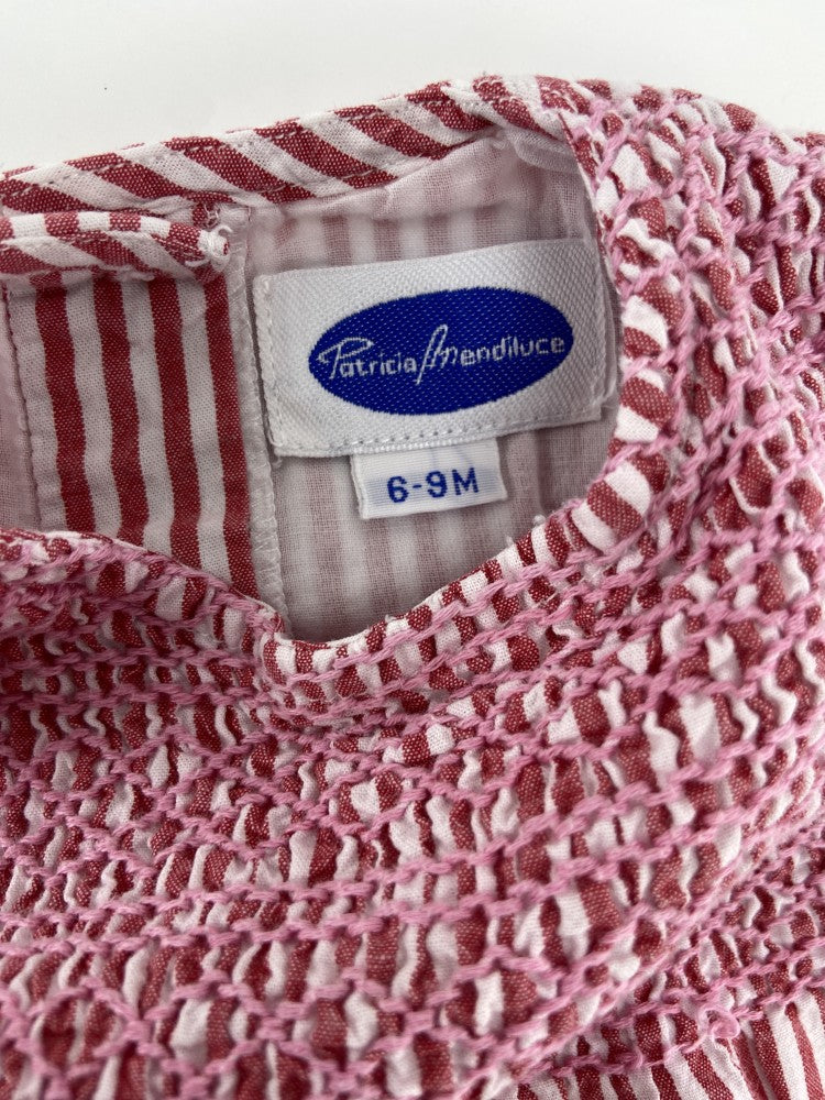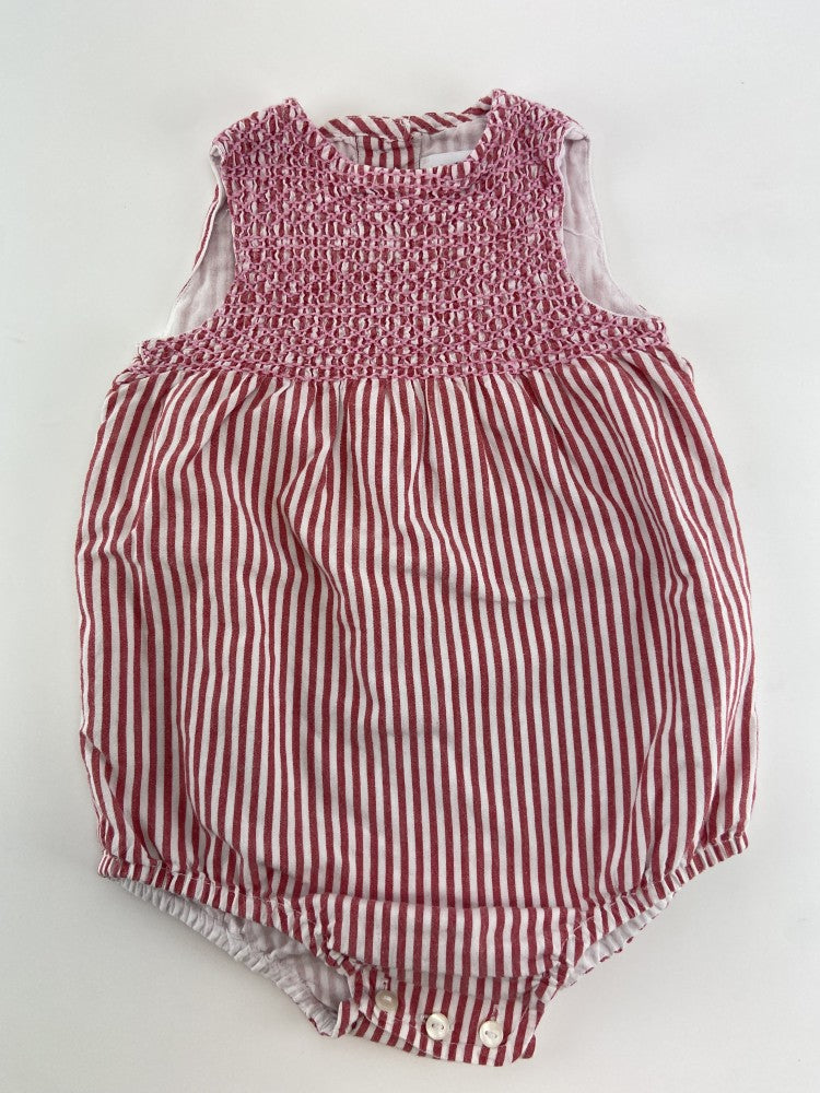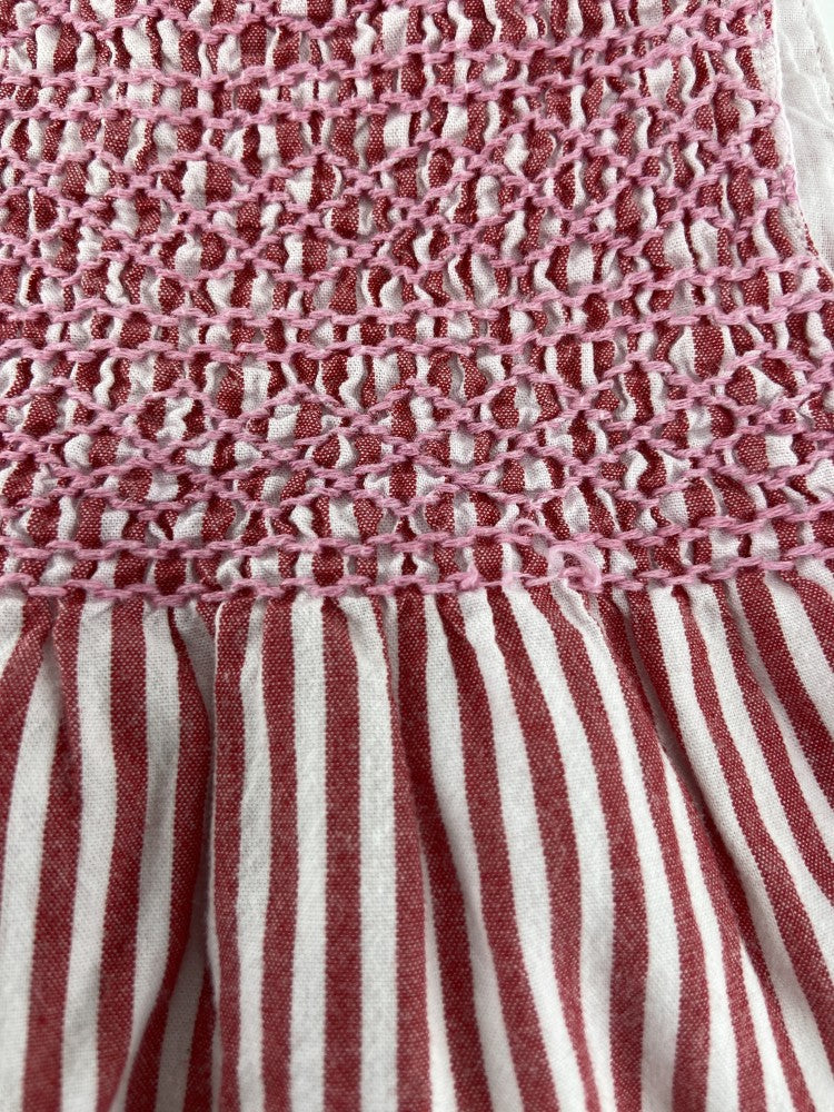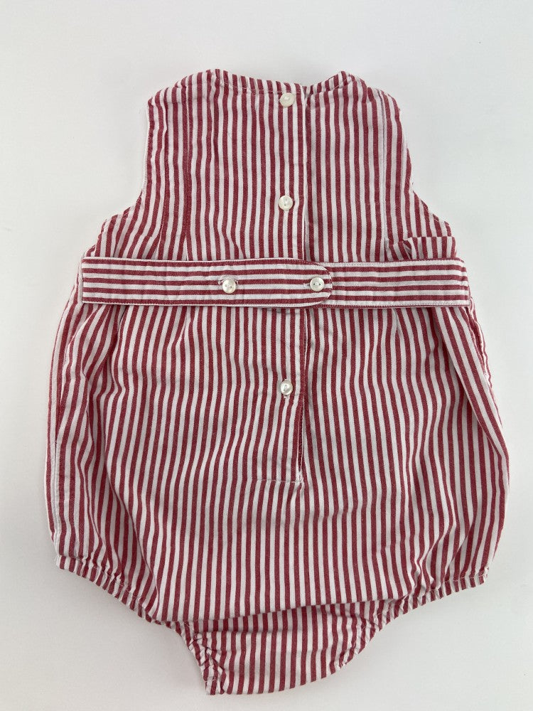 Fofo às riscas com pontos de elástico no peito, com fita de abotoar atrás.