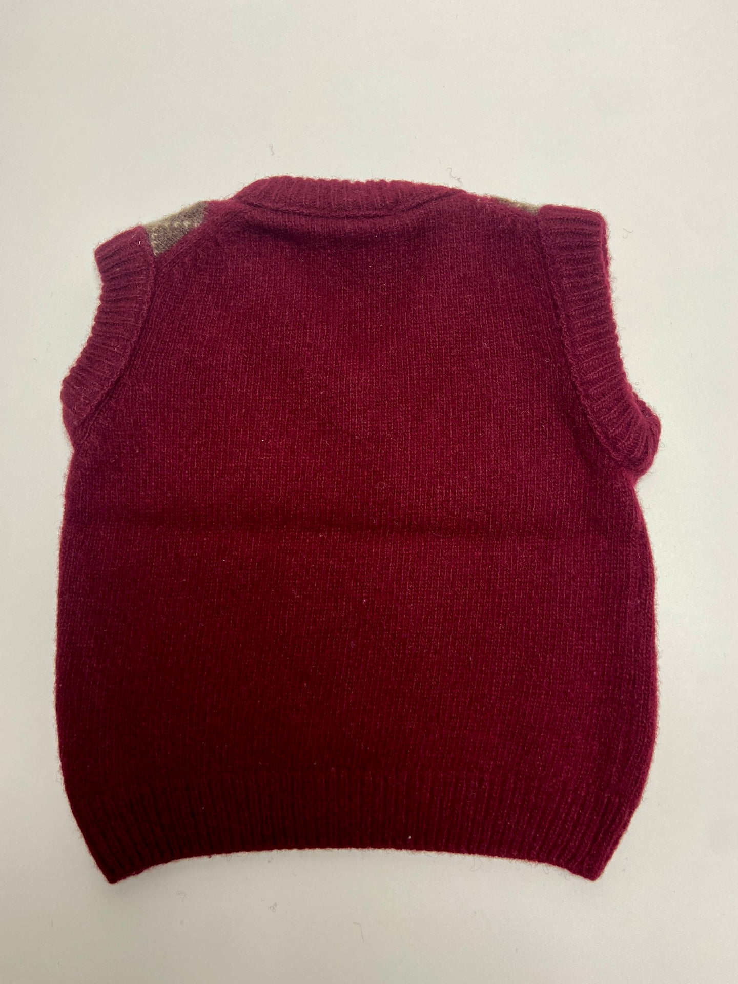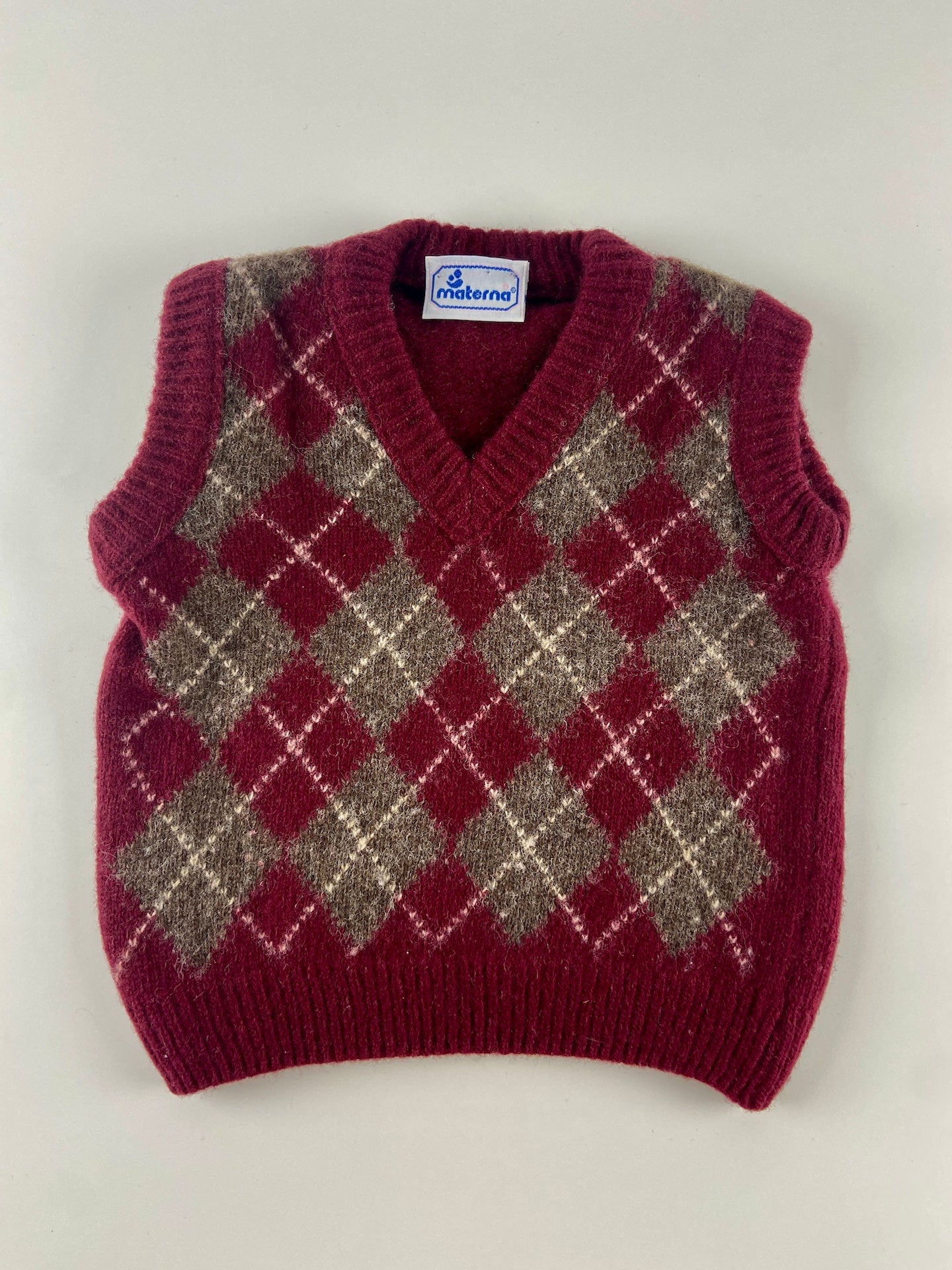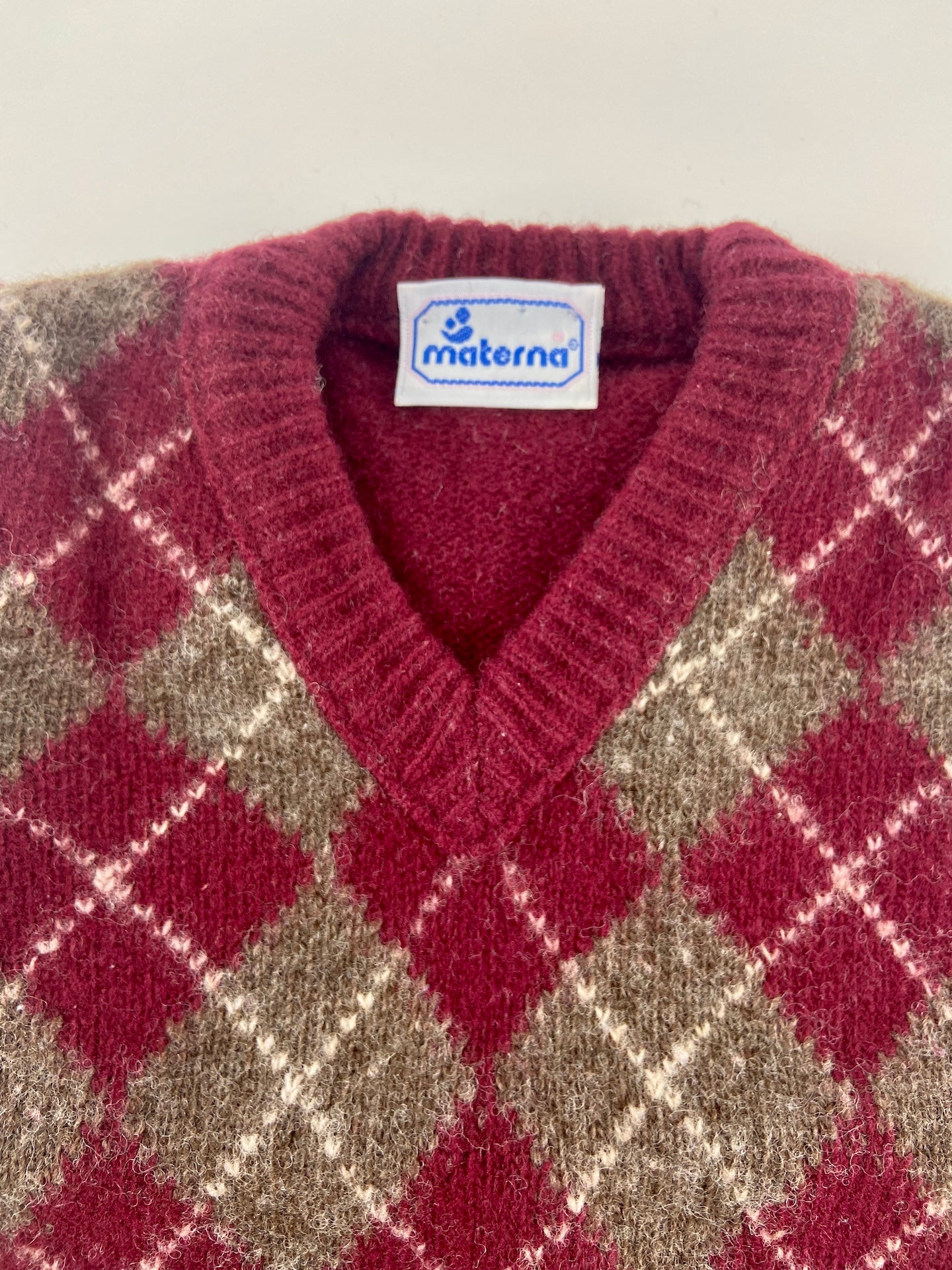 Colete de lã com gola de bico e padrão de losangos na frente.