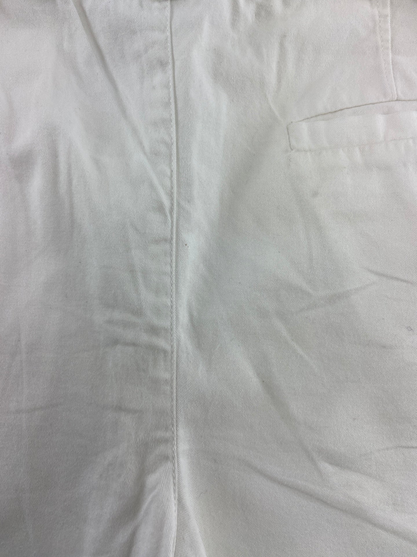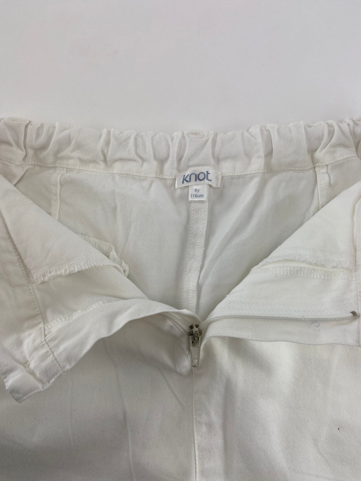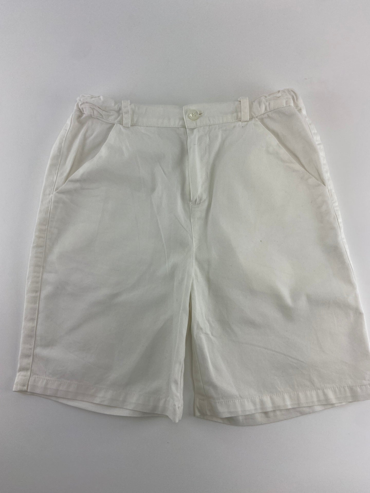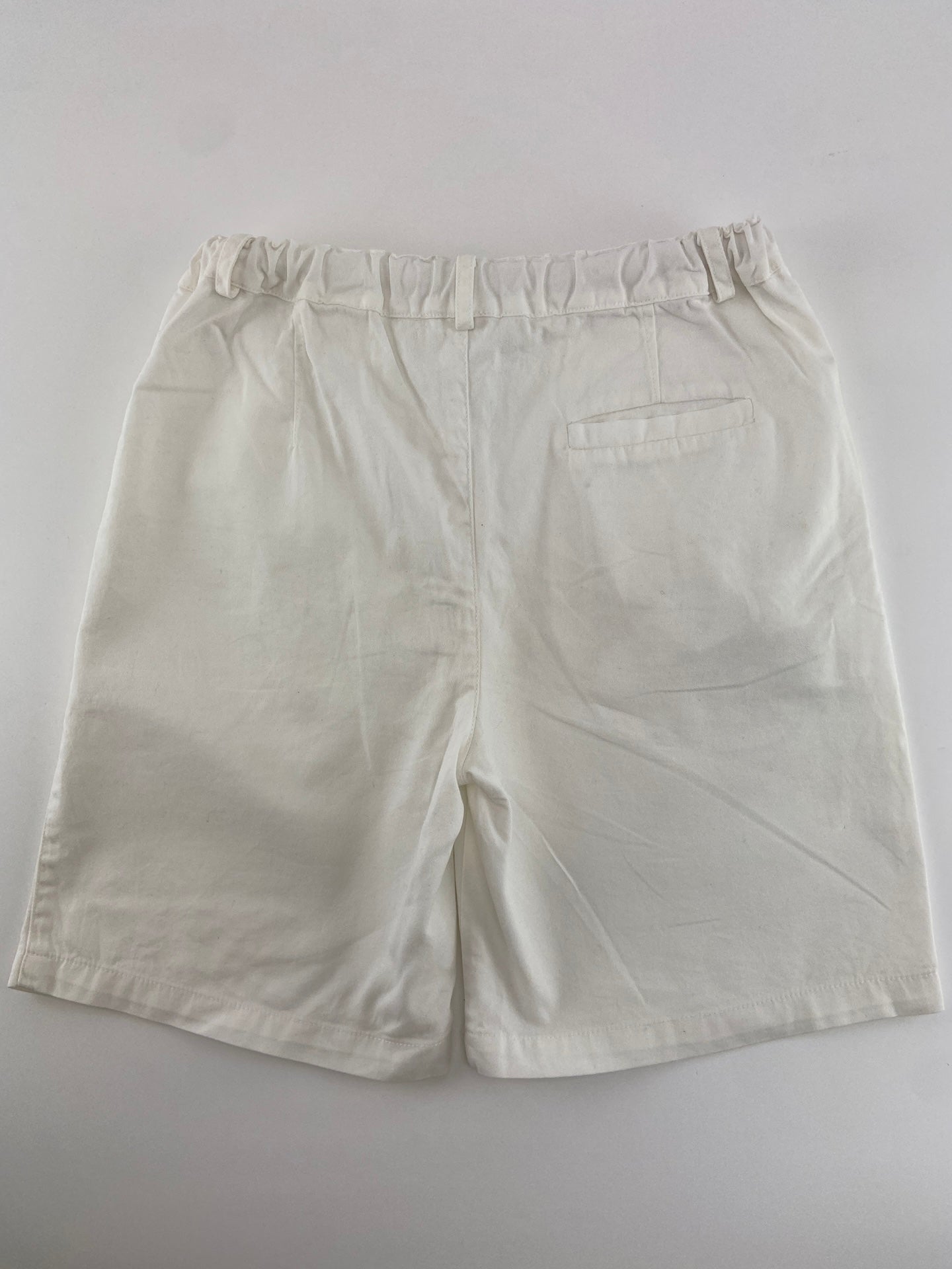 Calções de sarja fina com bolsos e elástico de ajuste na cintura.