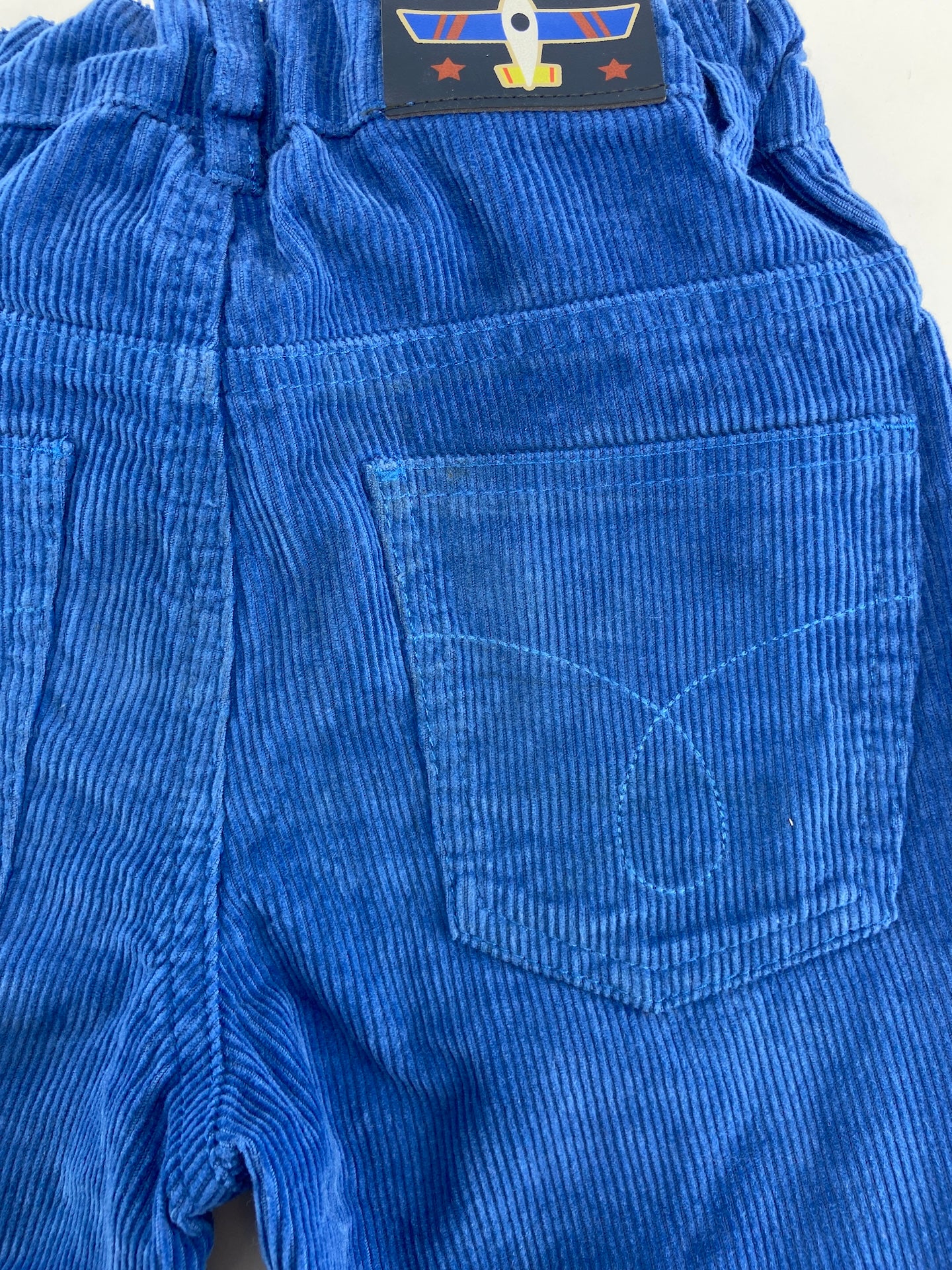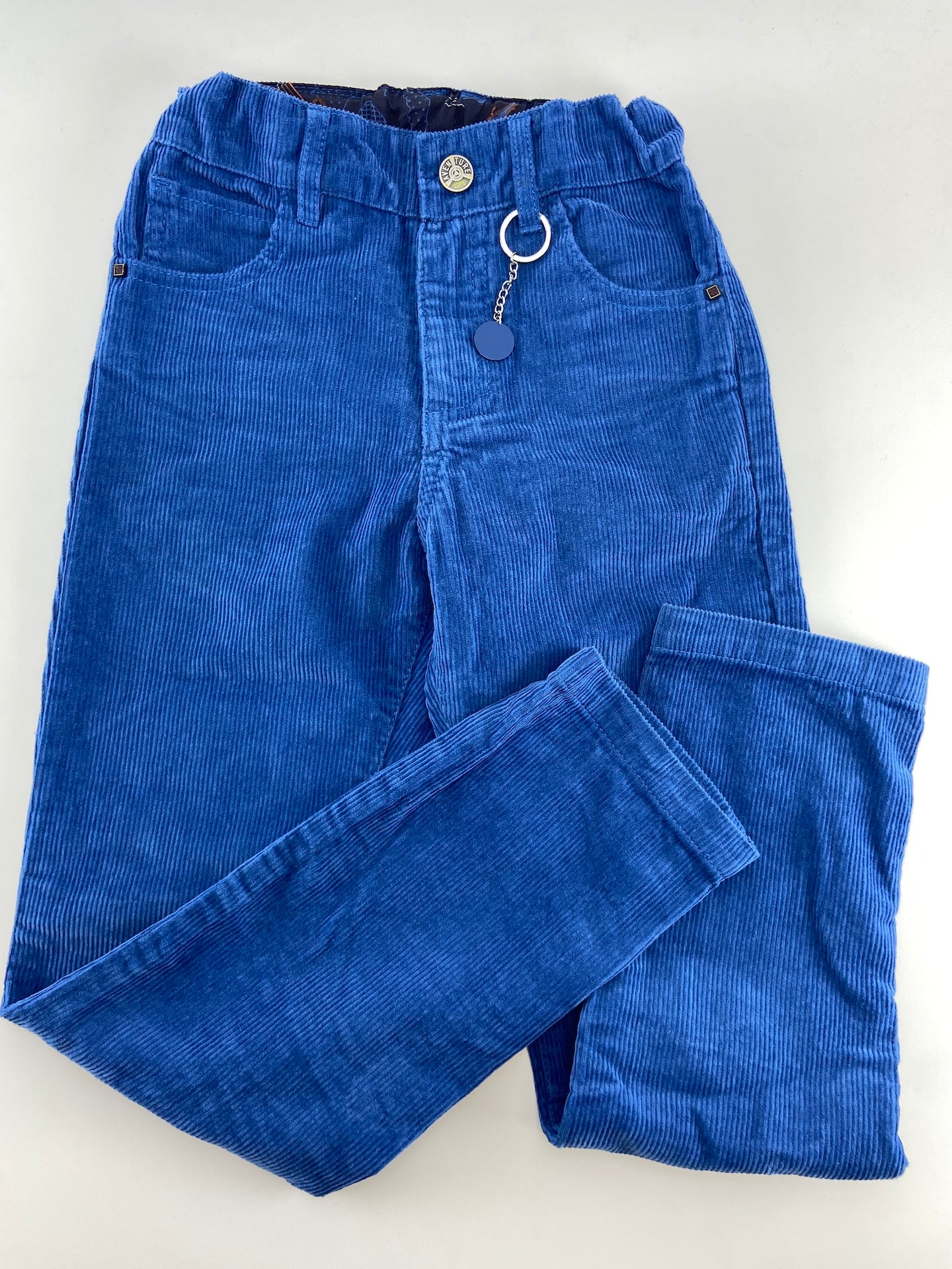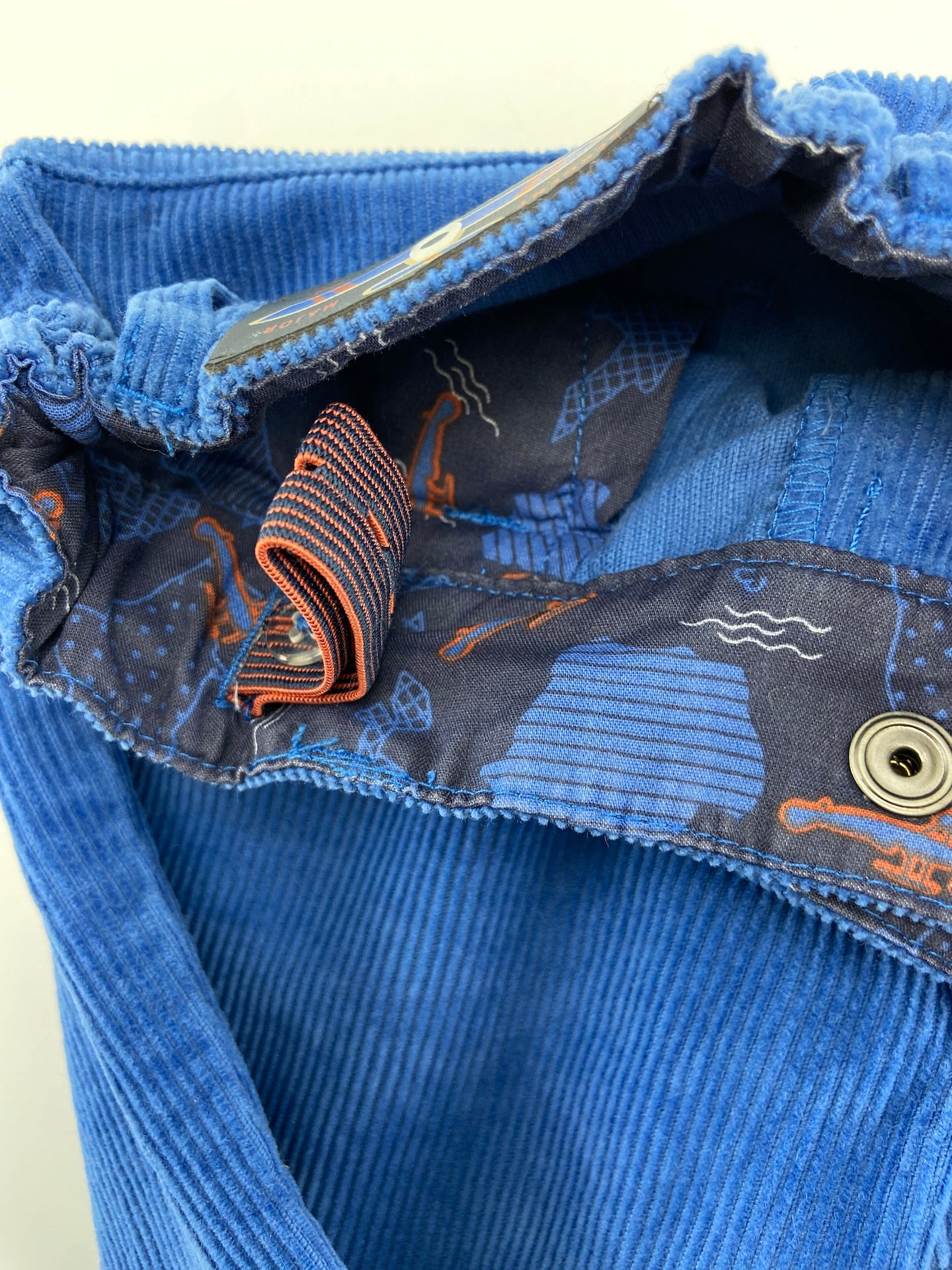 Calças em veludo cotelê com bolsos e elástico de ajuste na cintura. Traz um porta chaves.