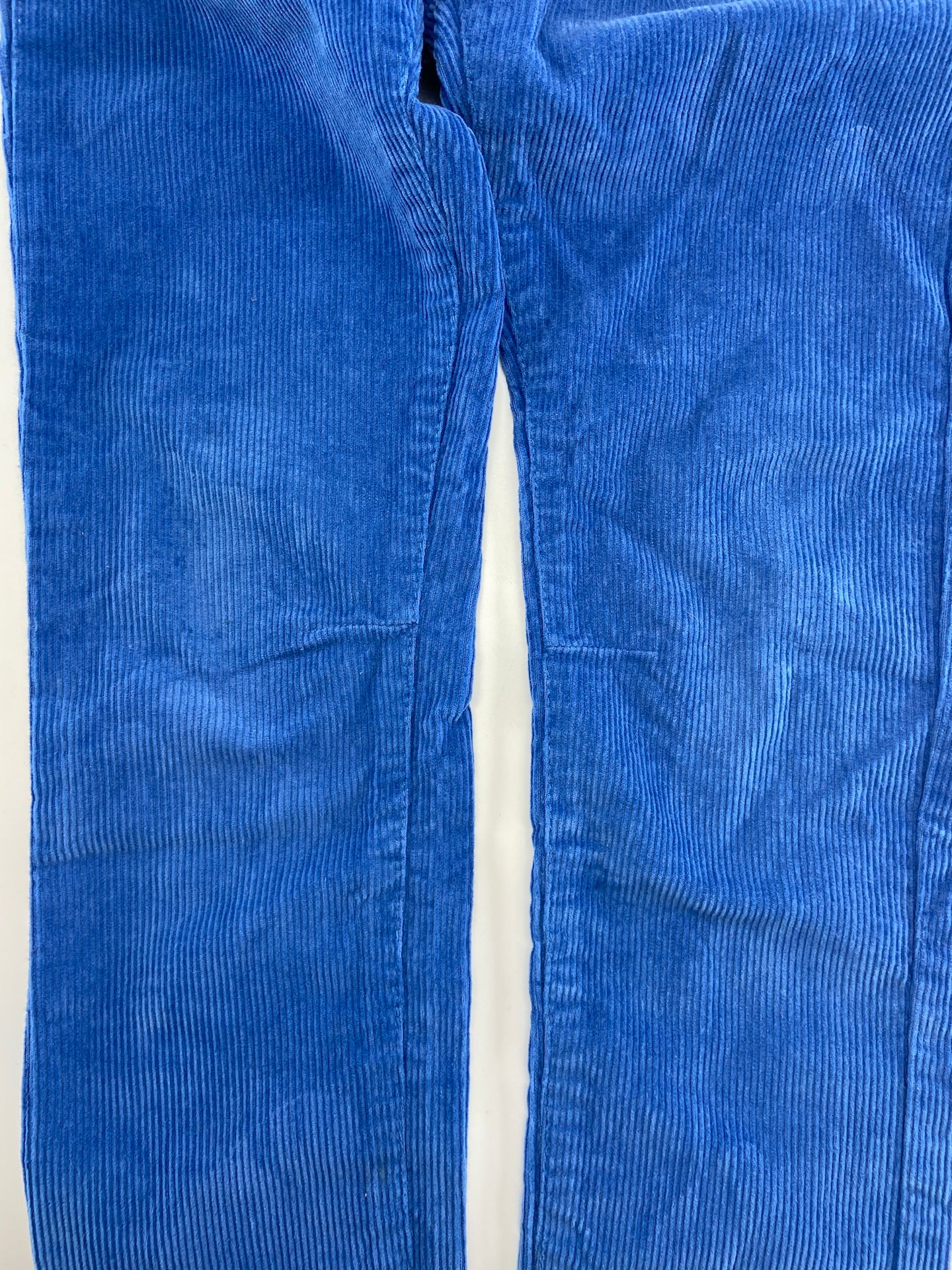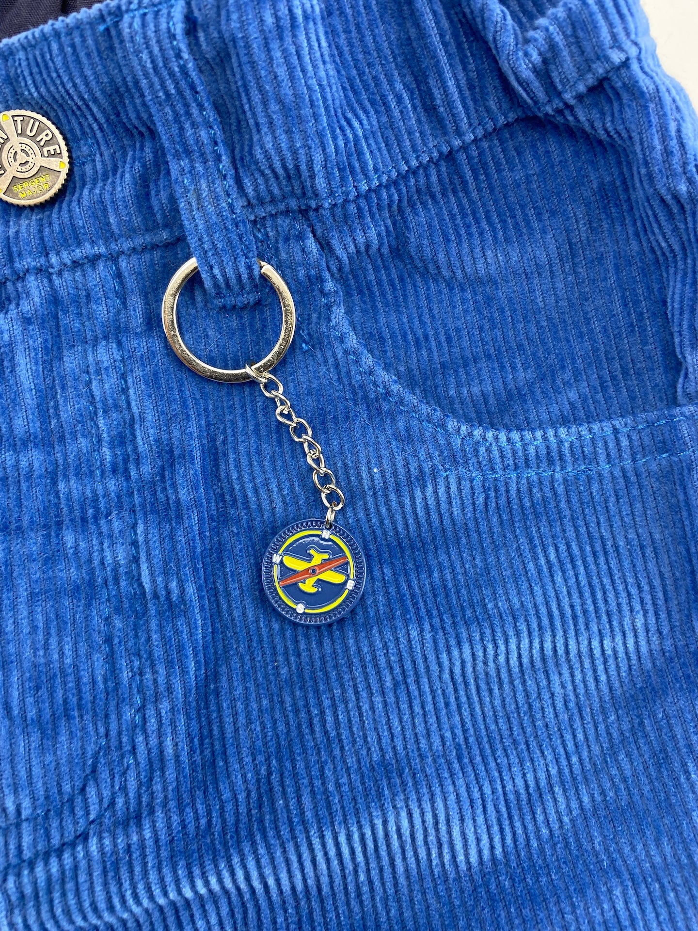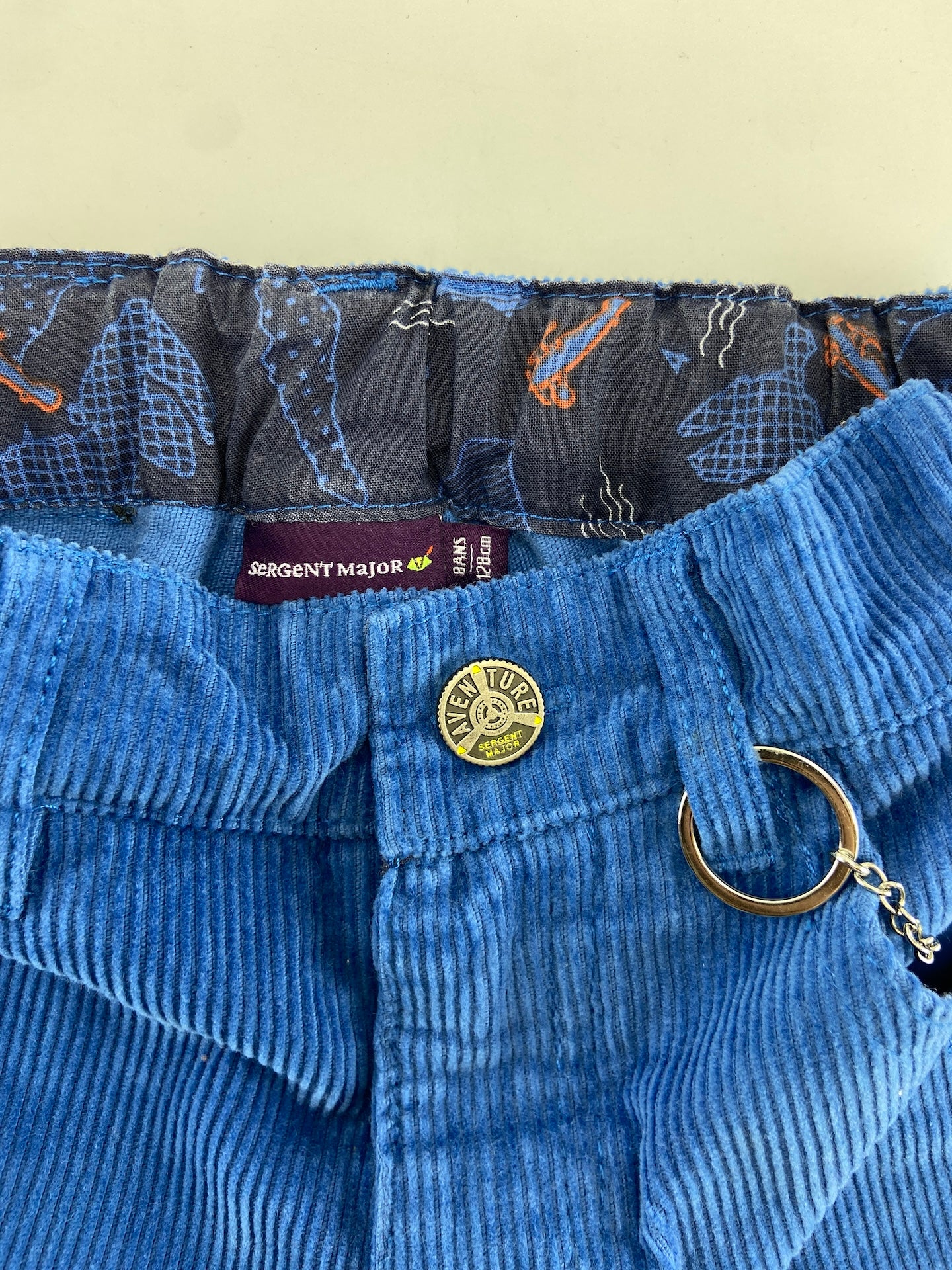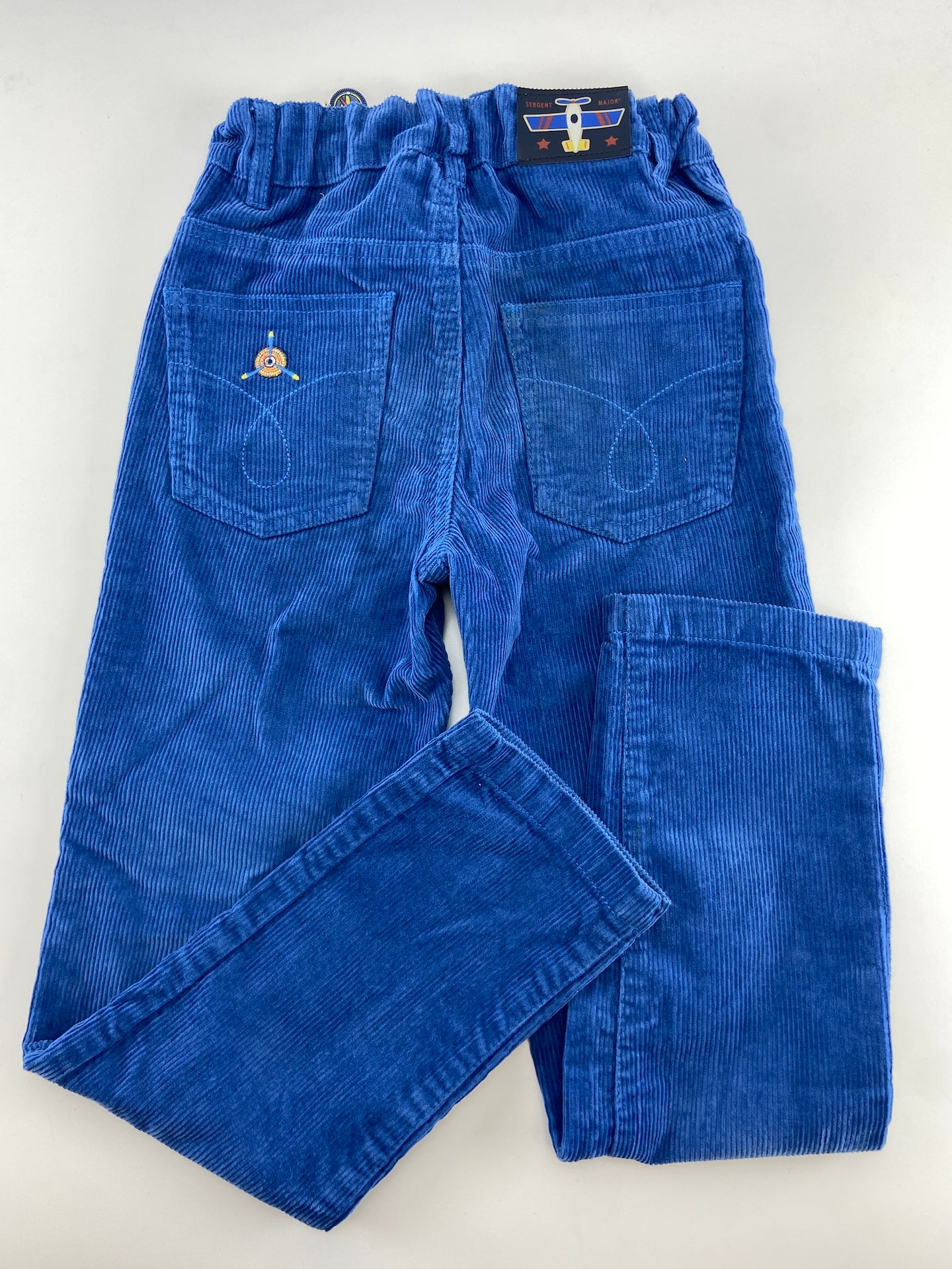 Calças em veludo cotelê com bolsos e elástico de ajuste na cintura. Traz um porta chaves.