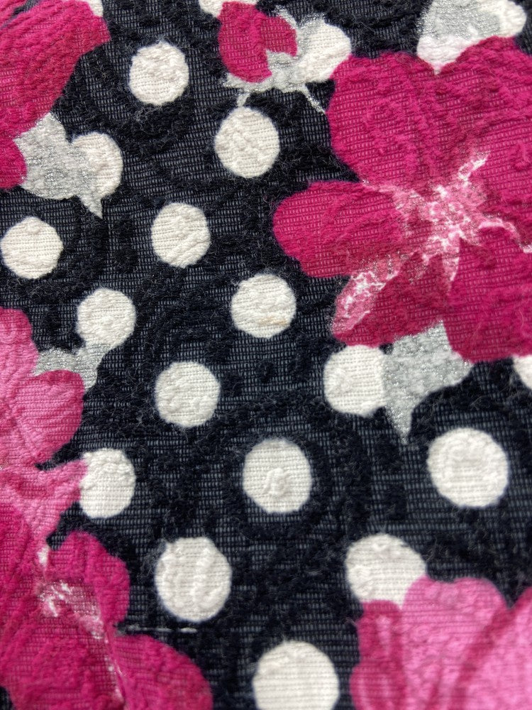 Vestido com saia rodada, forrado, com fecho atrás, com estampado de bolinhas e flores. Tem cinto autónomo fino tipo pele.