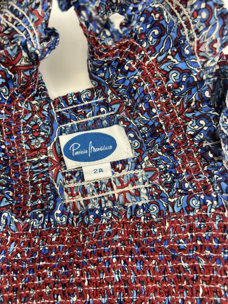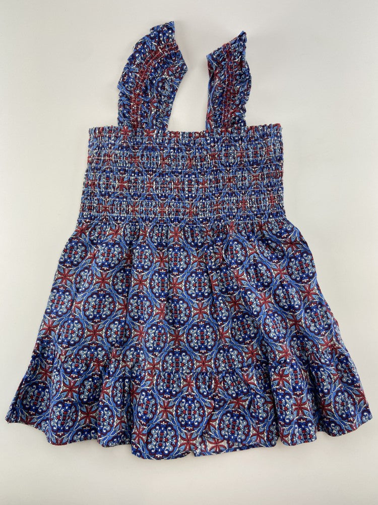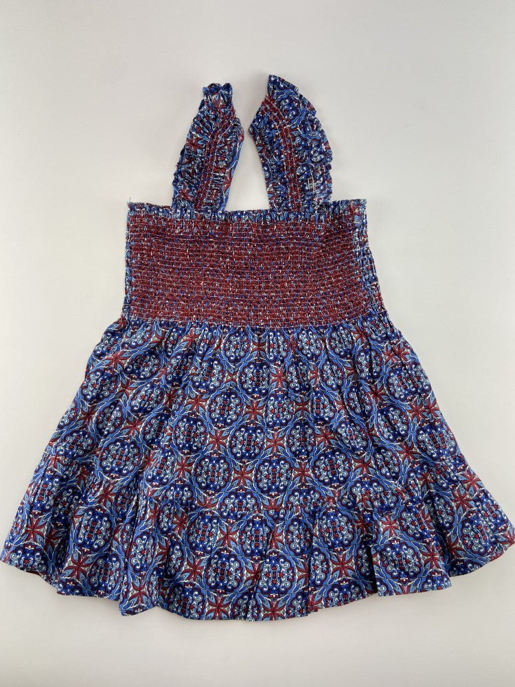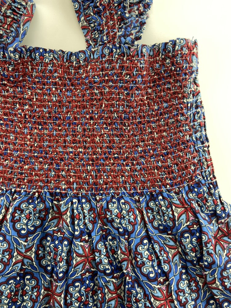 Vestido de alças com ponto de elástico no peito. Com padrão geométrico e folho na bainha.