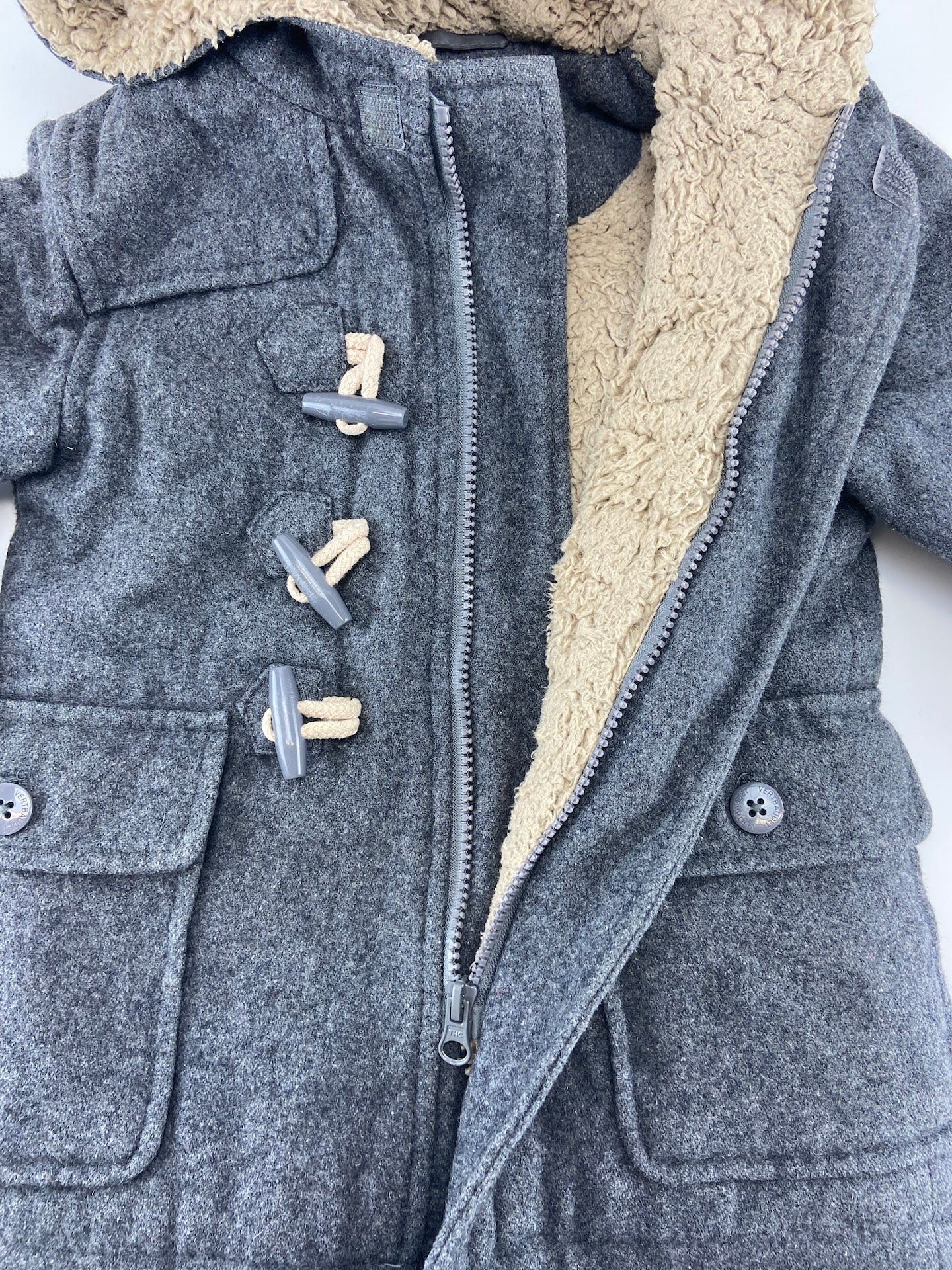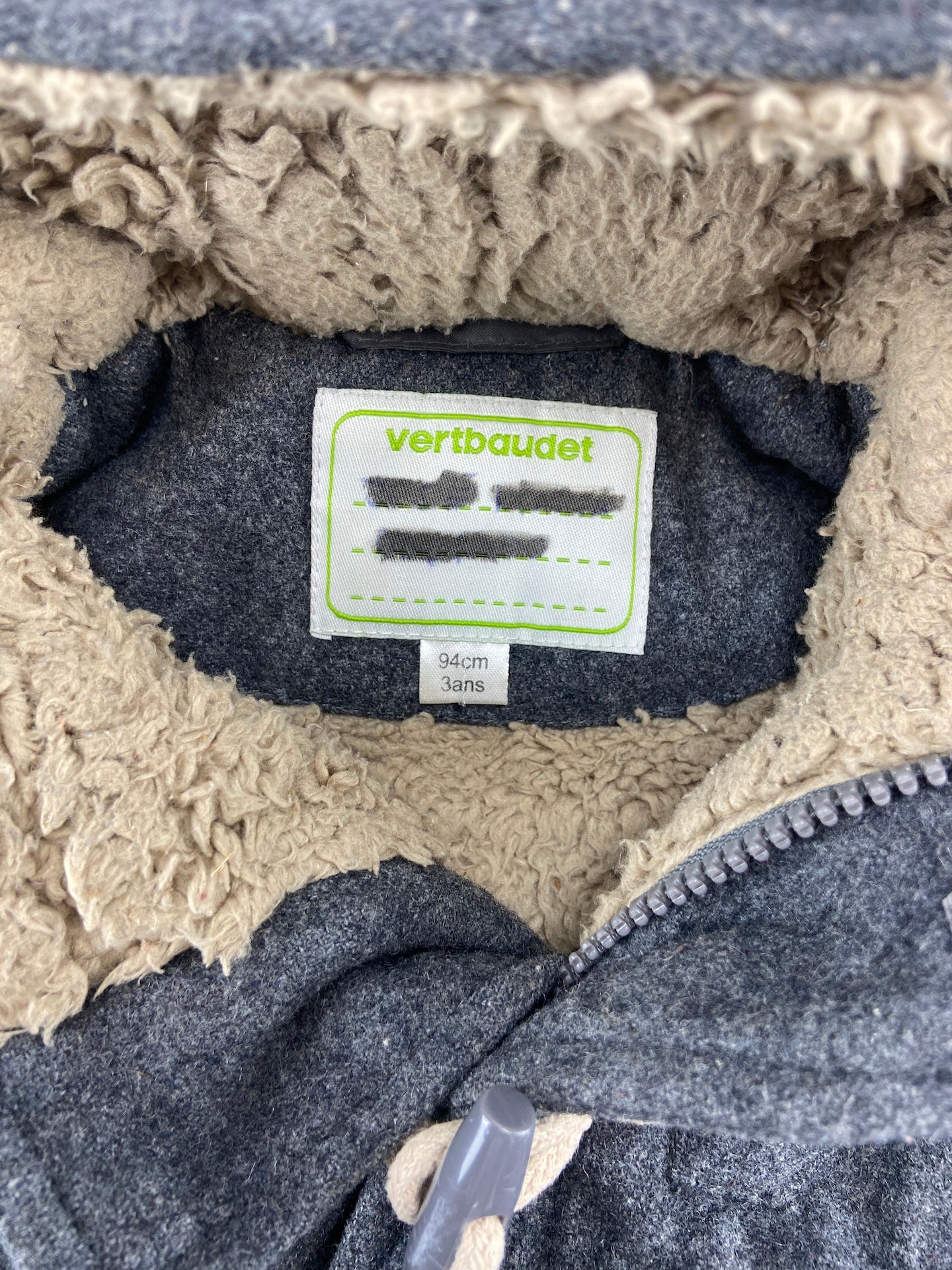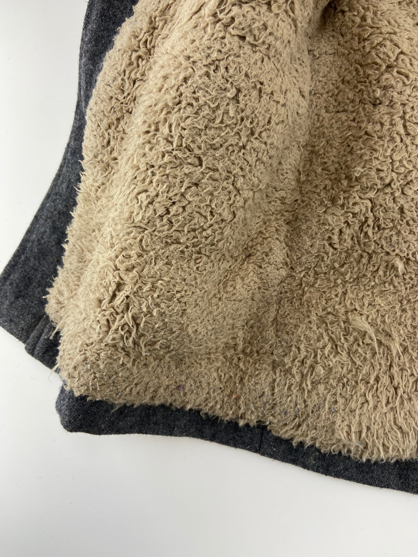 Casaco de abafo de fazenda forrado com pêlo. Com fecho e botões.