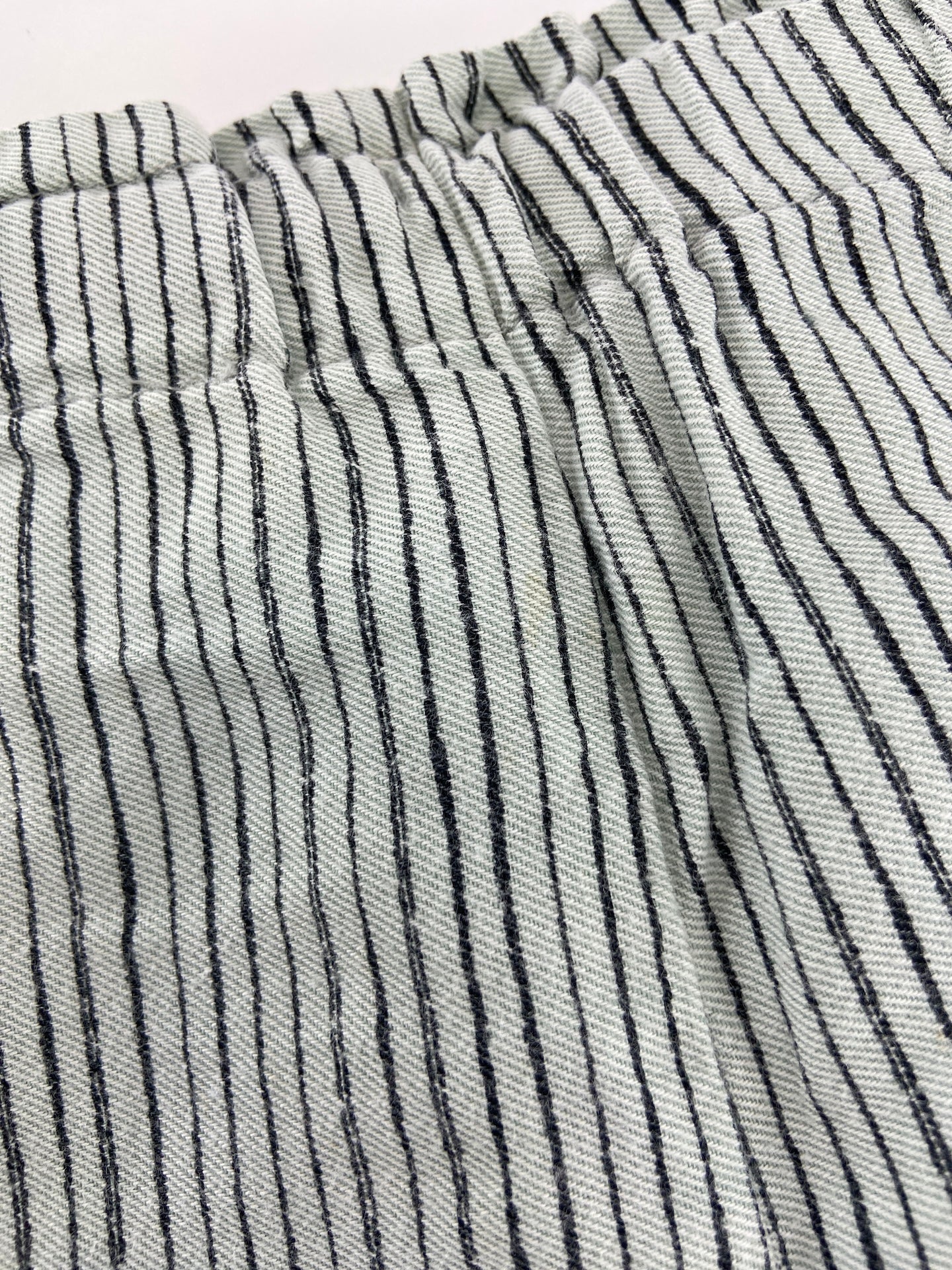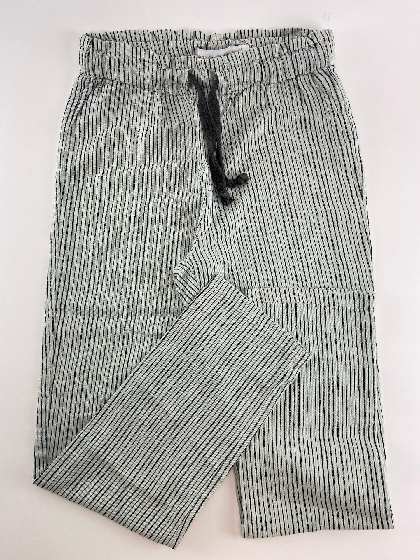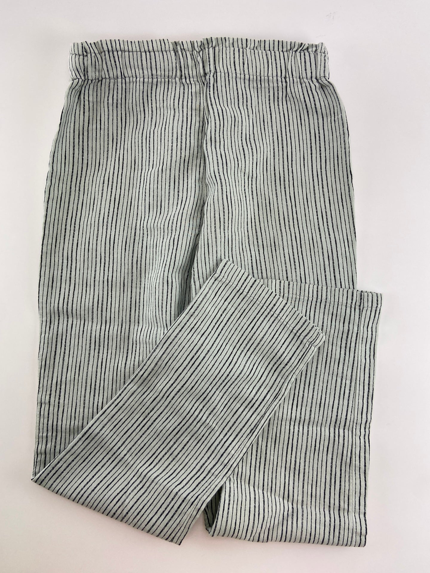 Calças em vaiela com cintura de elástico e padrão de riscas.