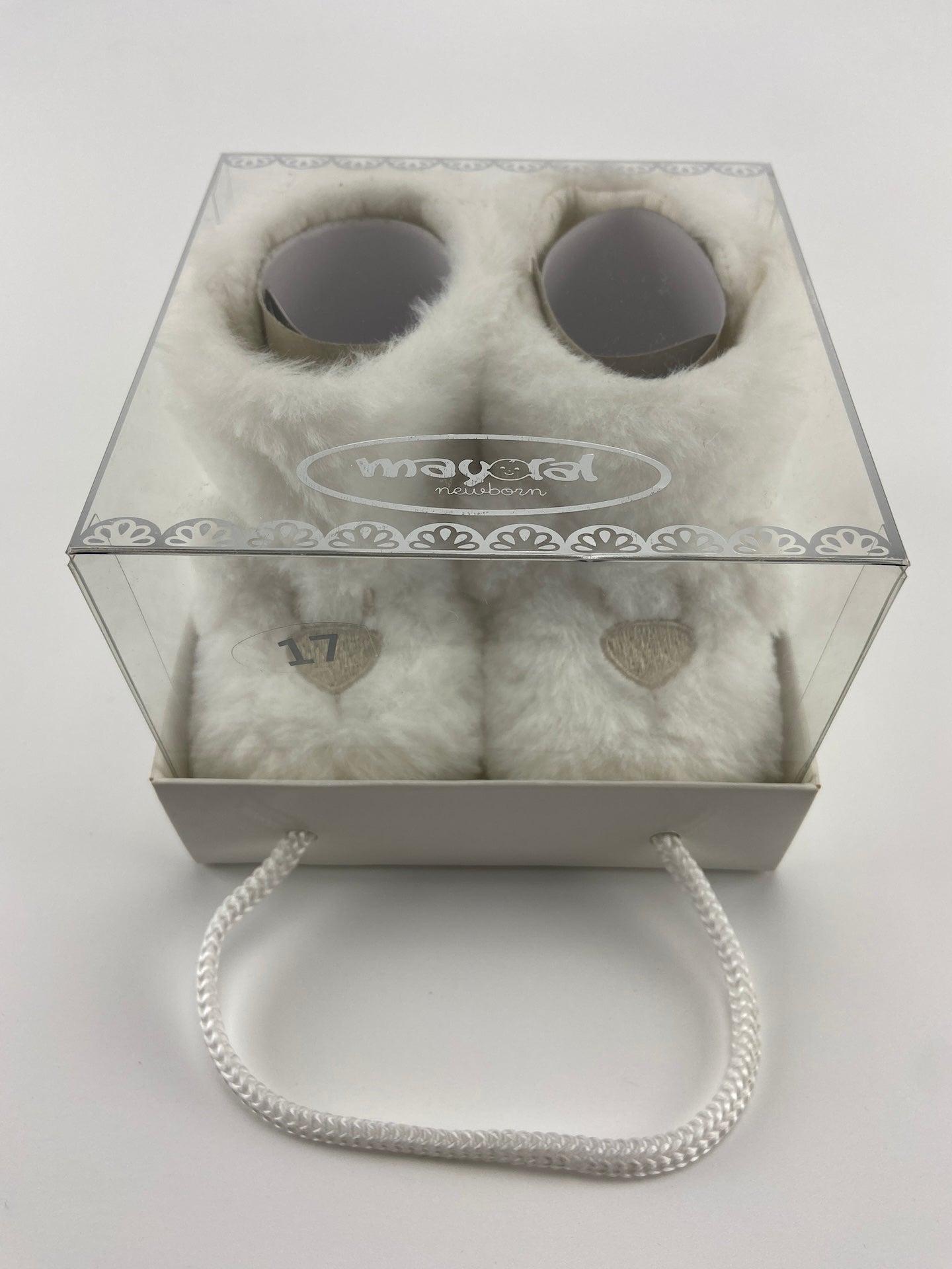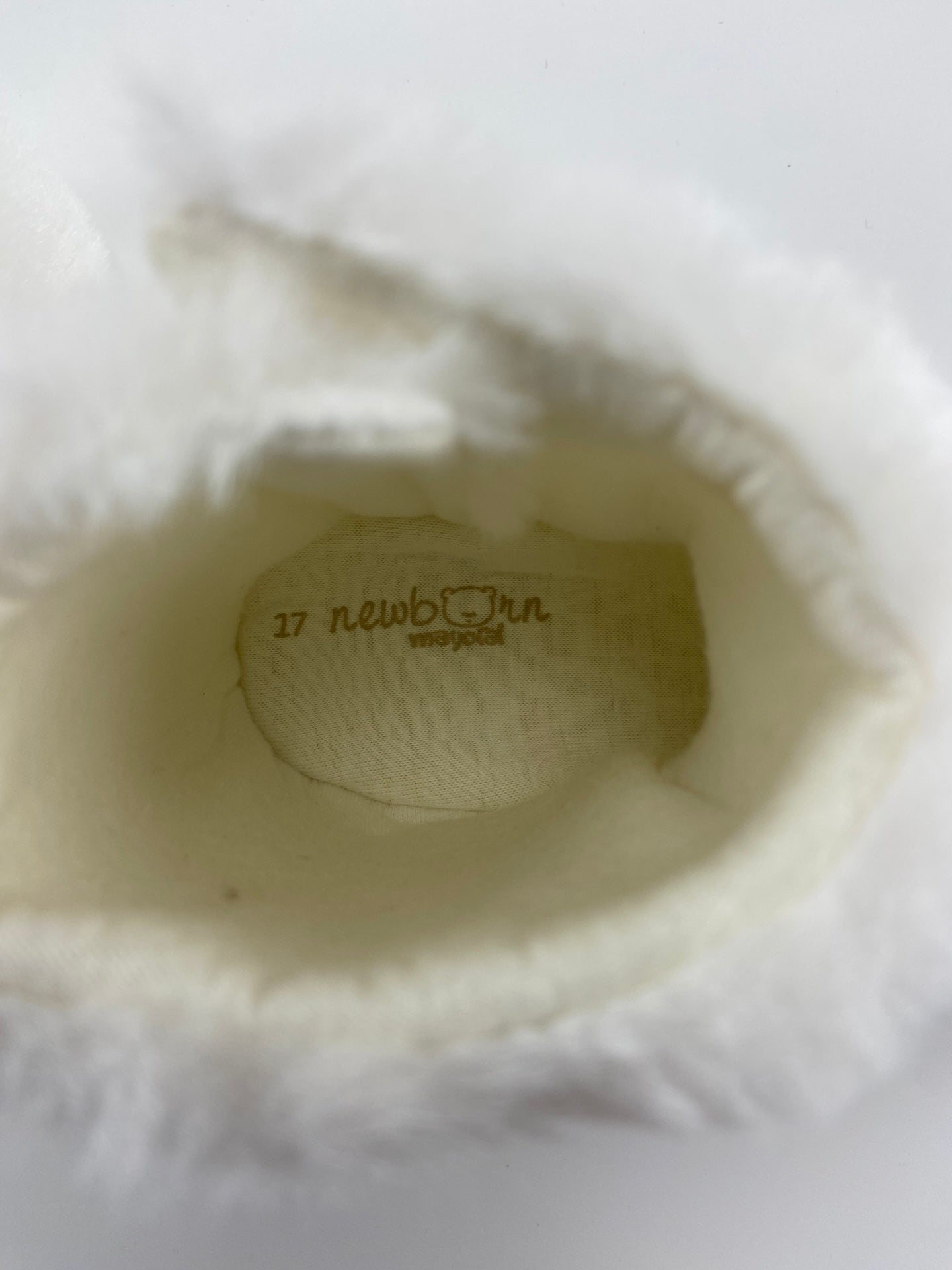 Botas de pêlo com cara de urso bordado. Fecho de velcro.