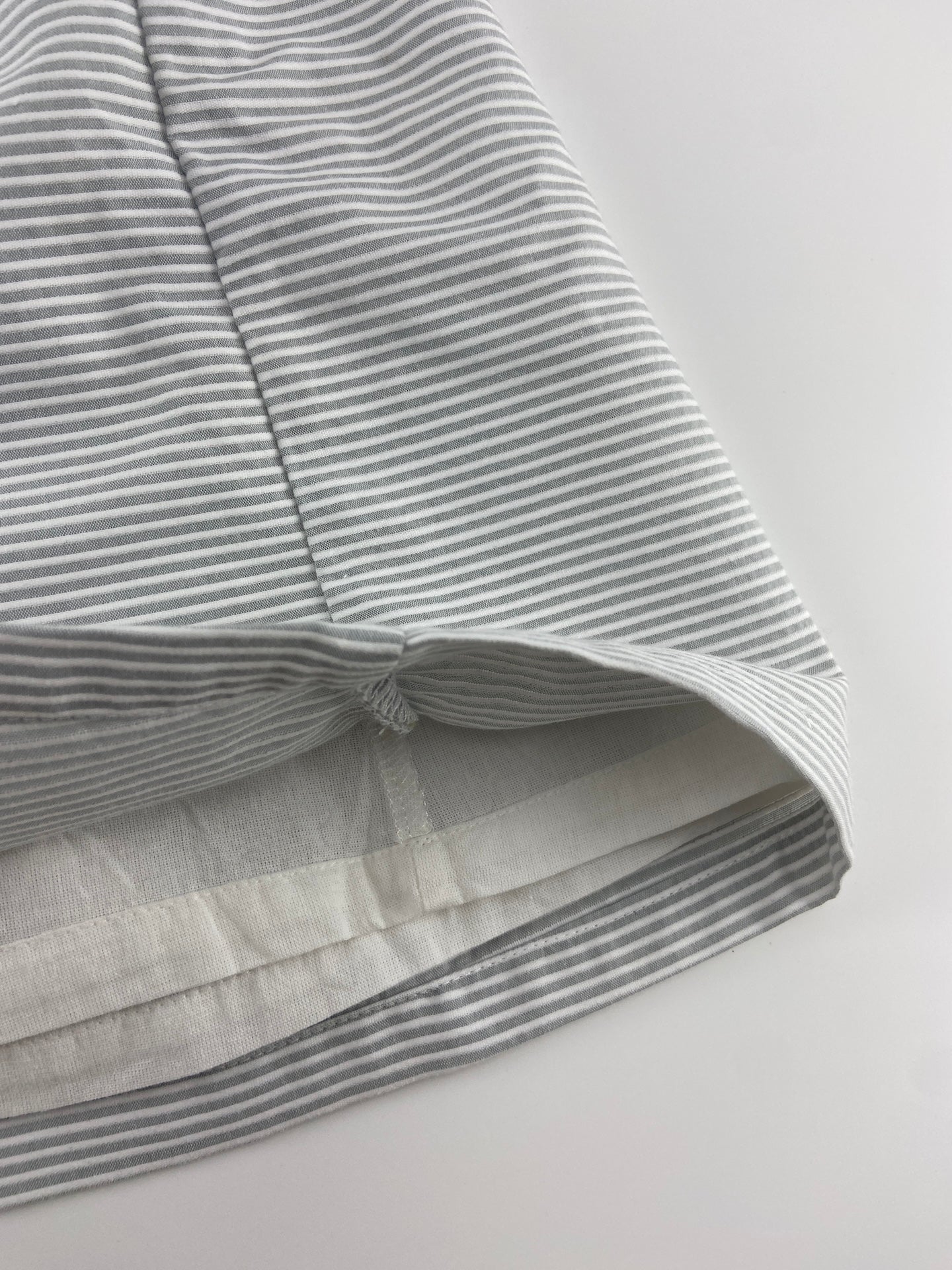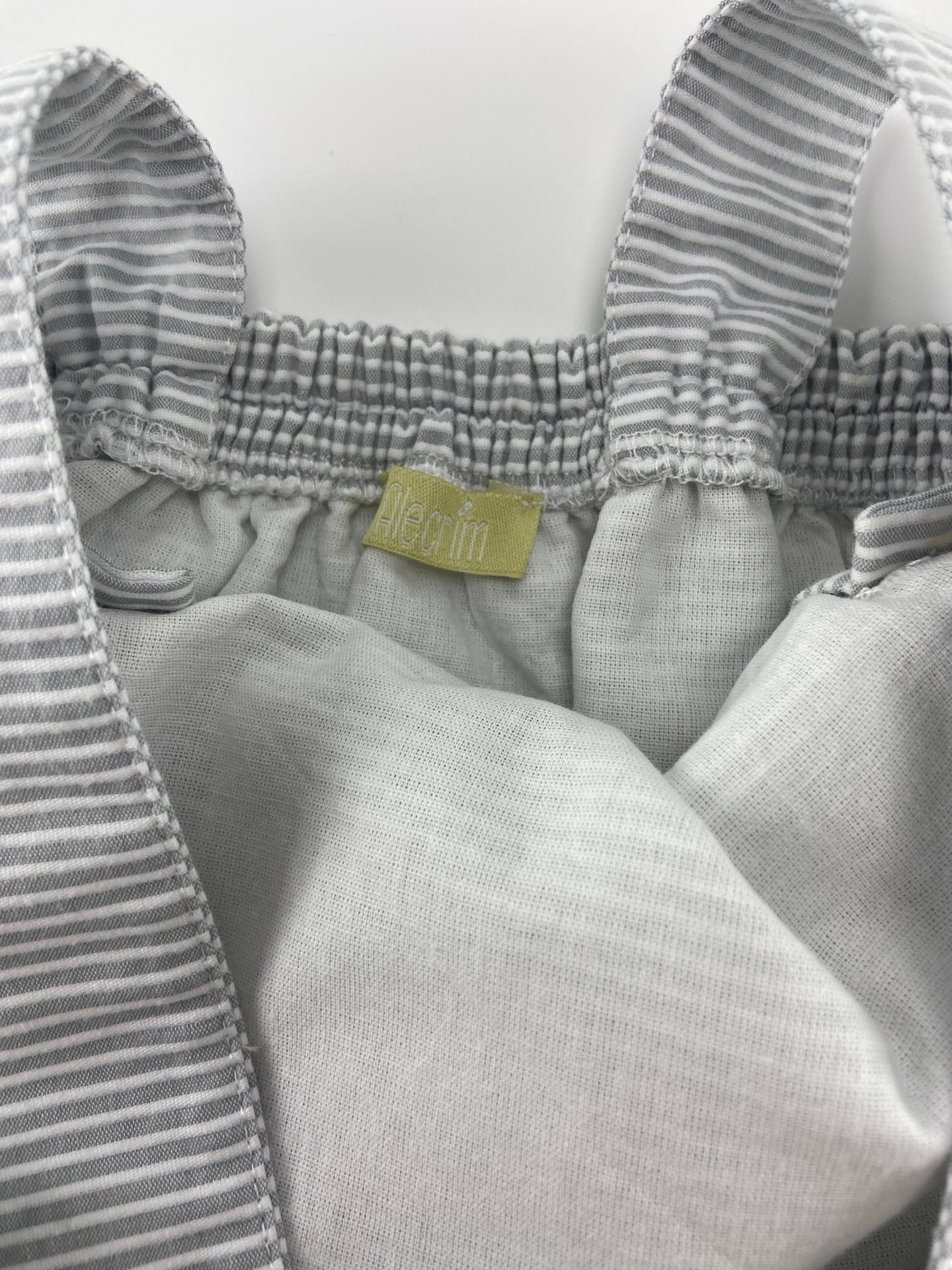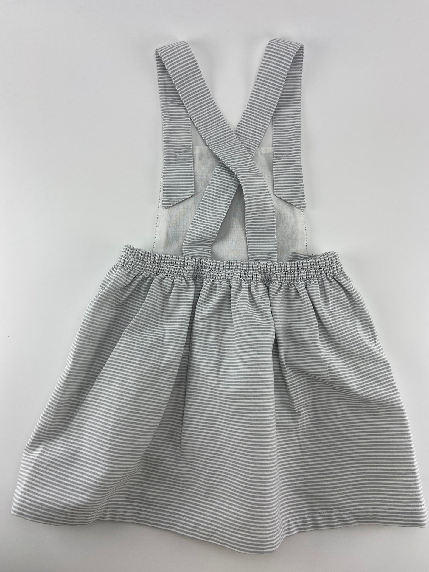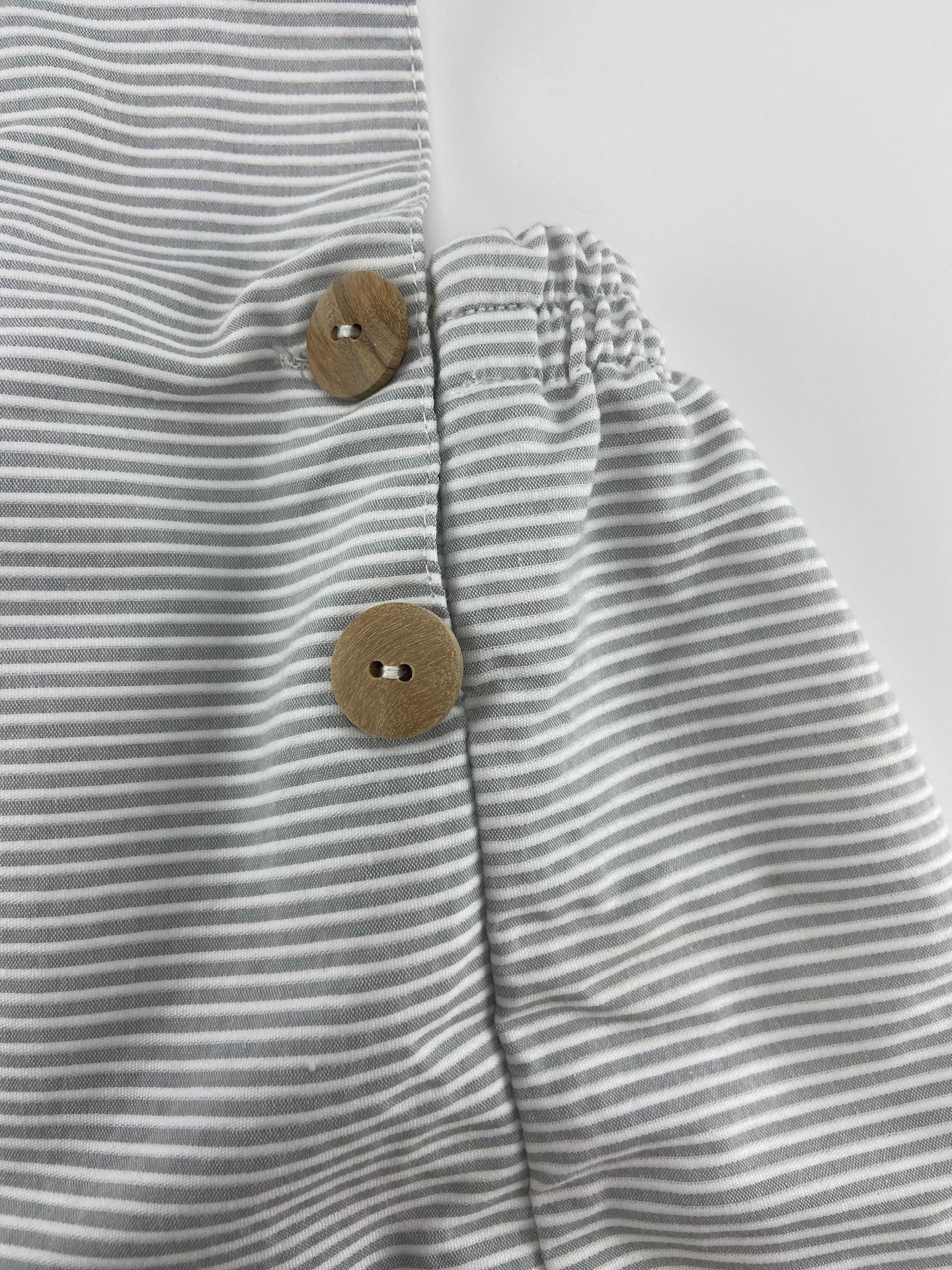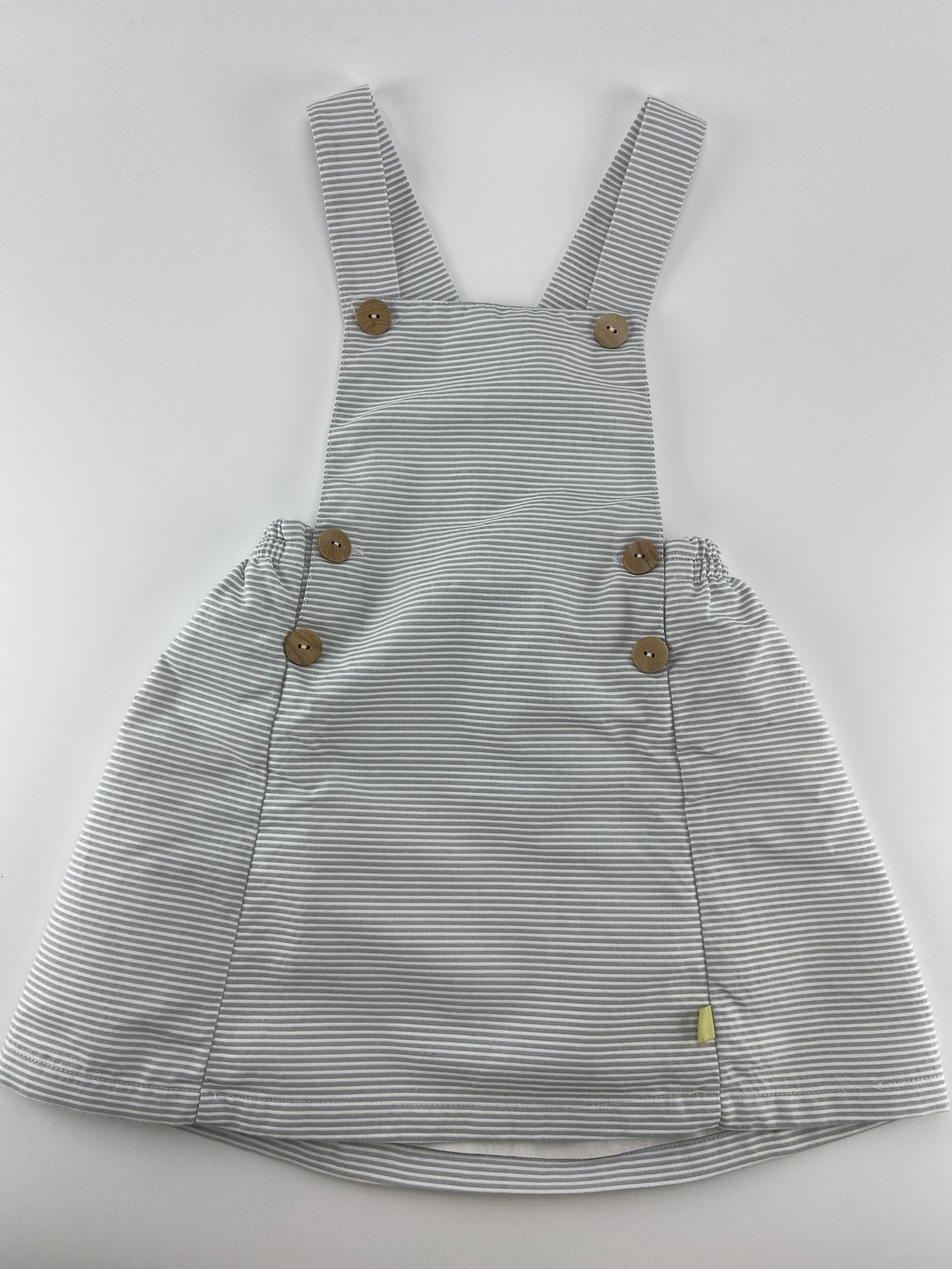 Saia de peitilho de tecido com textura riscada e botões de madeira.