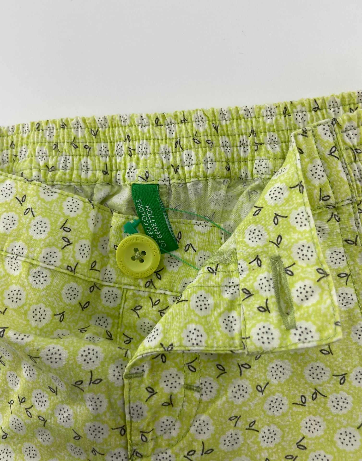 Calções com flores estampadas e elástico ajustável nas pernas.